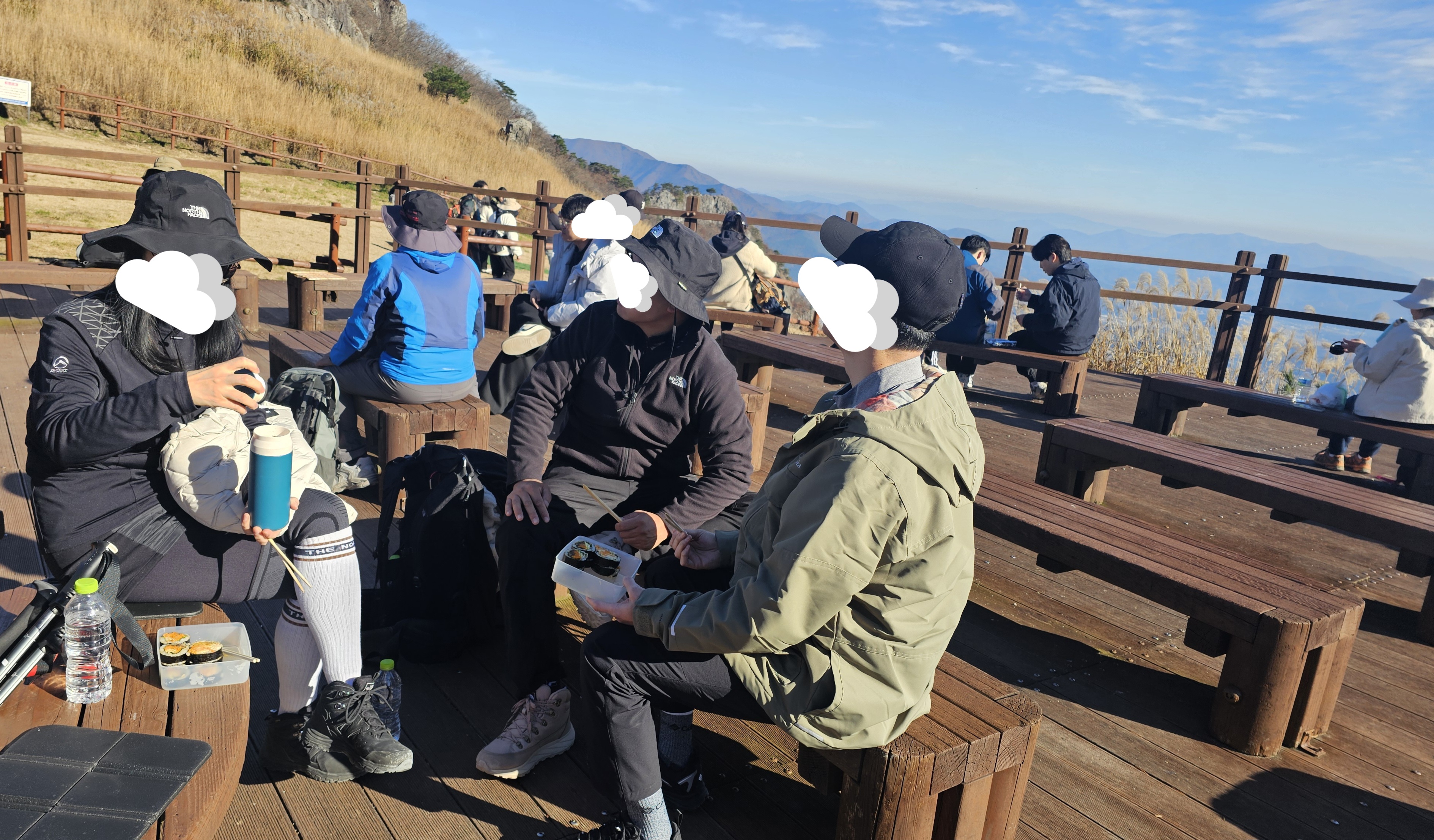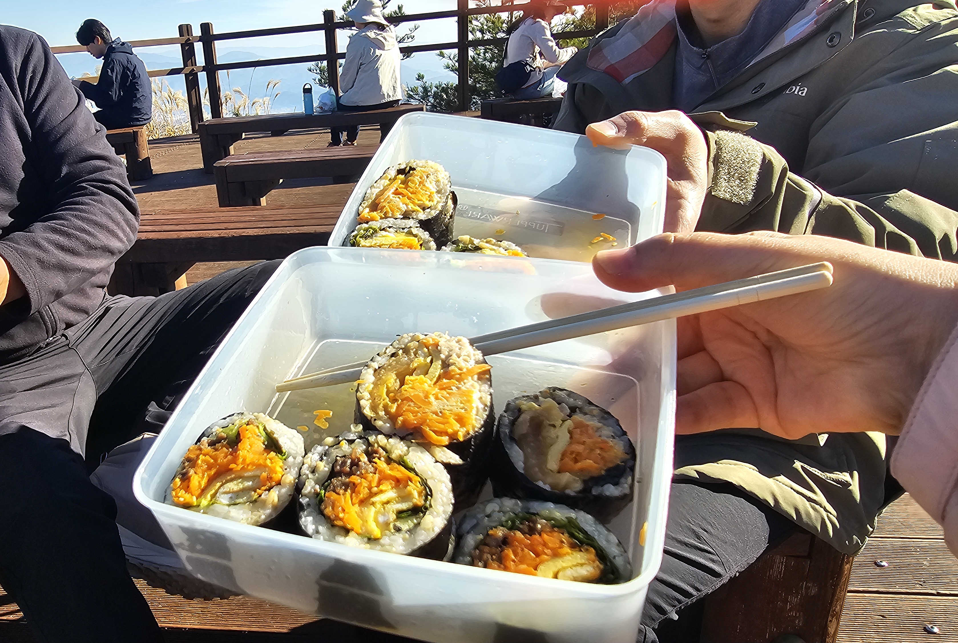 정상에서 잠시 쉬며 동생이 새벽에 정성껏 싸온 김밥을 꺼냈어요.