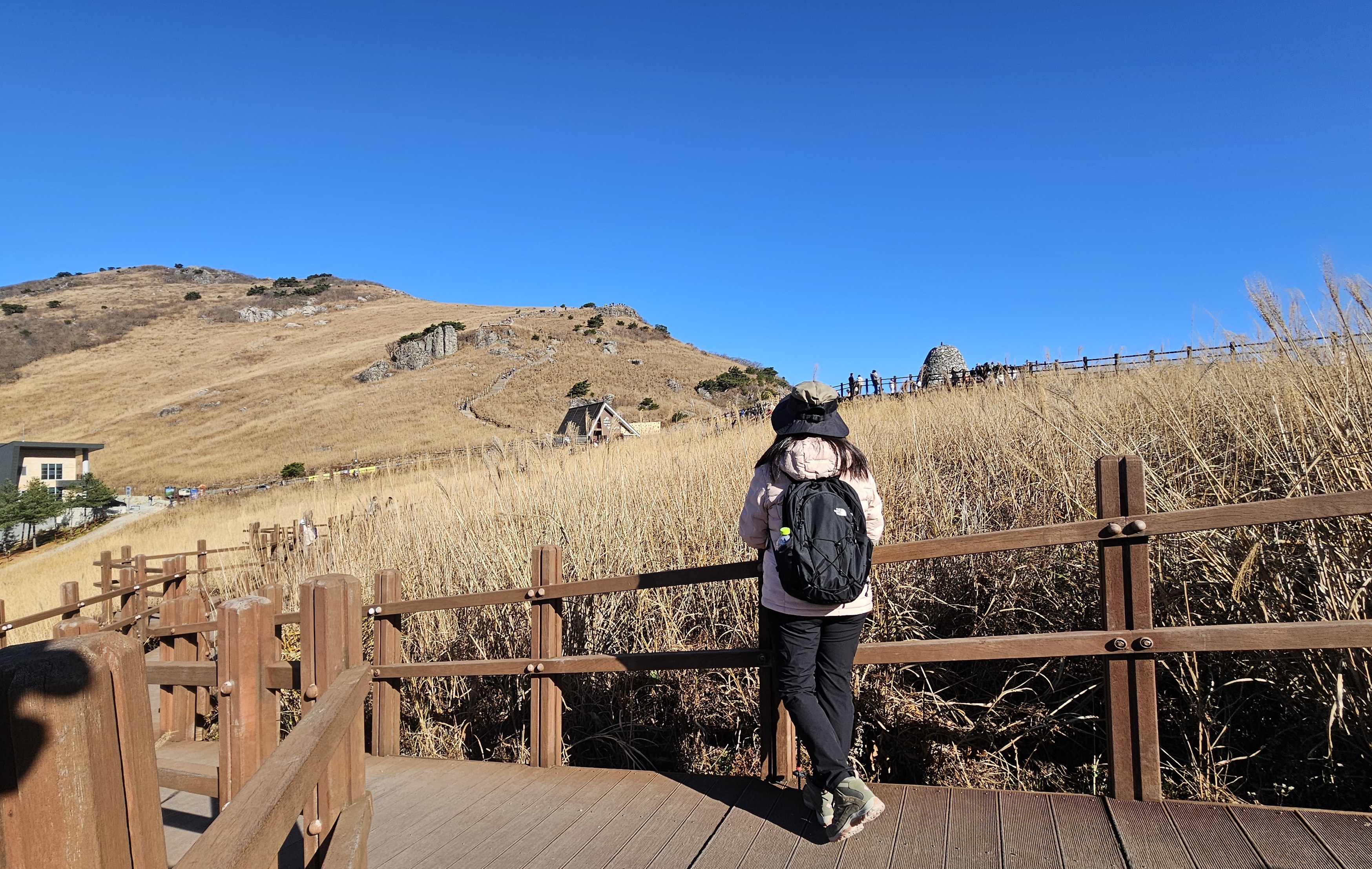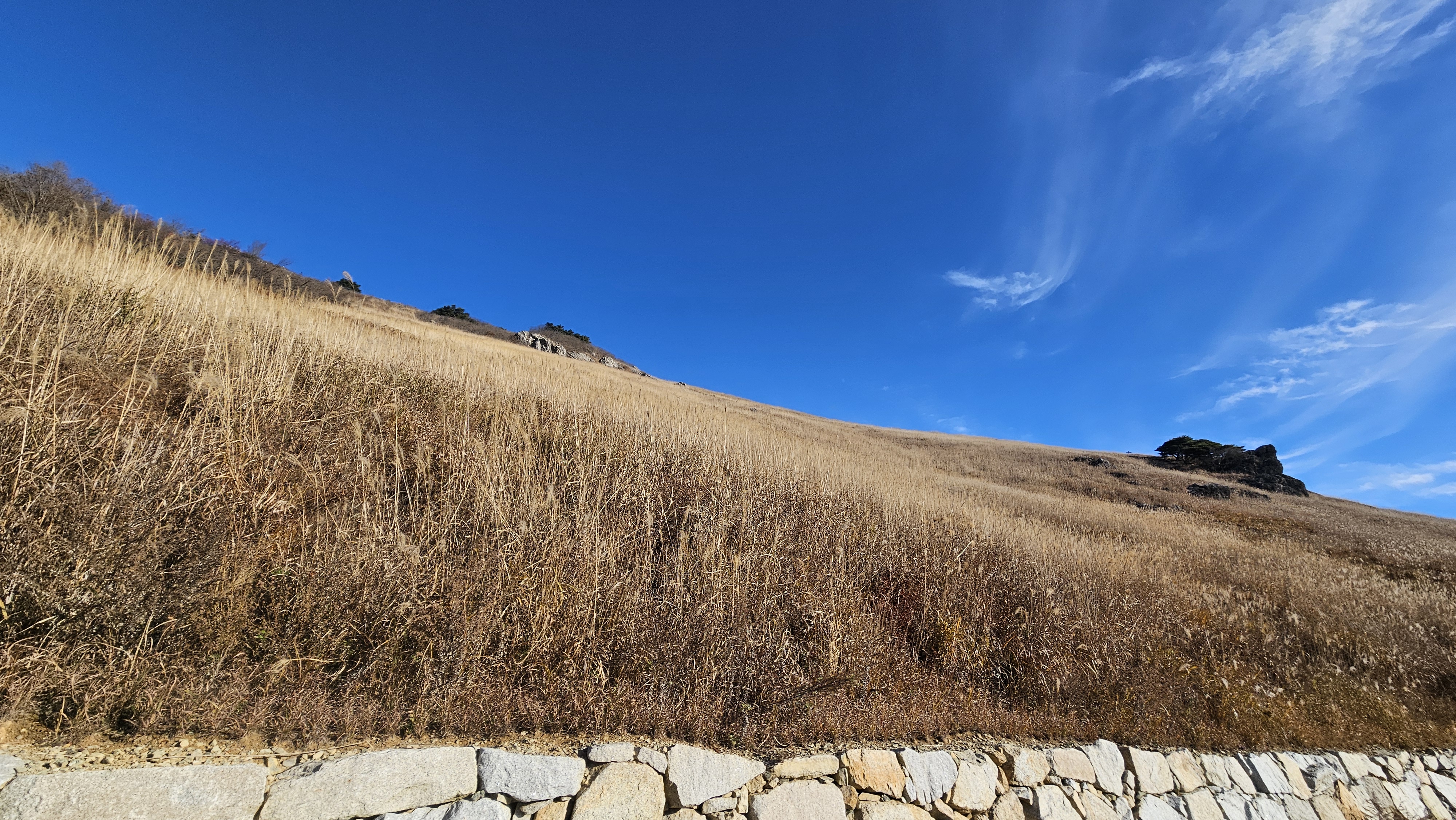 정상에 도착하자마자 펼쳐진 억새밭에 입이 떡 벌어졌어요. 황금빛 억새가 능선을 따라 출렁이는 모습은 정말 장관이었어요. 햇살에 반짝이는 억새는 마치 자연이 만든 파도 같았답니다.