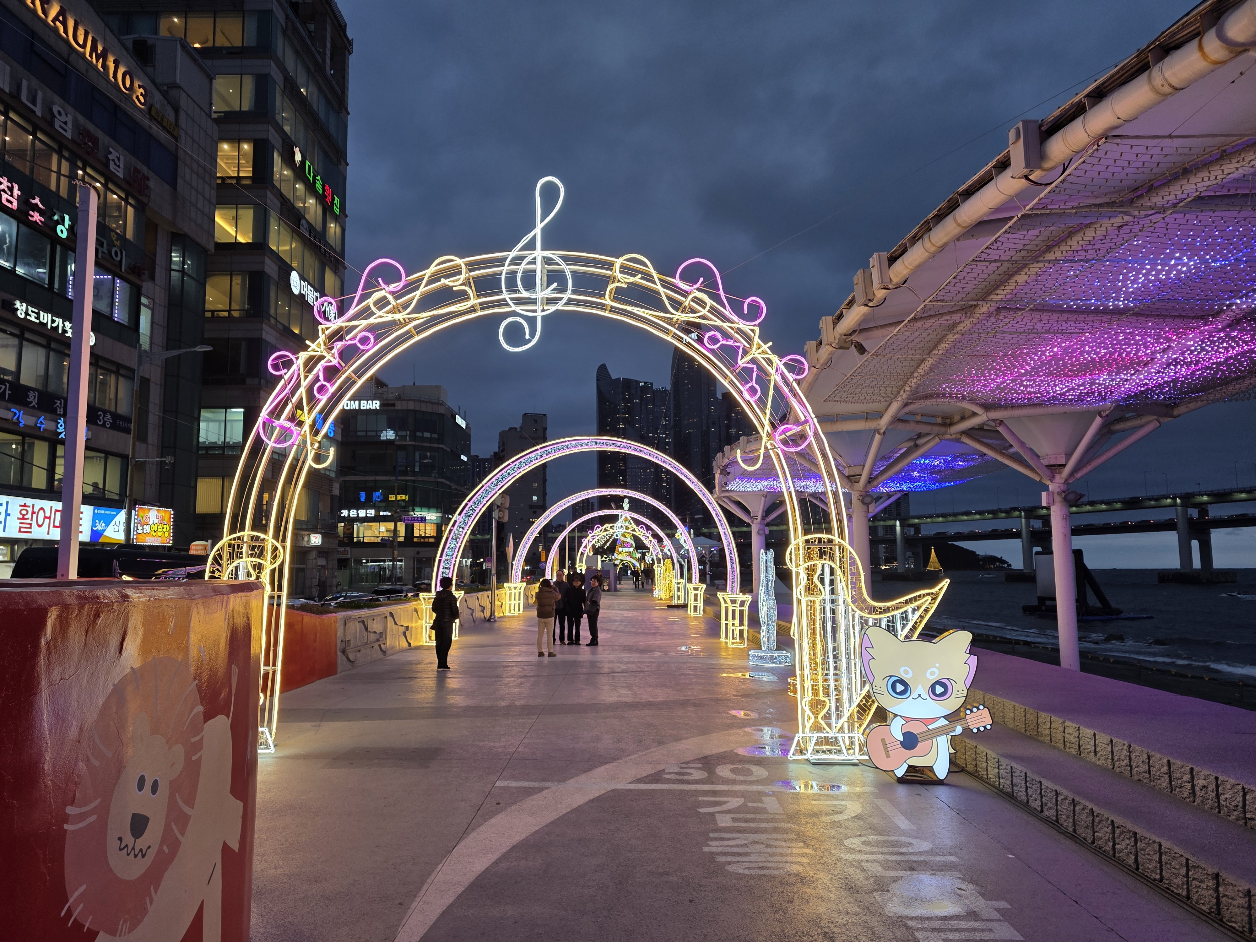 식사를 마치고 그냥 집에 가기엔 아쉬워서, 바로 근처에 있는 민락수변공원으로 산책을 나섰어요. 마침 요즘 광안리 빛축제가 한창이라, 겨울밤의 낭만을 제대로 느낄 수 있었답니다.