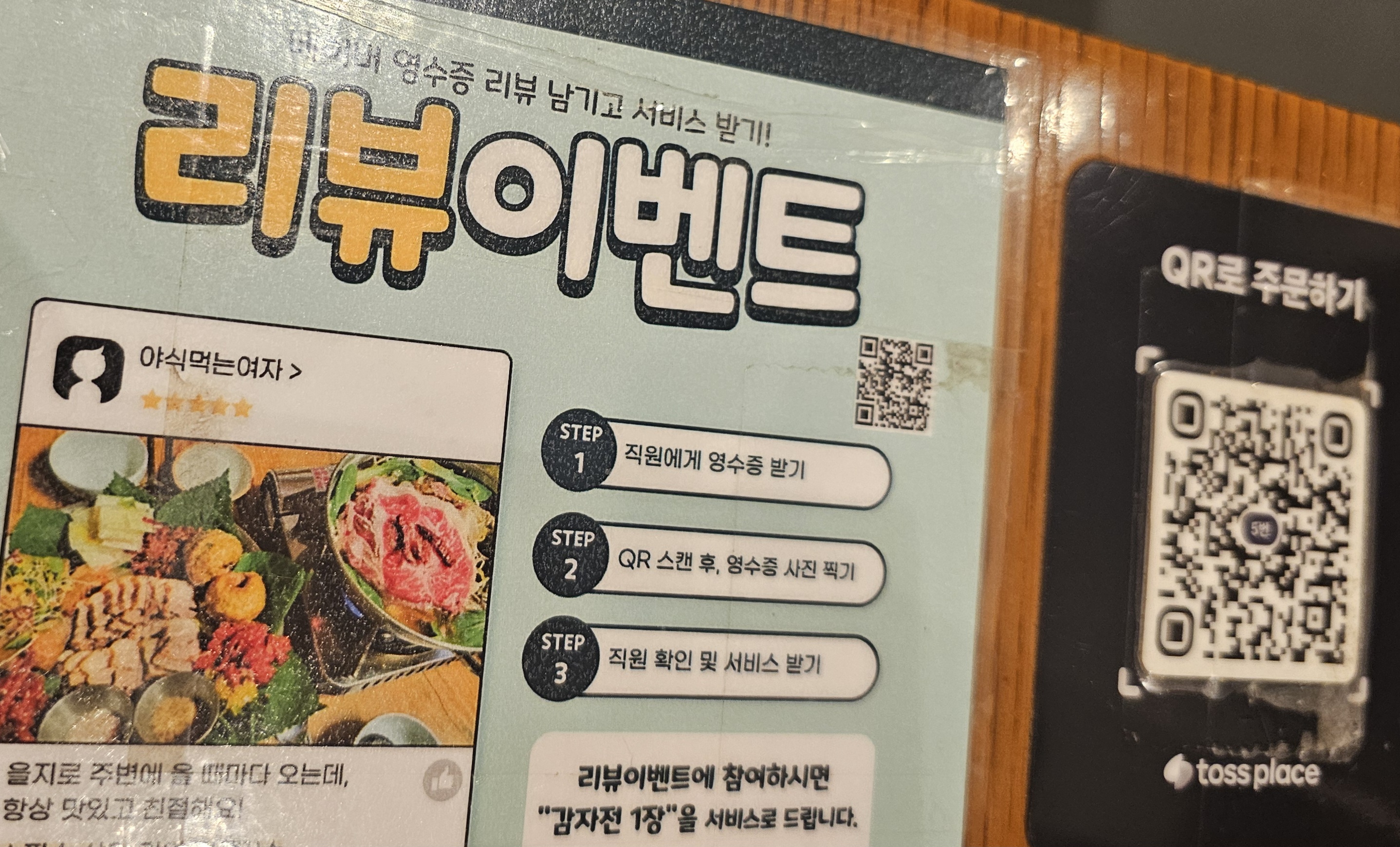 영수증에 있는 QR코드 찍고 간단한 리뷰 등록하면 감자전 서비스!