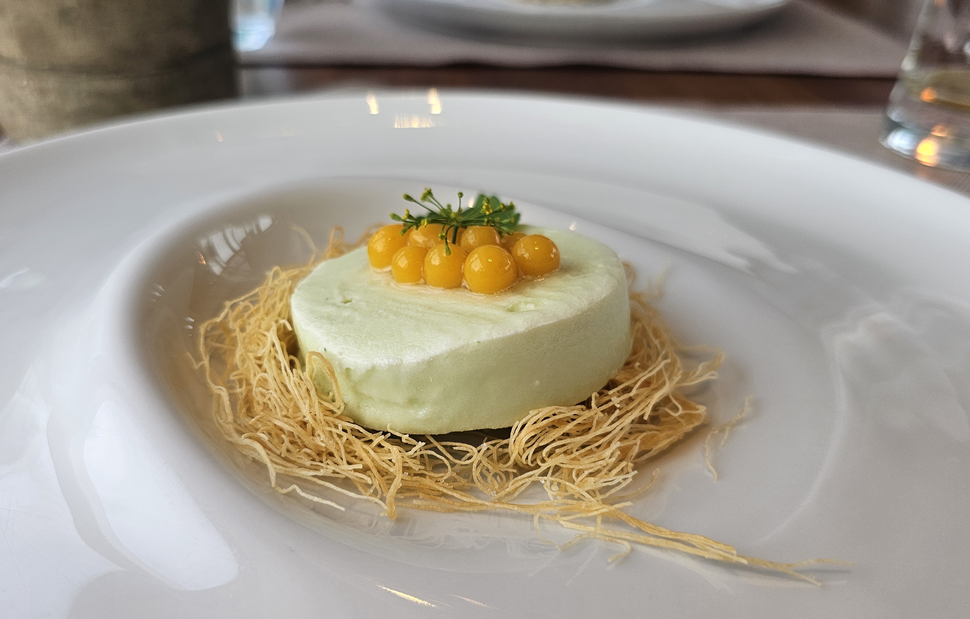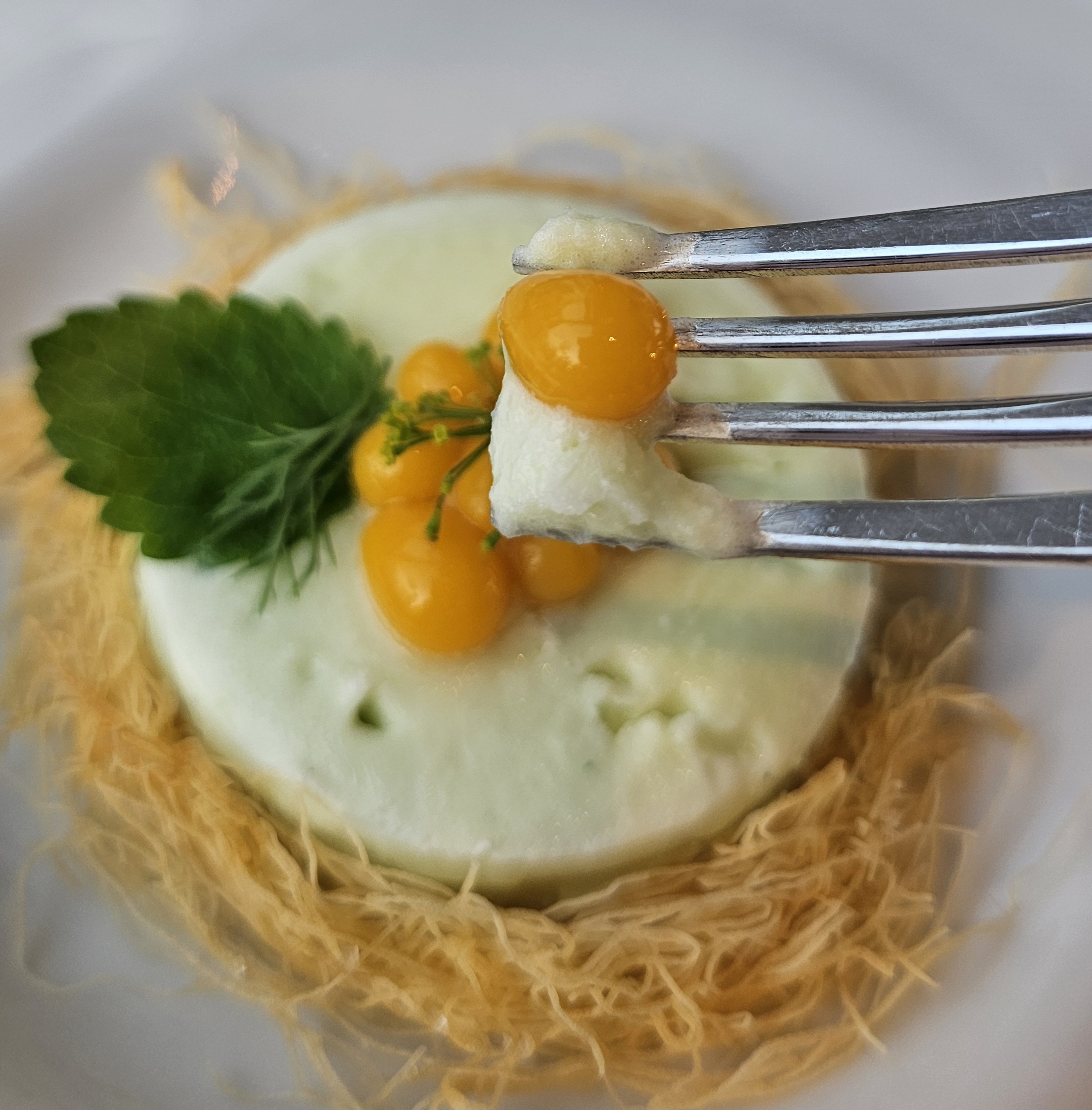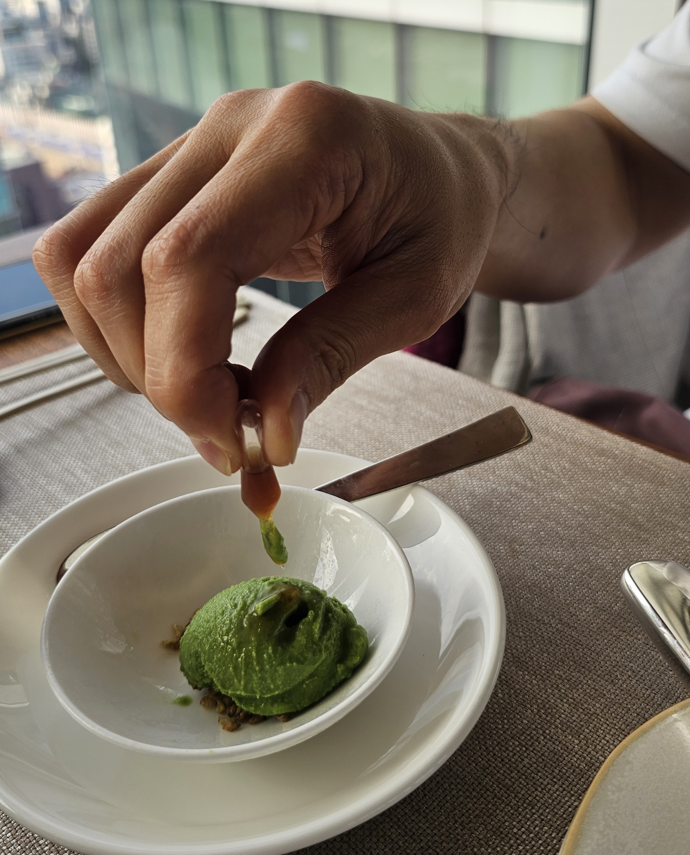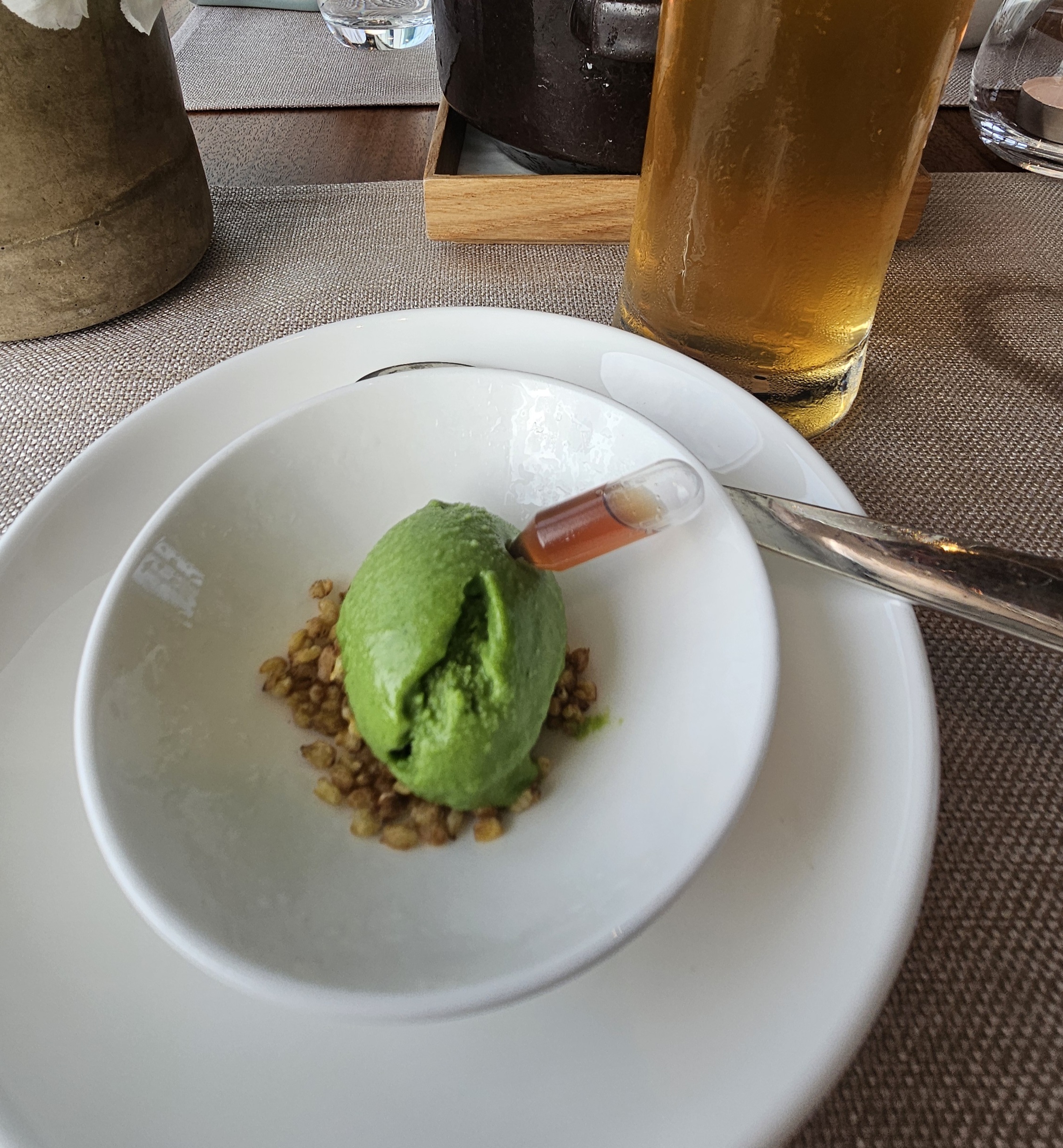 마지막 디저트는 초당 옥수수 에센스 + 참나물 아이스크림.