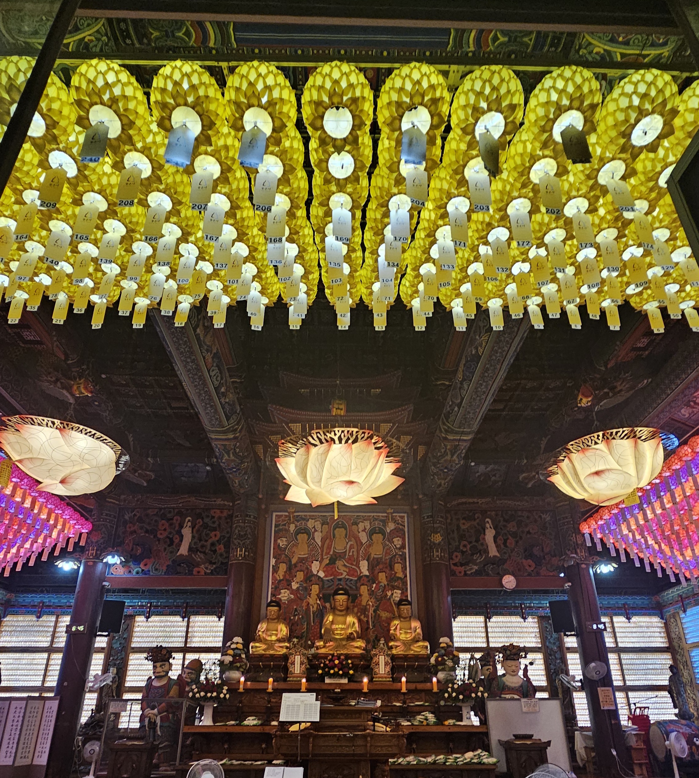 경내 전체에 연꽃 화분과 연등이 가득했어요.