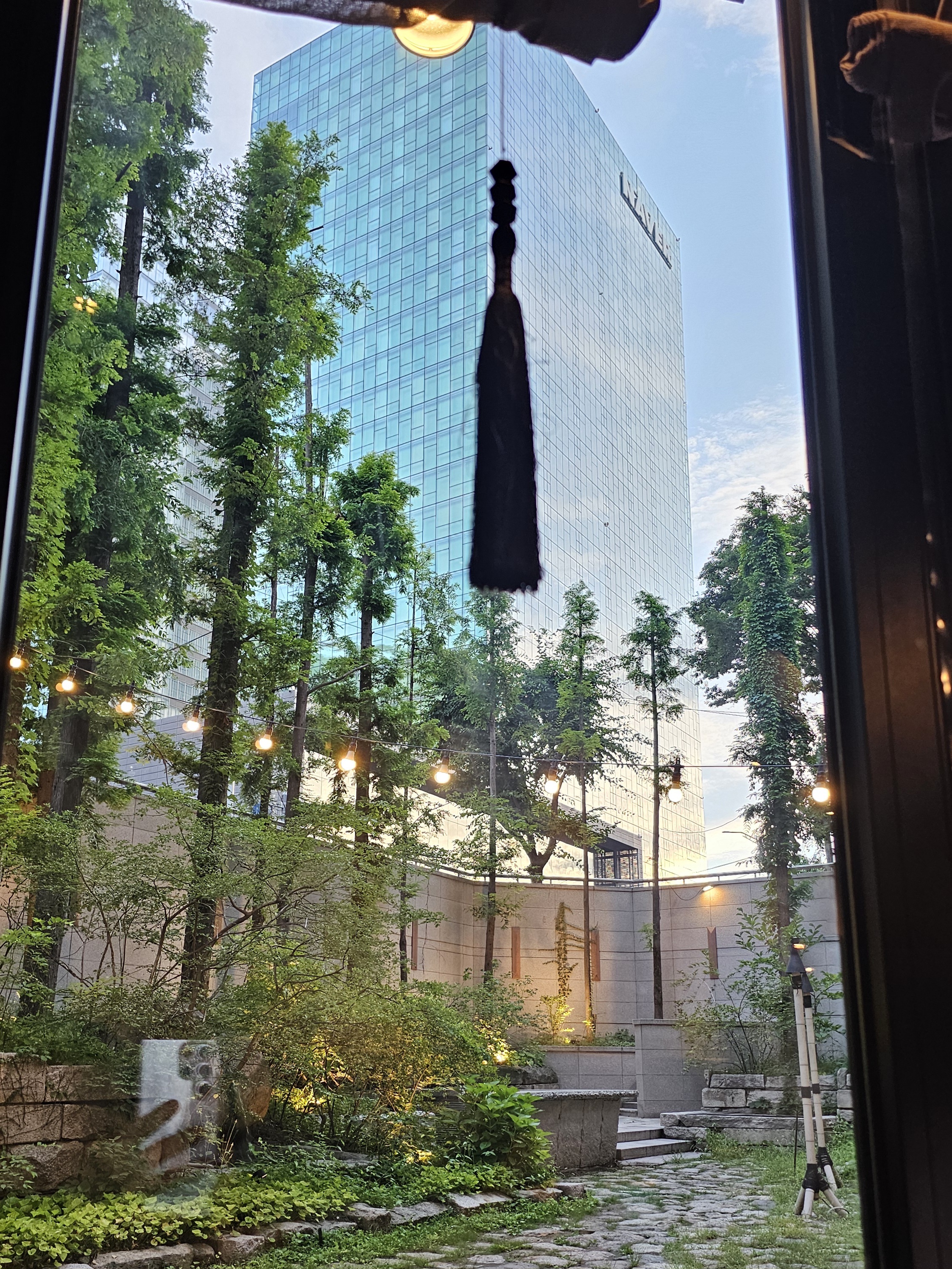 식당 앞 정원에 멀리 네이버 본사가 보이네요