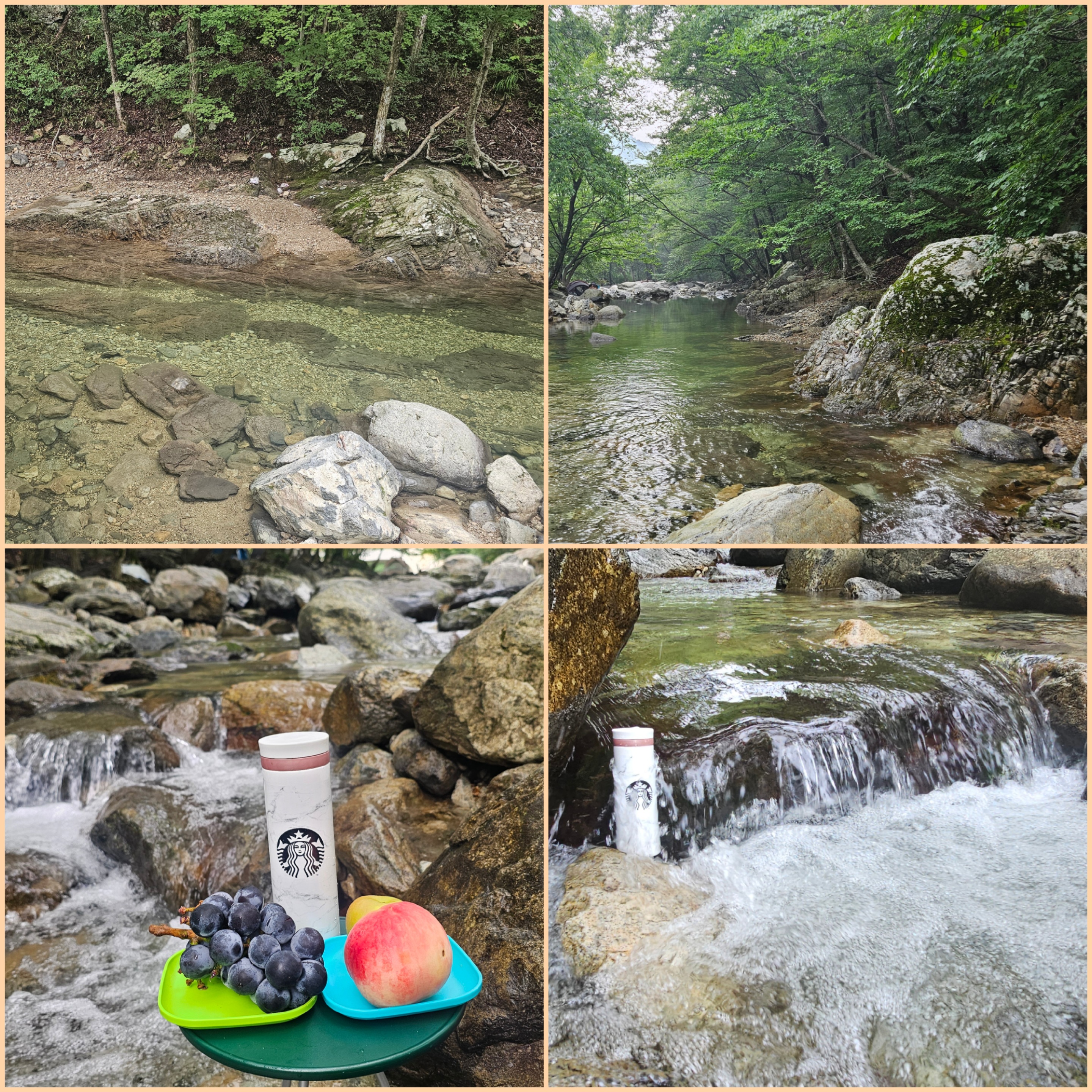 중간에 가져온 간단한 간식도 먹고, 물에 발 담근 채 커피 한 모금 마시는 그 순간이 진짜 여름 휴가였어요. 인공 풀장과는 비교할 수 없는 자연 속 휴식! 마치 어린 시절 시골 계곡에 놀러 온 듯한 기분도 들고요.