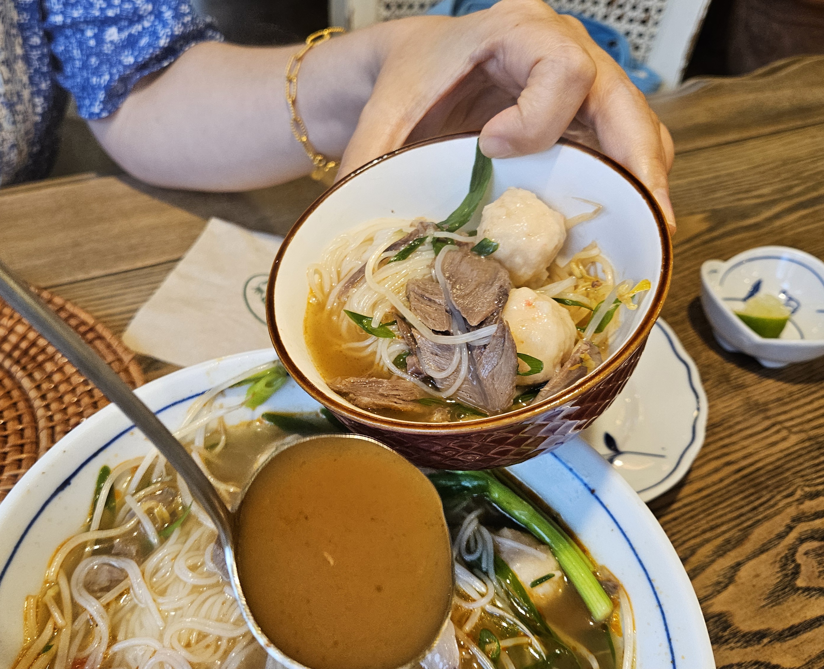국물은 사골 베이스에 레몬그라스 향이 어우러져 깊고 깔끔한 맛.
