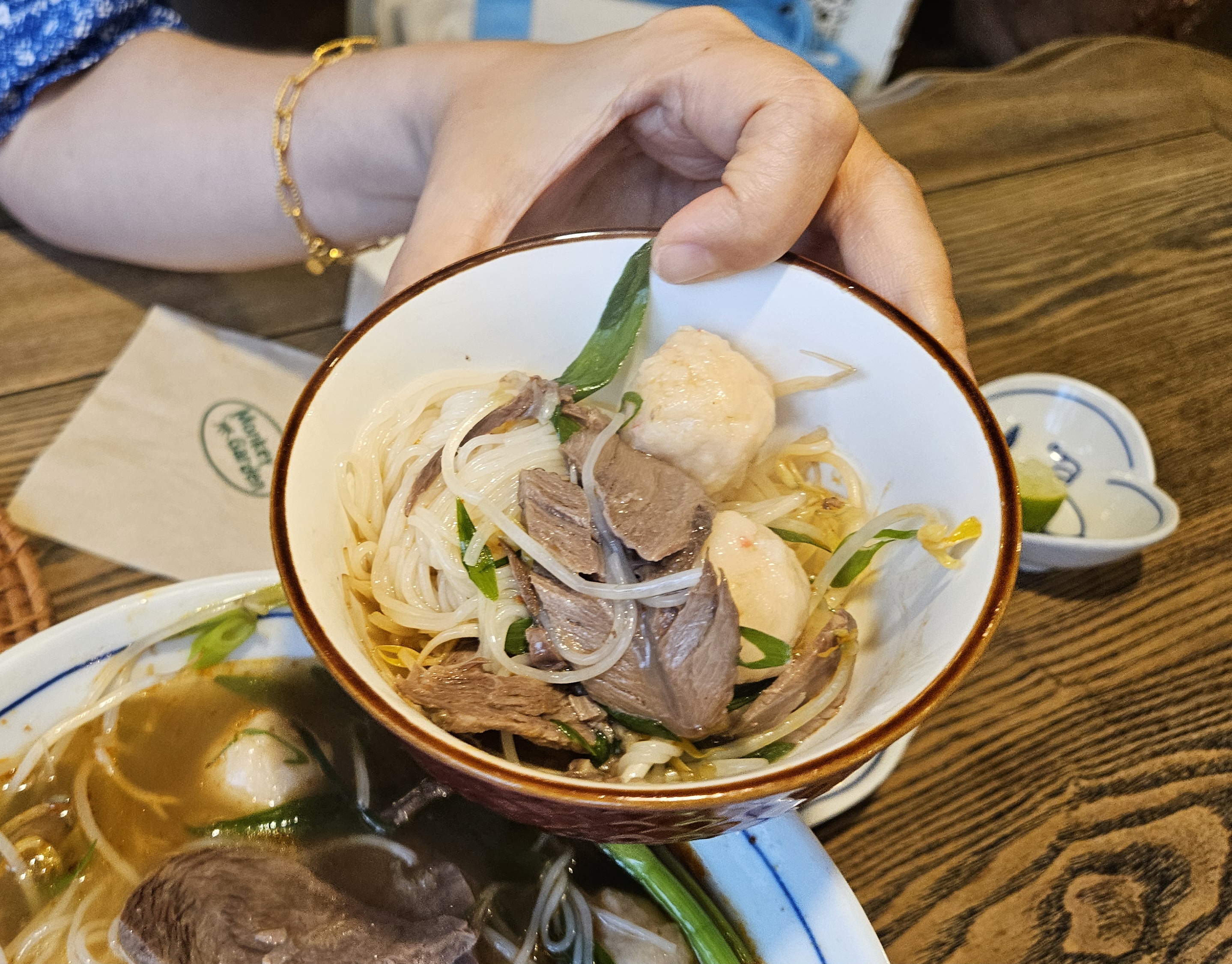 국물은 사골 베이스에 레몬그라스 향이 어우러져 깊고 깔끔한 맛.