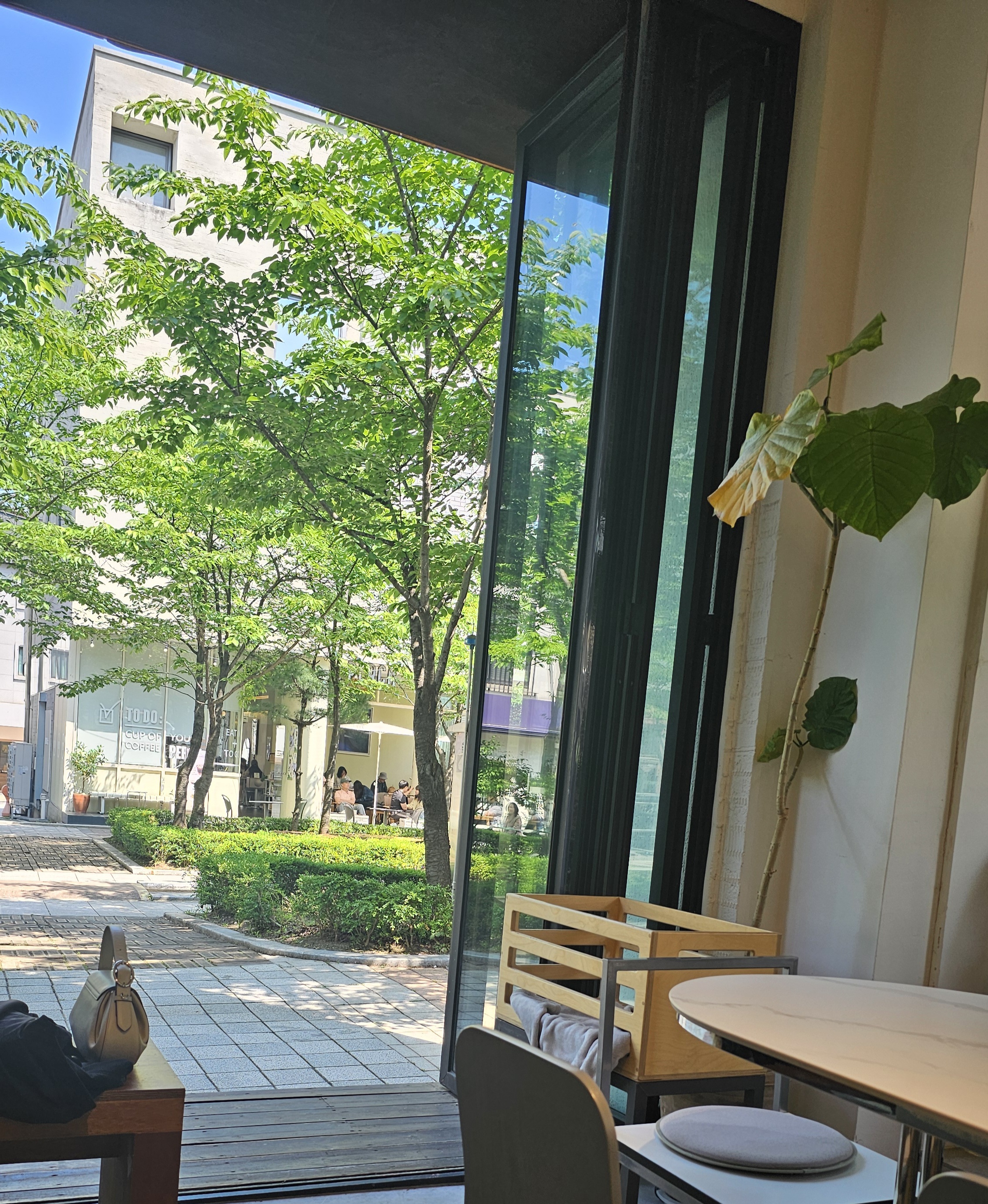 거대한 창으로 들어오는 자연광은 공간을 가득 채우며, 카페 전체를 밝고 따뜻한 분위기로 연출해요.
