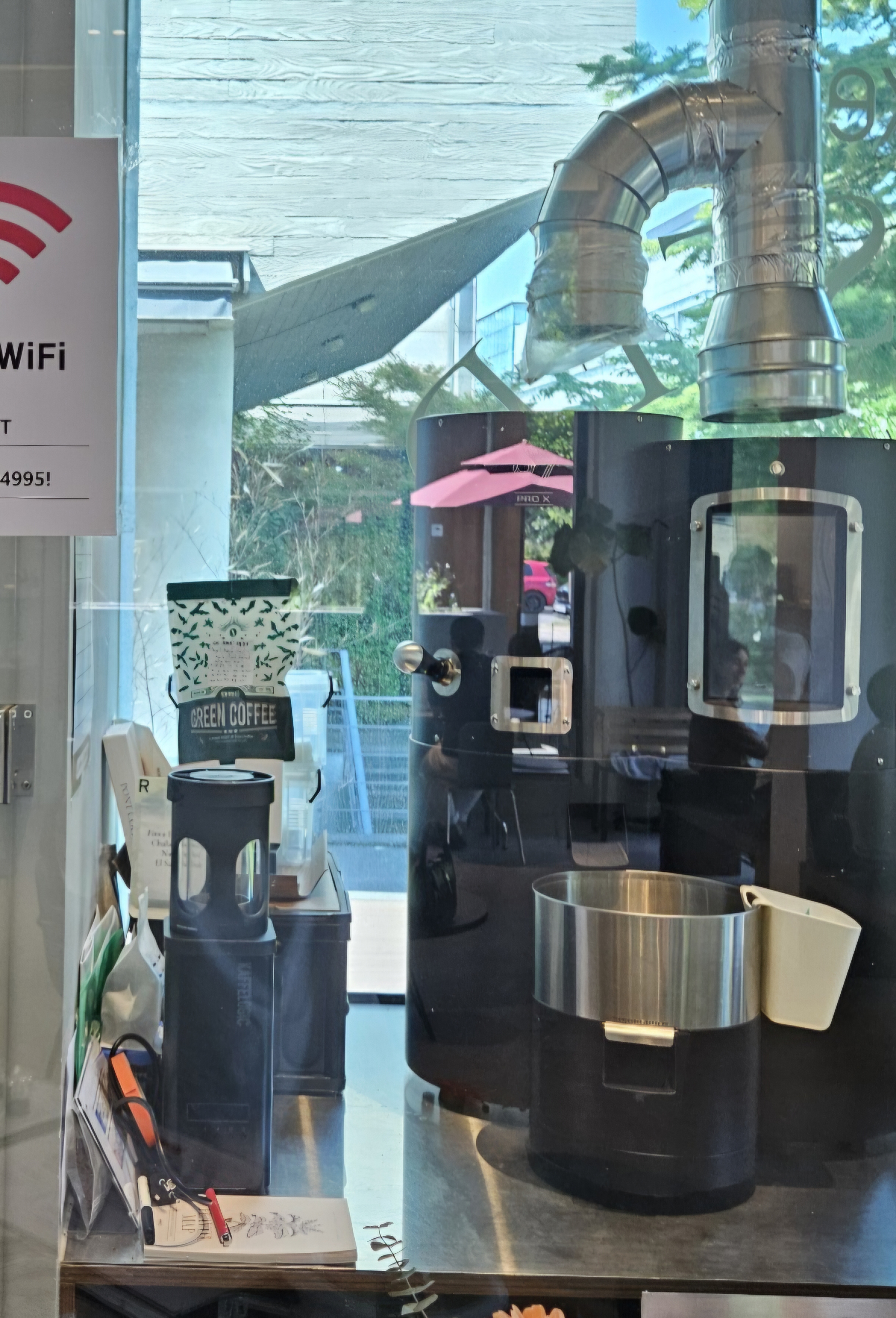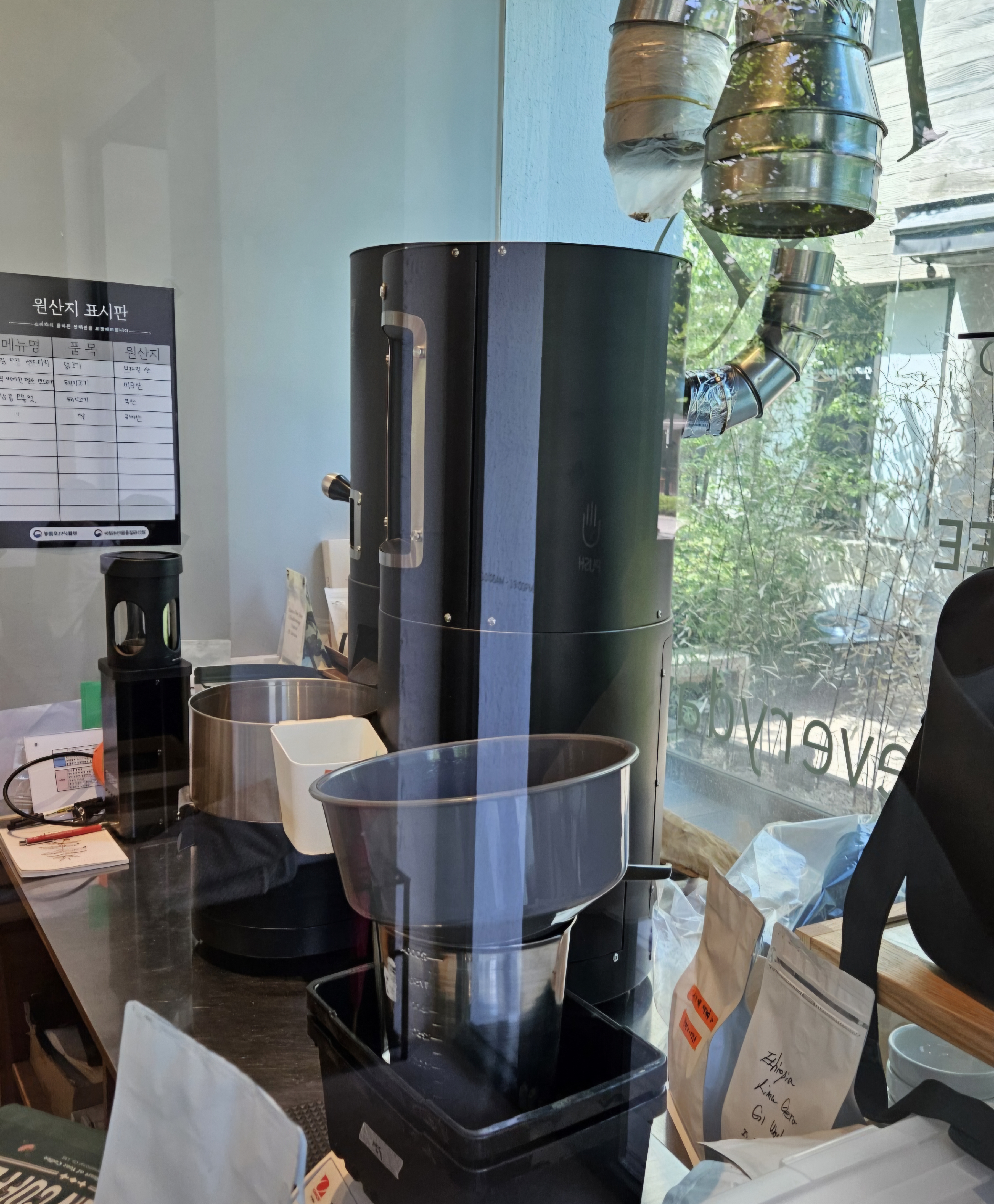 카페 입구 한편에 설치된 전문 로스팅 기계는 이곳이 단순한 커피숍이 아님을 보여주는 듯해요.