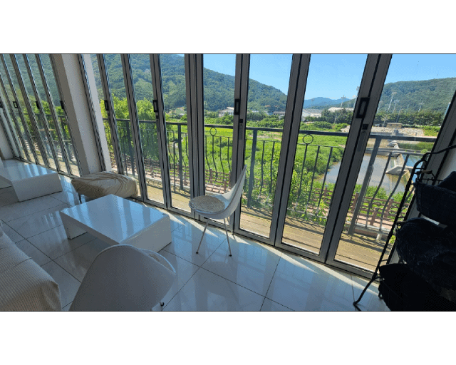 창밖 너머로 보이는 숲과 하늘, 그리고 데크길을 내려다보며