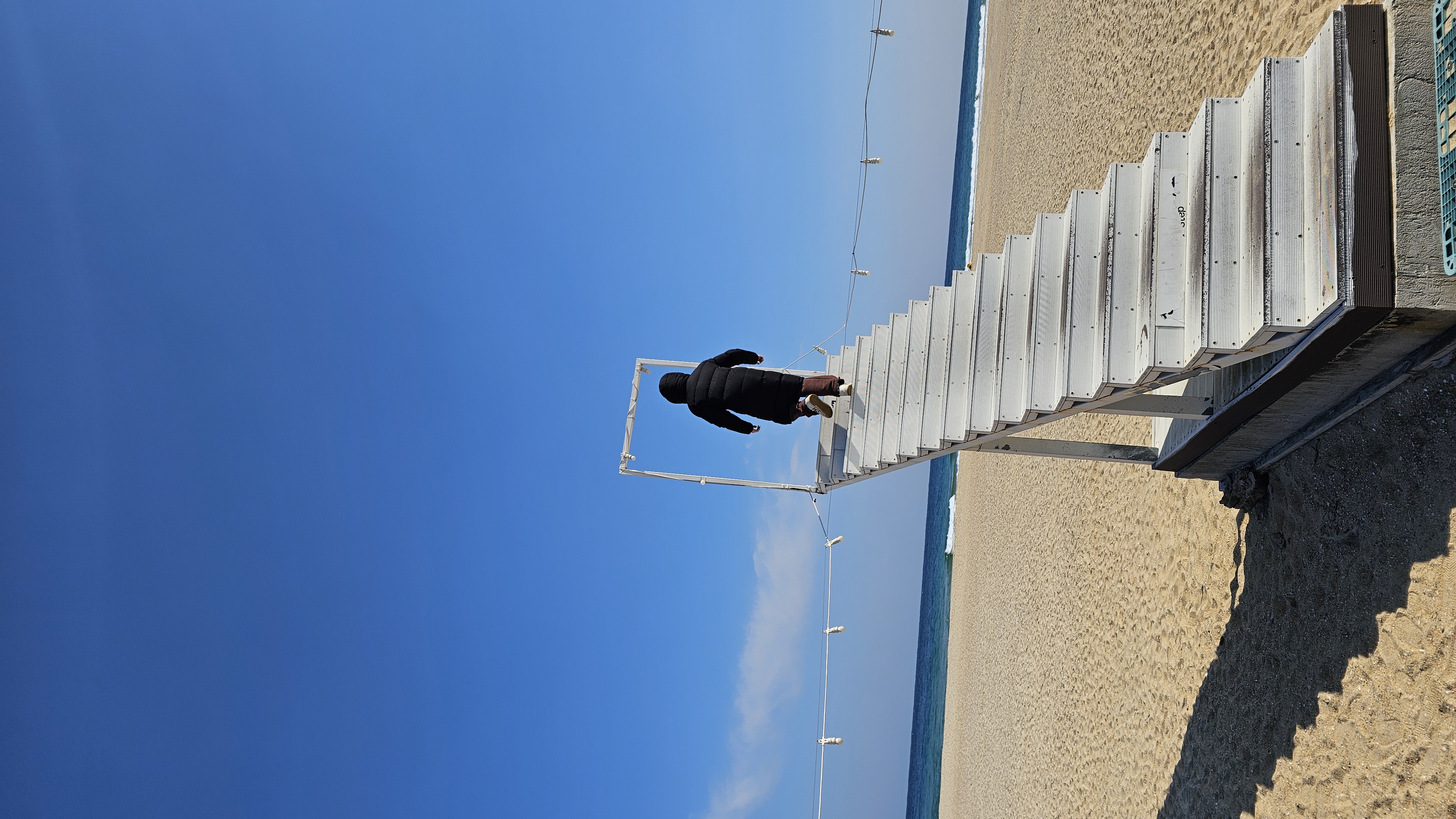 모래사장을 따라 조금 걷다 보니, 해변 끝자락에 작은 방파제가 보였습니다. 그곳에 서서 다시 바다를 바라보니, 끝없이 펼쳐진 푸른 물결이 한눈에 들어왔습니다. "이래서 겨울 바다가 더 매력적이라는 말이 있구나."라는 생각이 들었습니다.