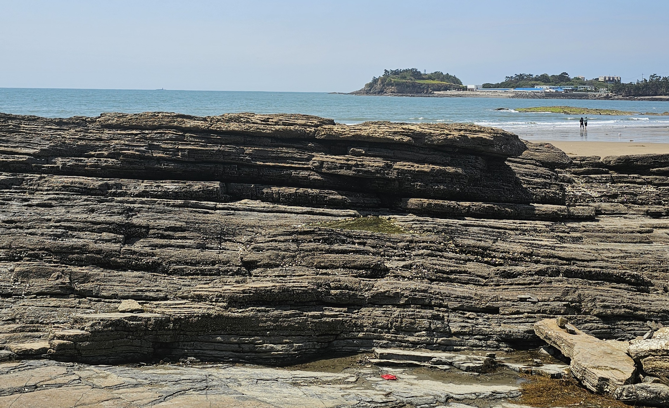 채석강은 그냥 절벽이 아니에요! 수천만 년 전, 퇴적암이 층층이 쌓이면서 만들어진 거대한 책장 같은 모습이 특징이에요. 얇고 단단한 암석들이 마치 겹겹이 쌓인 책장처럼 펼쳐져 있어서, 자연이 만든 거대한 도서관에 들어선 듯한 느낌이 들죠.