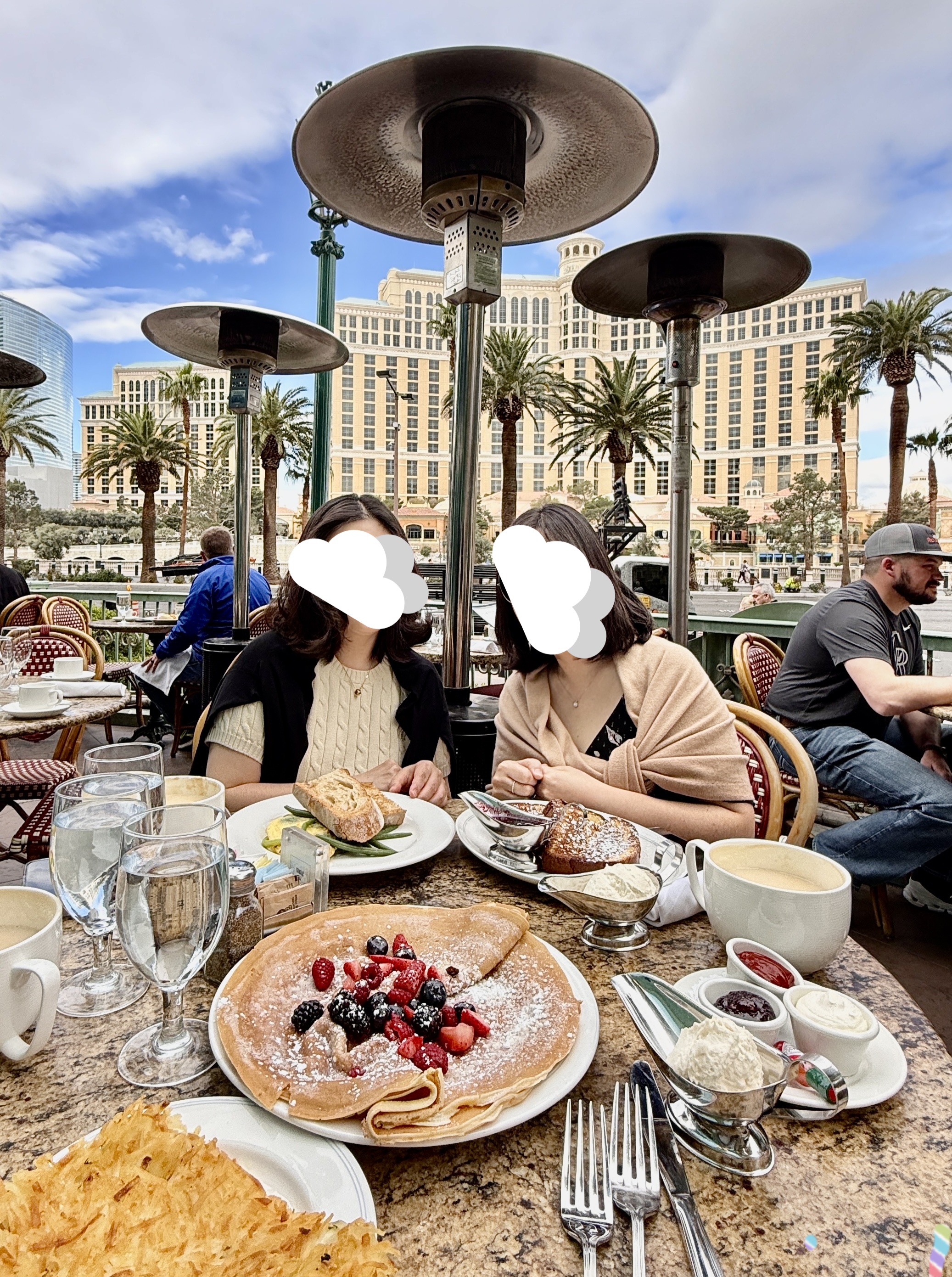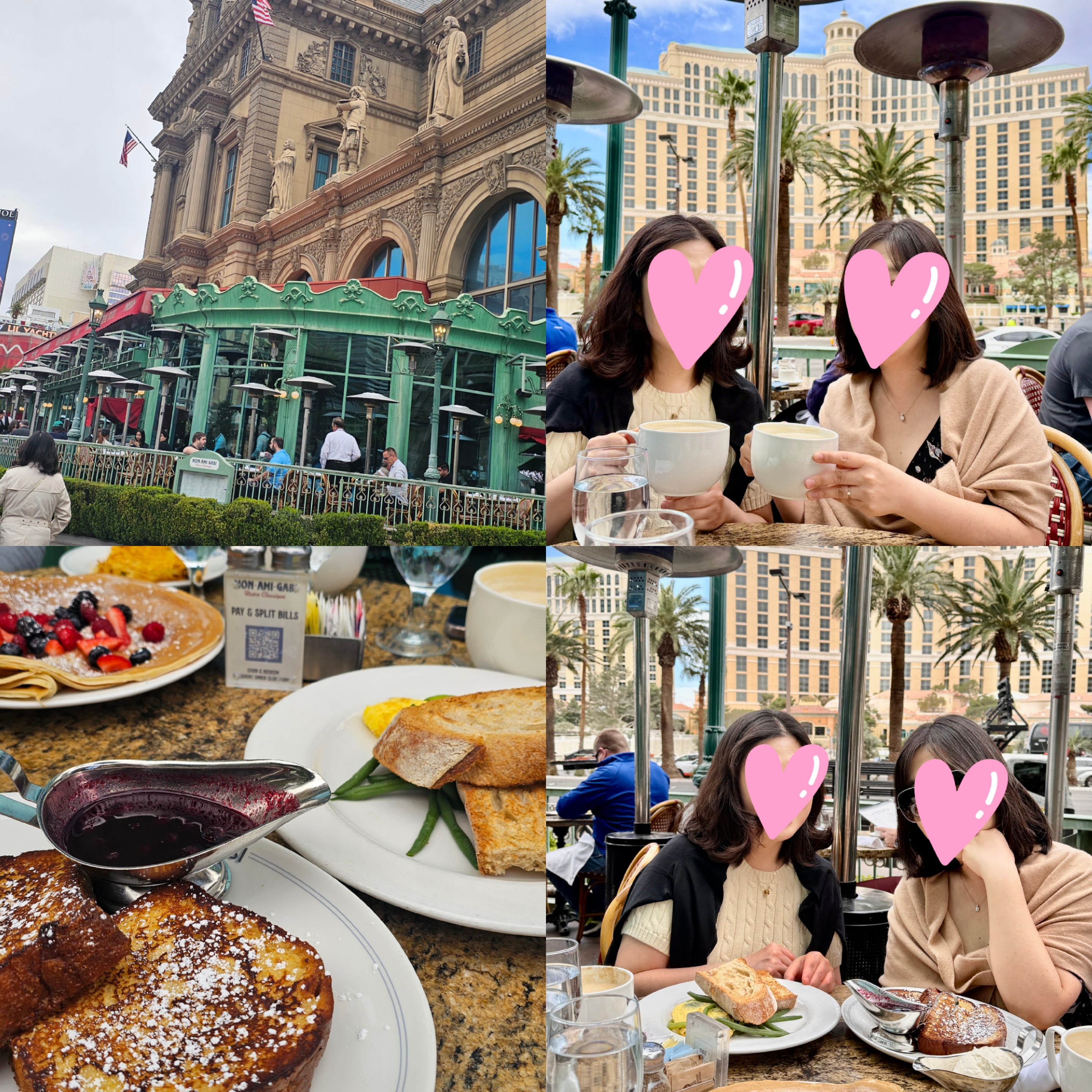 파티오석 예약하여 방문하였습니다. 다소 쌀쌀하였지만, 분위기가 너무 좋아 브런치 먹으면 라스베이거스 거리를 보며 좋은 시간 가졌습니다. 스프 그릇만한 카페 라떼, 특히 기억에 남네요. 클래식 프렌치 토스트도 예상만큼 맛있었고요.