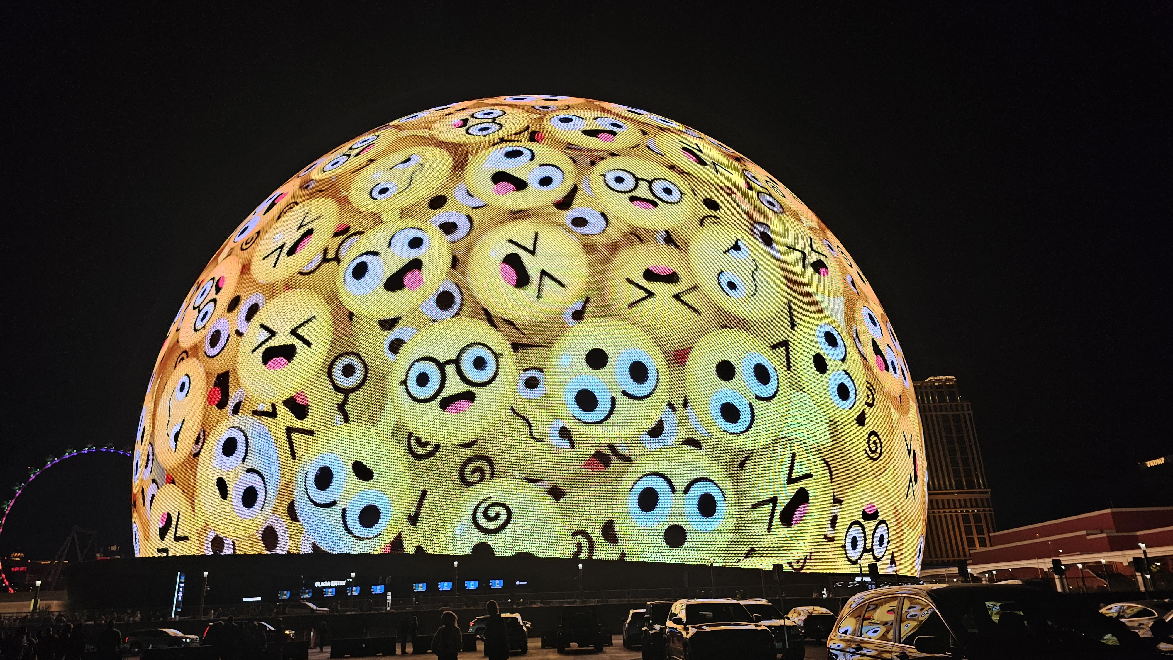 먼저, 스피어의 외관부터 엄청난 압도감을 줍니다. 건물 자체가 거대한 LED 스크린으로 이루어져 있으며, 밤이 되면 지구, 달, 이모지, 눈동자 등 다양한 이미지가 표시됩니다.