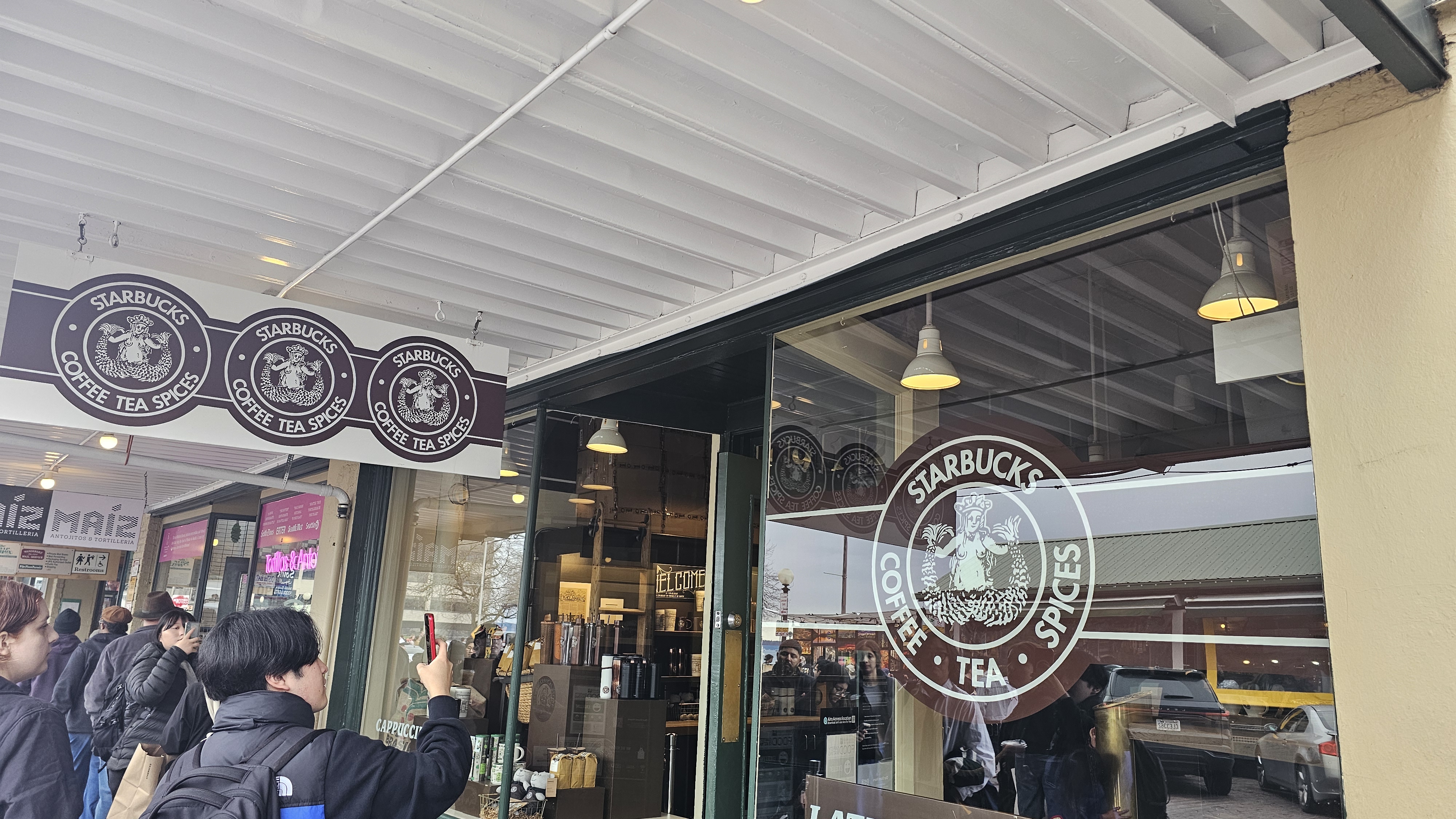 관광객으로 붐비는 스타벅스 1호점 앞에서