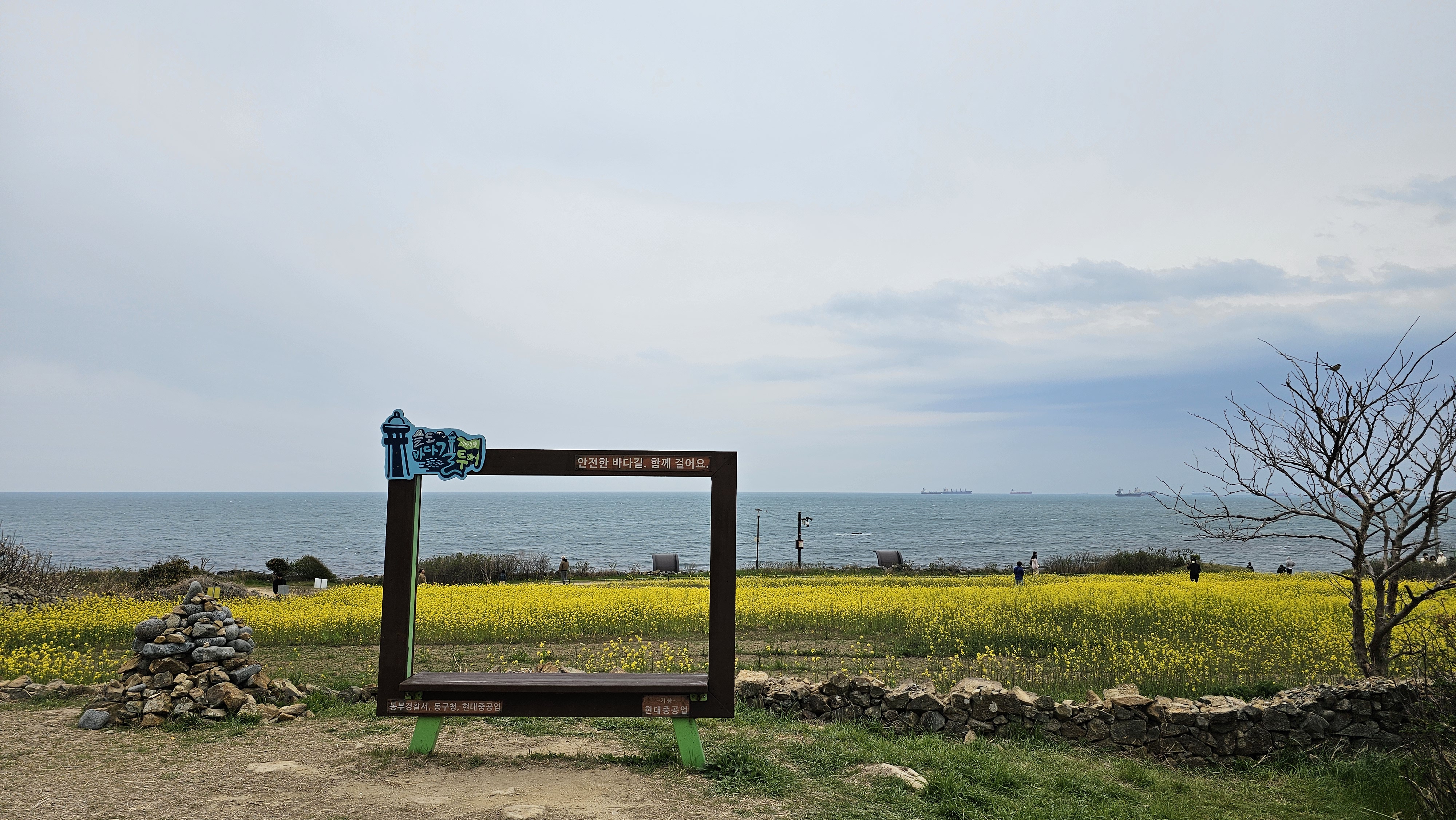 공영주차장에 차를 세우고 천천히 산책을 시작했어요. 오른쪽으론 시원한 동해 바다가 펼쳐지고, 왼쪽으론 노란 유채꽃이 바람에 살랑거리는 모습이 어찌나 예쁘던지, 사진을 안 찍을 수가 없었답니다.