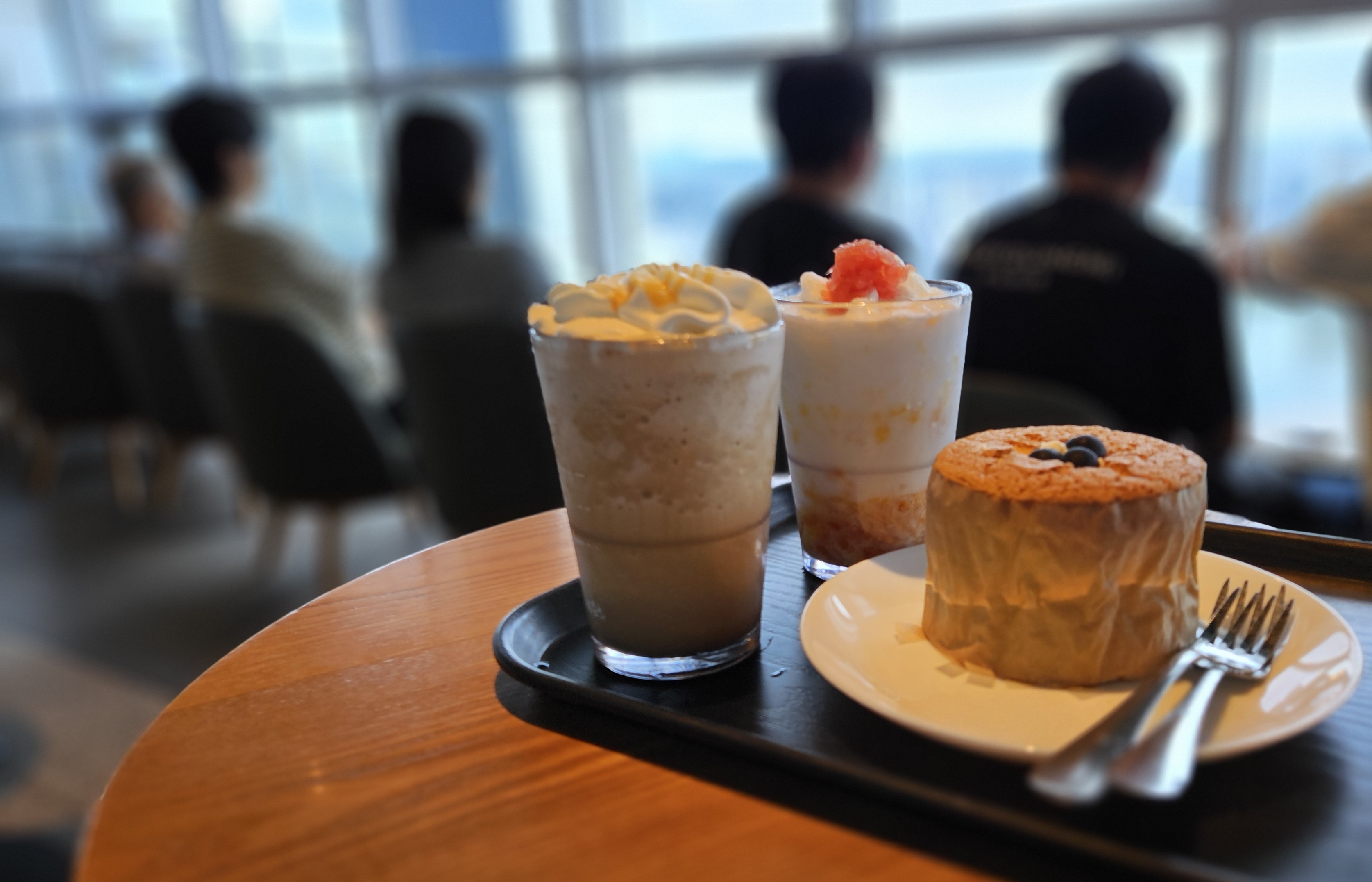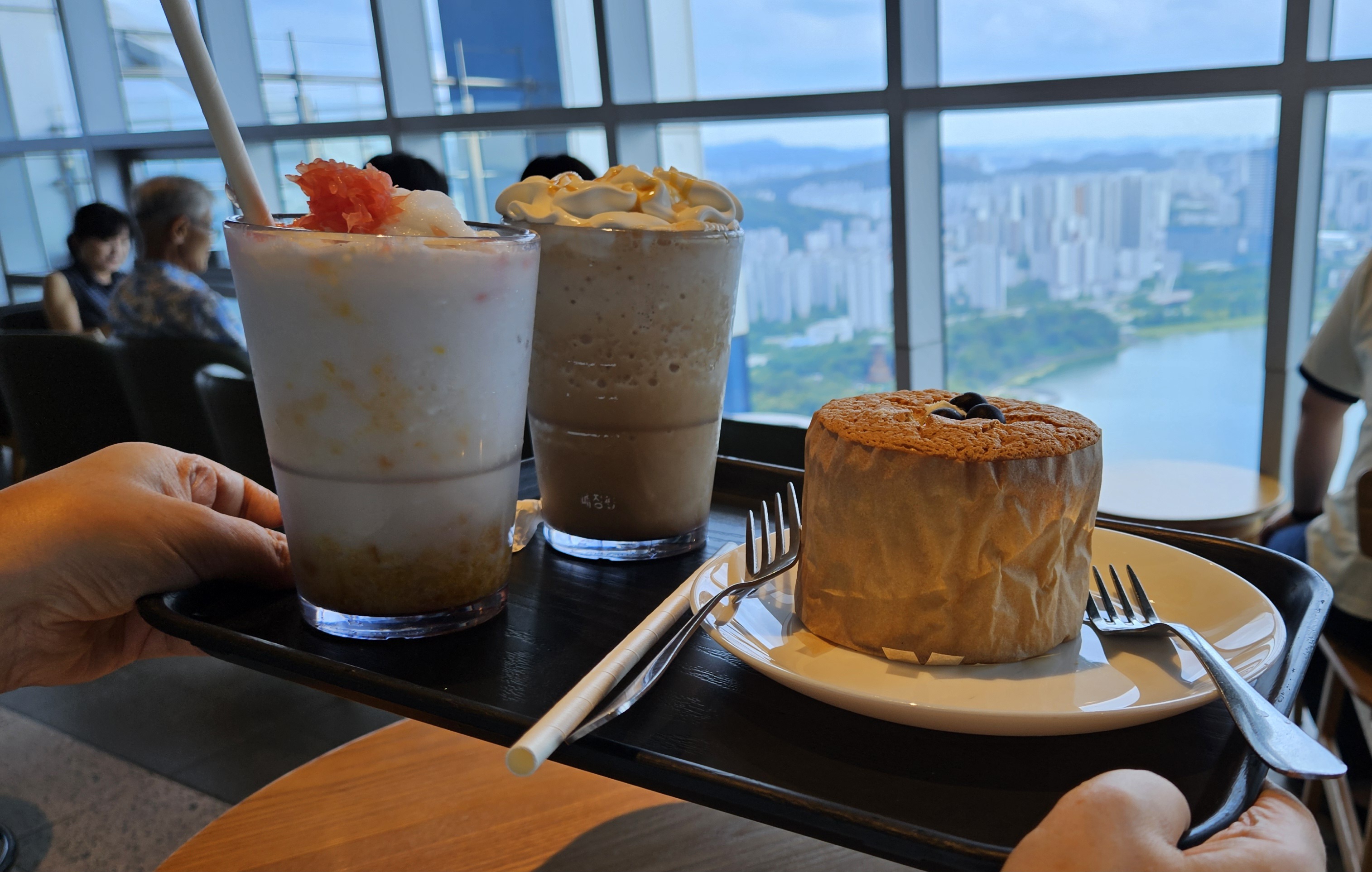 엘리베이터를 타고 41층에 도착하는 순간, 눈앞에 펼쳐지는 광교 호수공원의 전경에 입이 절로 벌어졌어요. 탁 트인 창 너머로 보이는 호수와 도시 풍경은 마치 여행지에 온 듯한 기분을 선사해요. 창가 자리는 특히 인기 만점이라 오픈런 추천! 저는 오후 2시쯤 도착했는데, 운 좋게 창가 근처 자리를 잡을 수 있었어요.