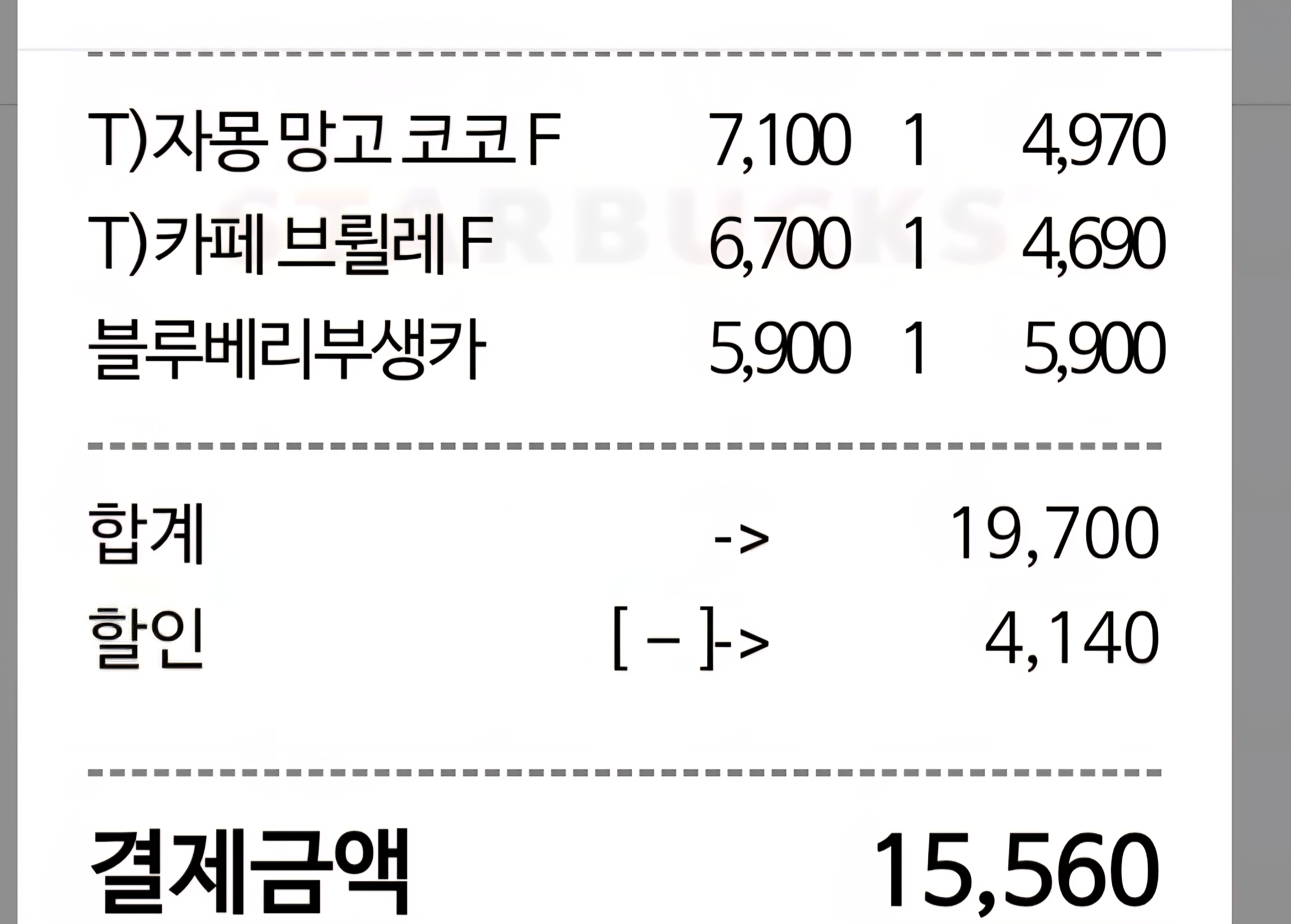 총 금액은 19,700원이었지만,15,560원에 즐길 수 있었어요.