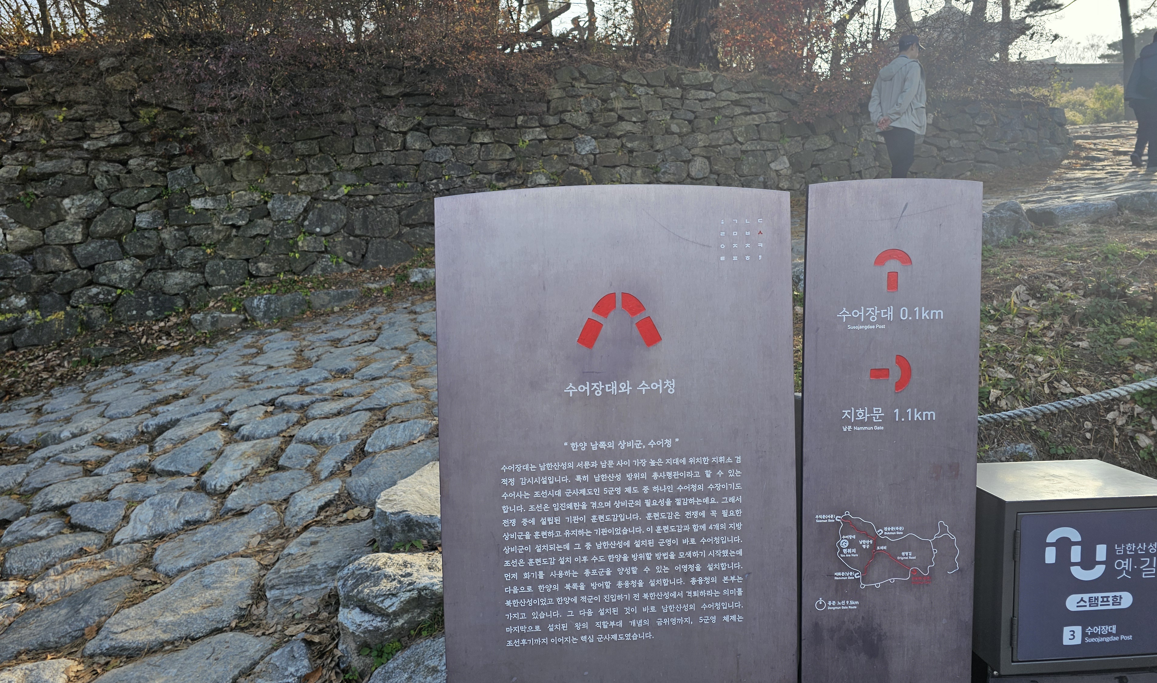 조금 각도가 있는 길을 선택해 수어장대를 향해 오르기 시작했는데, 이른 아침의 차가운 공기와 숲의 향이 어우러져 정신이 맑아지는 기분이었어요.