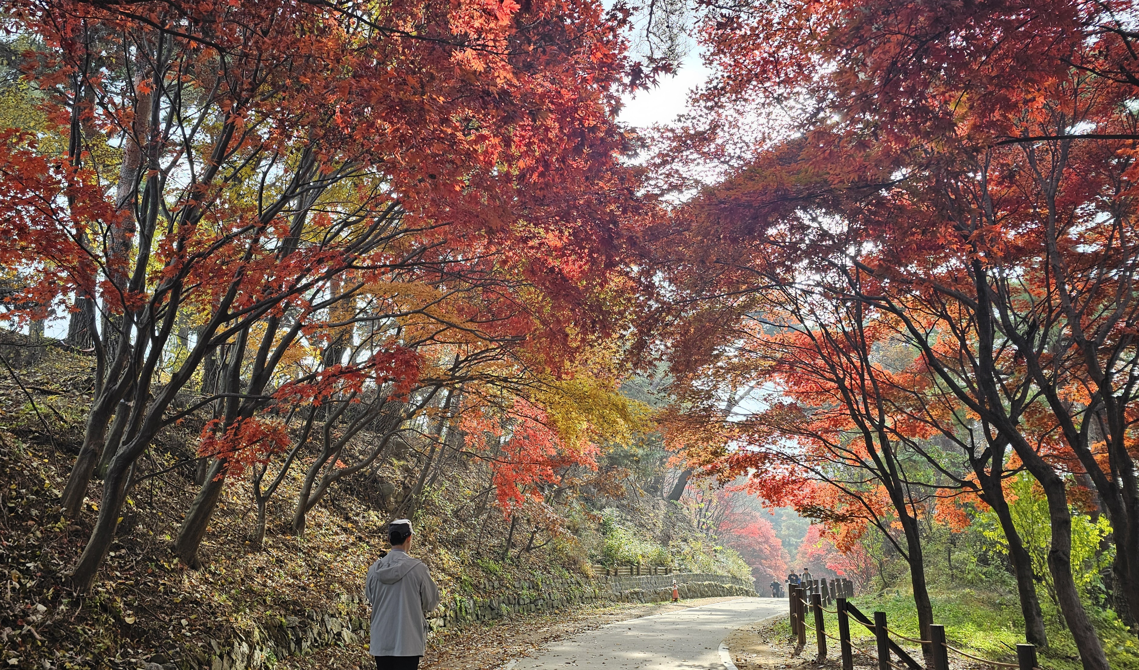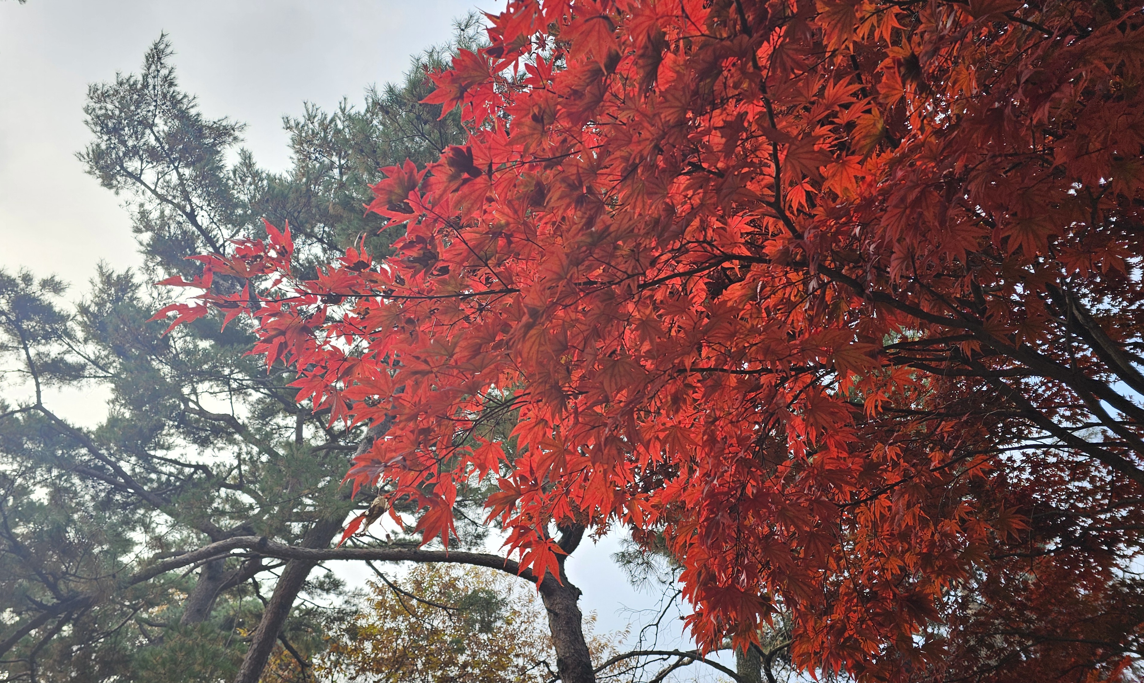 짙은 녹음 사이로 붉게 물든 단풍이 어우러져, 마치 붉은 비단을 깔아놓은 듯한 풍경이 펼쳐졌어요.