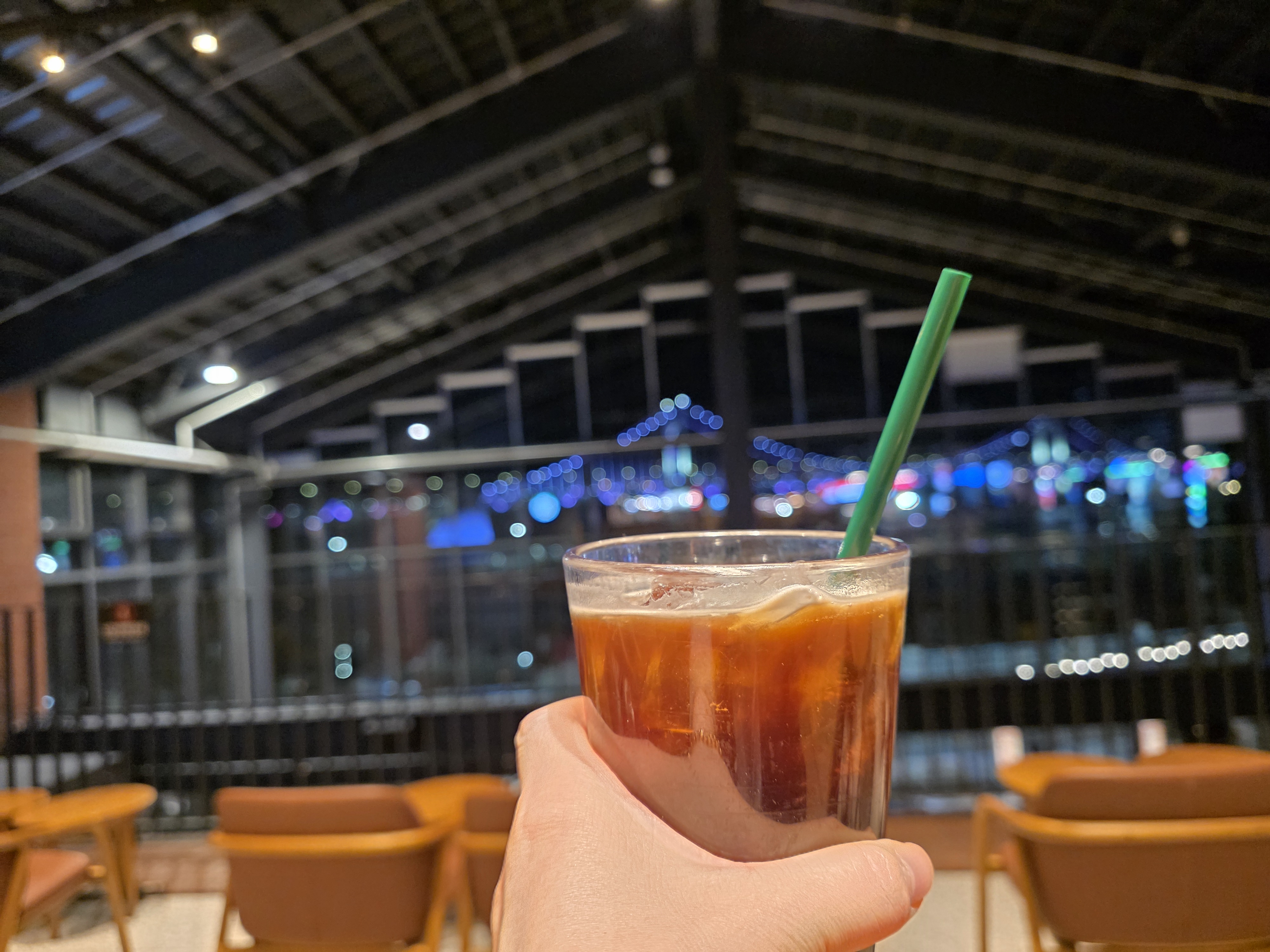 그렇게 걷다 보니 눈앞에 반짝이는 광안대교 야경이 펼쳐지고, 그 풍경을 정면으로 담아내는 스타벅스 밀락더마켓점이 나타났어요.