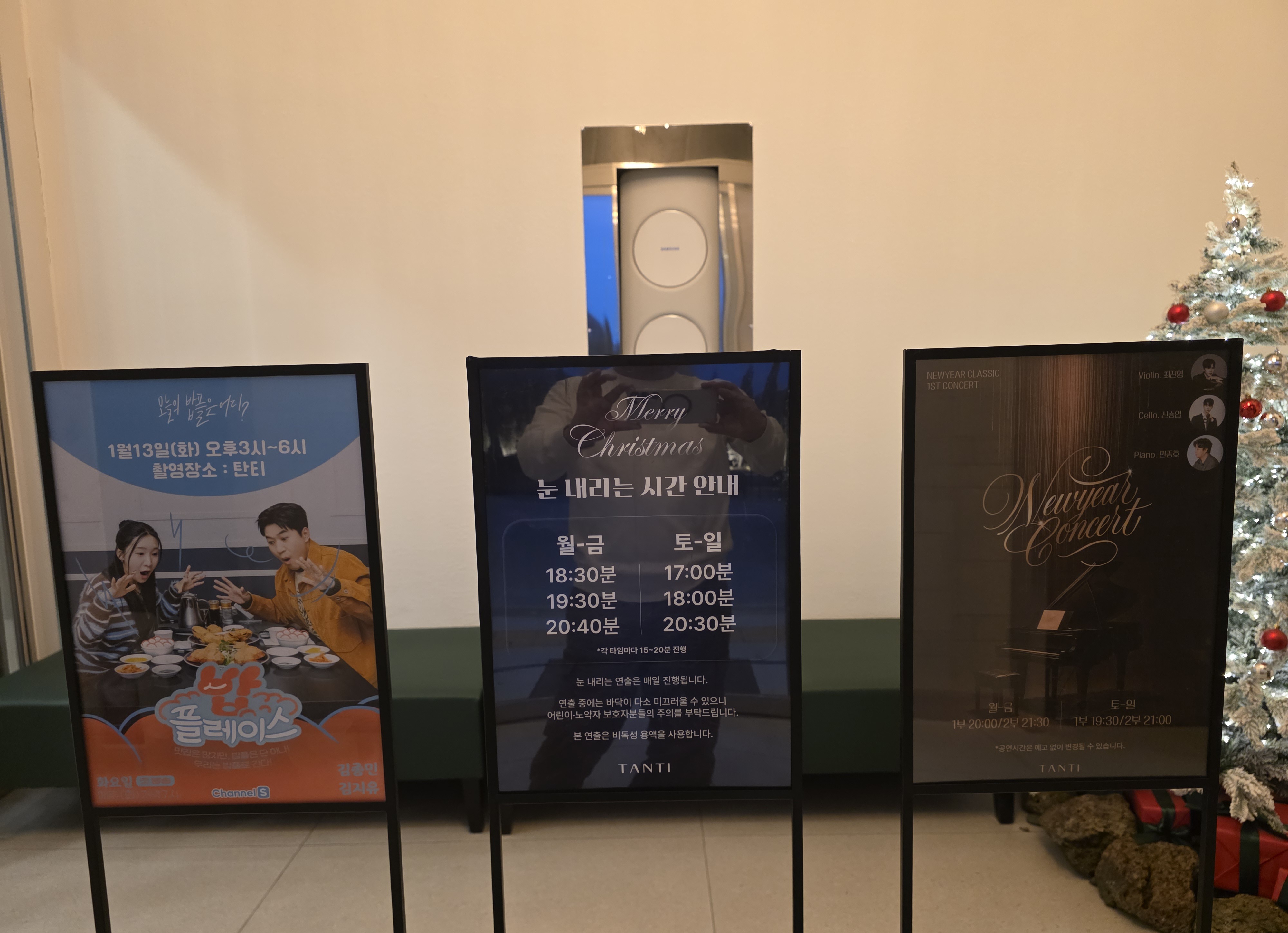 탄티는 단순한 카페가 아니라, 마치 작은 공연장이자 포토 스팟이 가득한 문화 공간 같았어요. 특히 겨울 시즌에는 클래식 공연과 함께 야외 트리 조명, 그리고 눈 내리는 연출까지 더해져서 마치 동화 속에 들어온 기분이예요.
