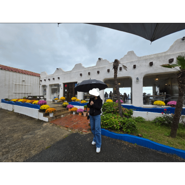 야외 테라스에서 우산 쓰고 바람 맞으며 ~~