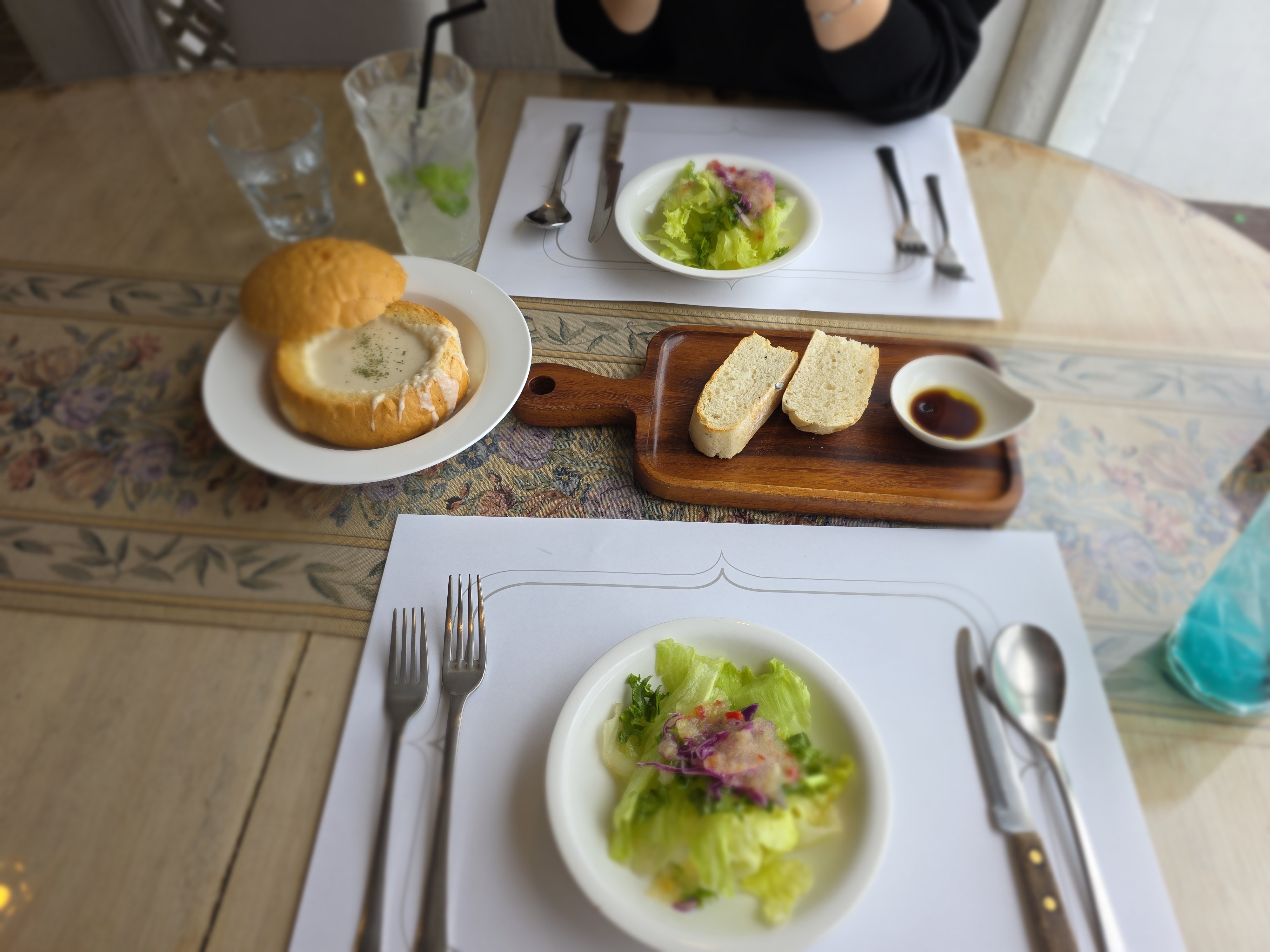 이건 빠네스프랑 음료가 같이 나와요. 빠네스프는 빵 안에 스프가 담겨 있는데, 비주얼부터 고급지다!