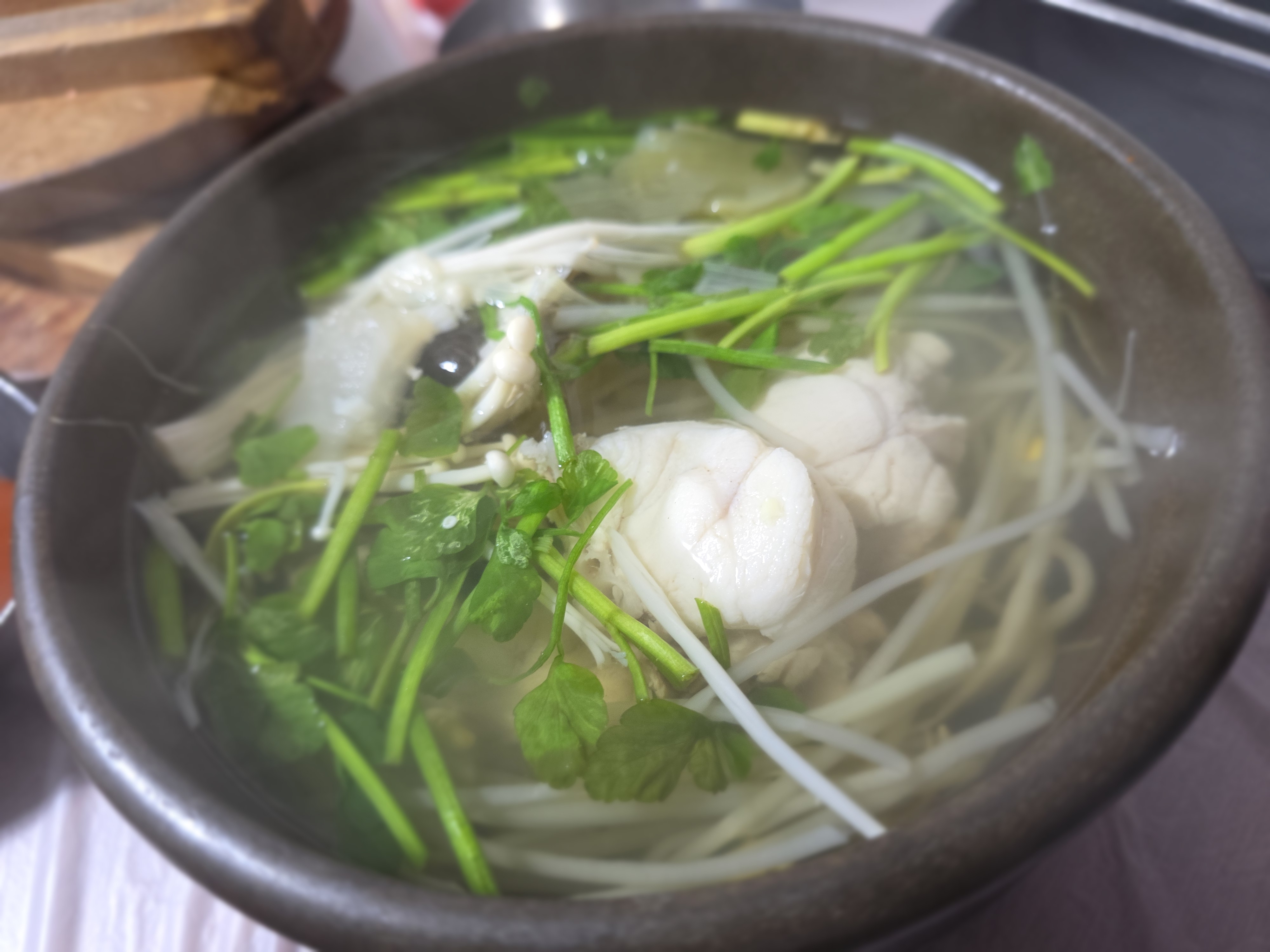 밀복 살은 탄력이 있으면서도 결이 곱게 풀어졌어요. 씹을 때마다 단단한 듯하면서도 곧 부드럽게 녹아내리는 식감이 인상적이었어요. 복어 특유의 비린내는 전혀 없었고, 대신 고소하면서도 담백한 맛이 국물과 어우러져 밥을 계속 부르게 했어요.