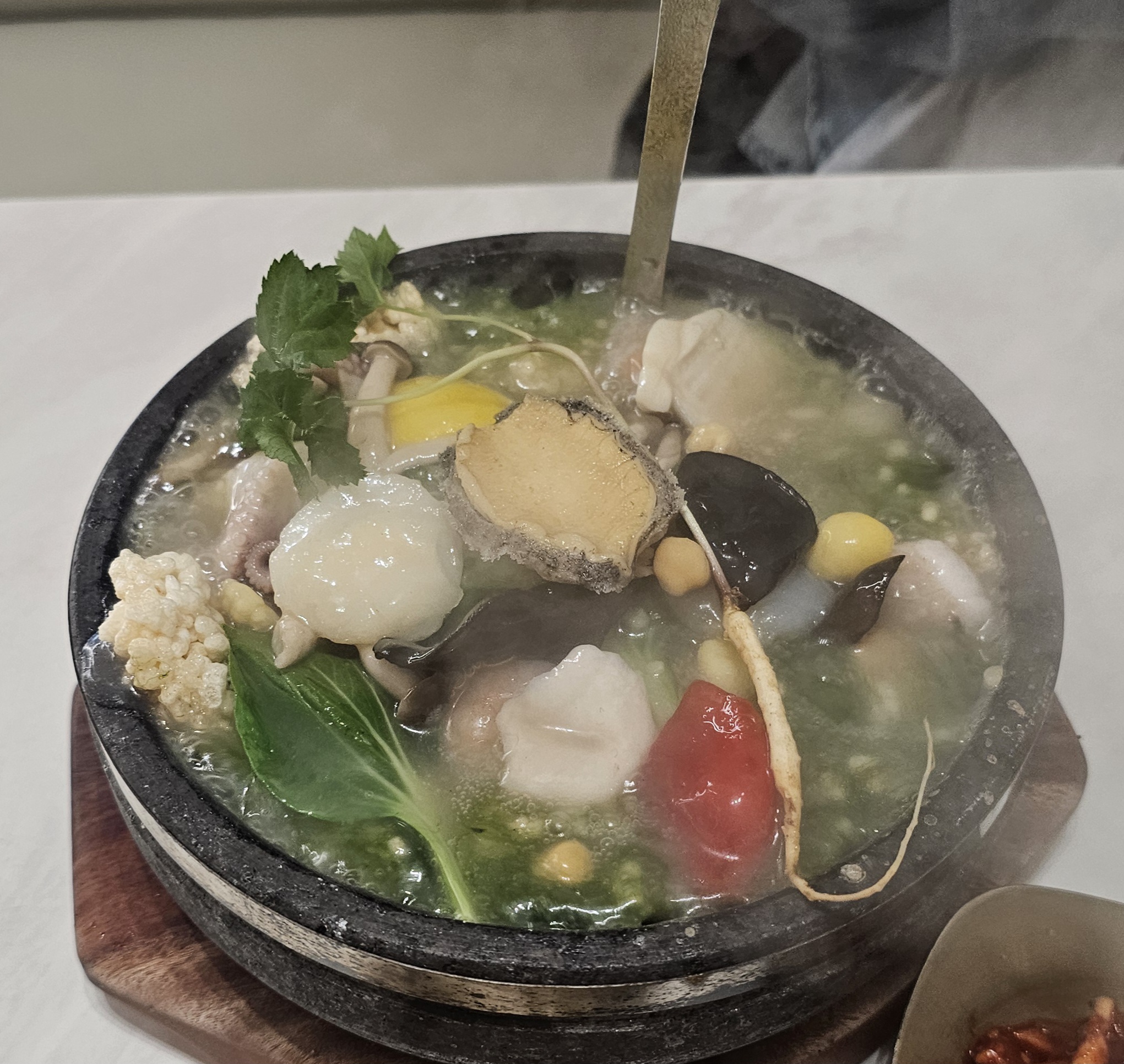 누룽지탕의 마무리는 통전복과 어린 삼 한 뿌리로 완성되는데요, 이 조합은 건강과 고급스러움을 동시에 챙긴 구성이라 부모님이나 어르신들과 함께 방문하기에 딱이에요. 전복은 한 머리씩 정갈하게 얹어져 있어 비주얼도 훌륭하고, 삼은 은은한 향으로 국물 맛을 깊게 만들어줘요.