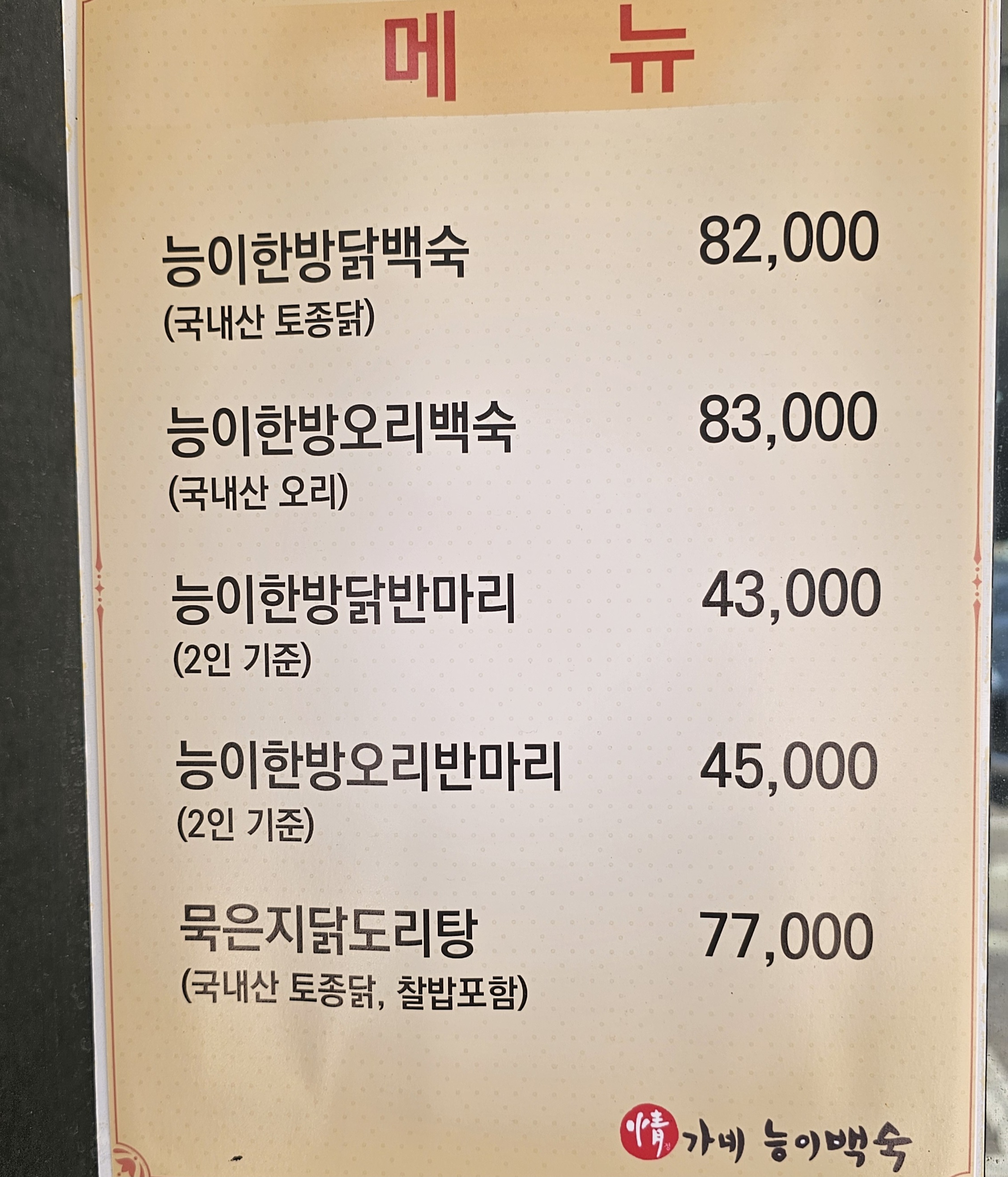이날 주문한 메뉴는 능이닭백숙 한 마리, 가격은 82,000원.