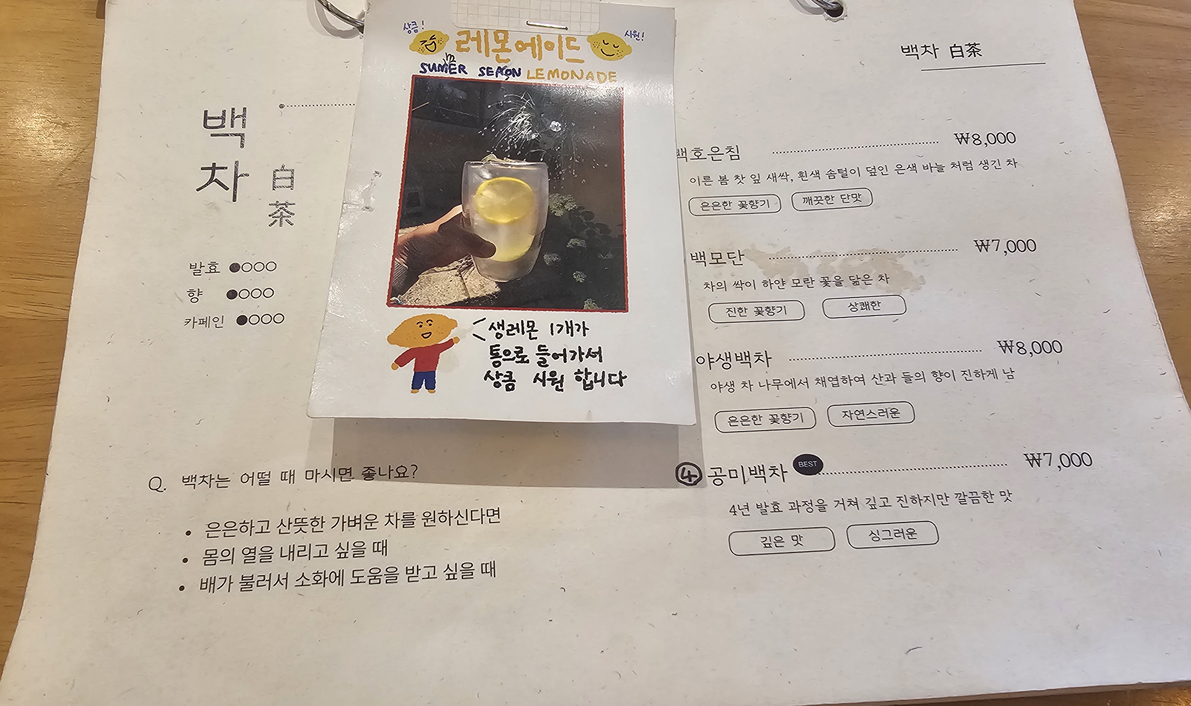 차를 전문으로 하는 공간이었지만, 커피를 사랑하는 우리는 각자의 취향을 고수했어요. 핸드드립 커피 두 잔, 카페오레 한 잔, 그리고 레모네이드 한 잔을 주문했어요. 사장님은 조심스럽게 이곳의 대표 티인 백차 한 잔을 추천해주셨어요. 향이 좋고 커피를 즐기는 사람들도 만족할 수 있는 맛이라 하셔서, 호기심에 백차 한 잔을 추가로 주문해 나눠 마시기로 했어요.