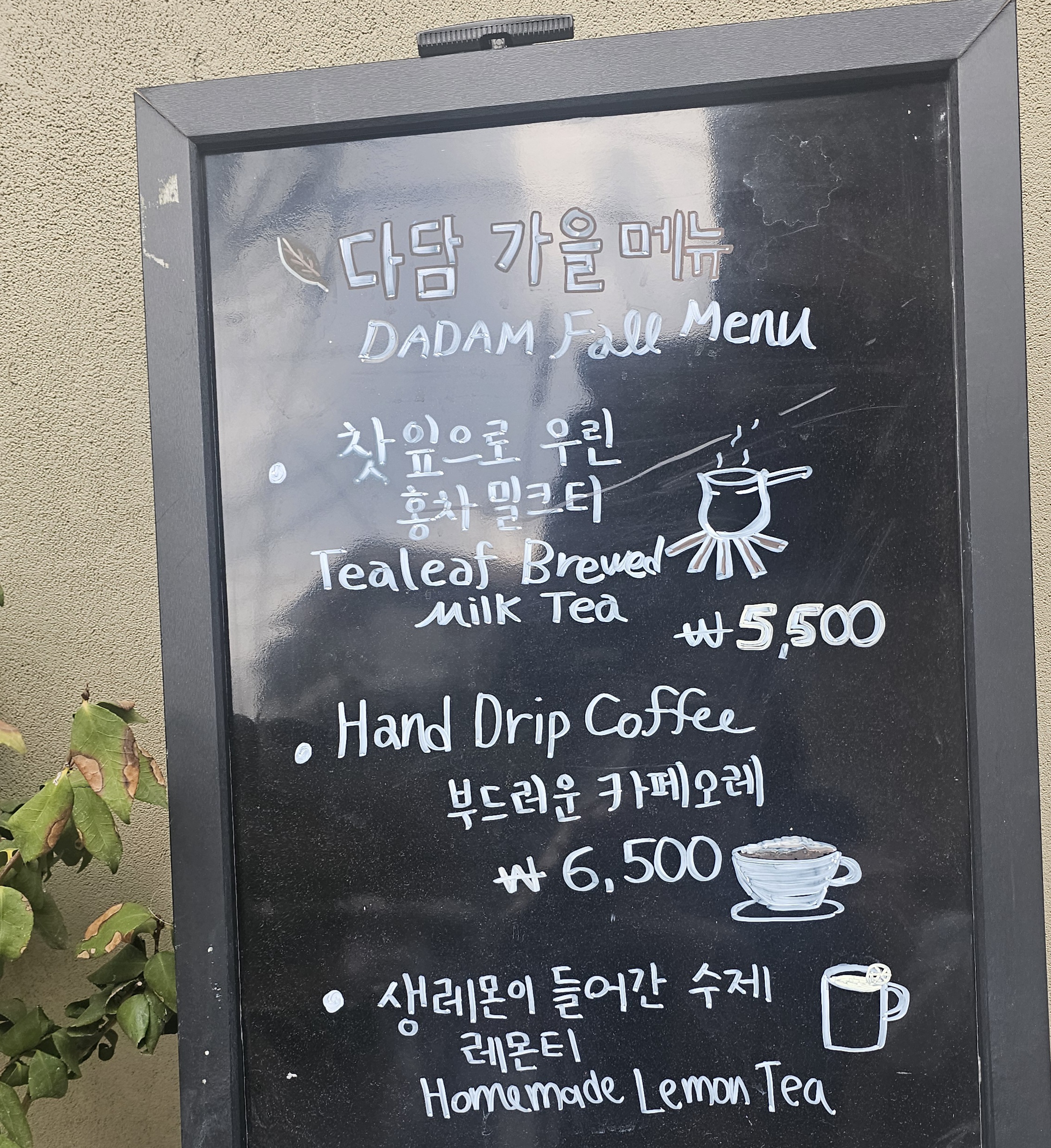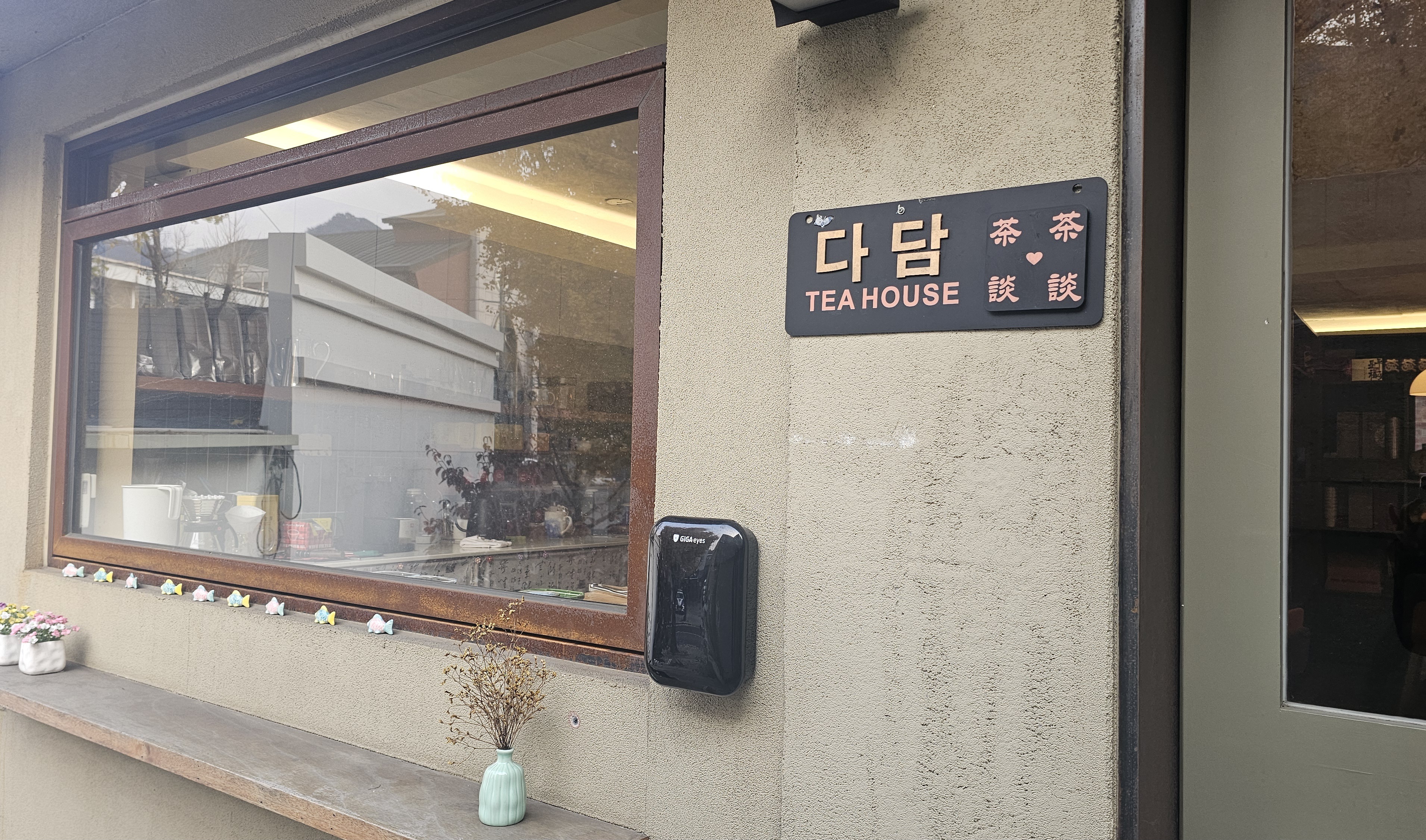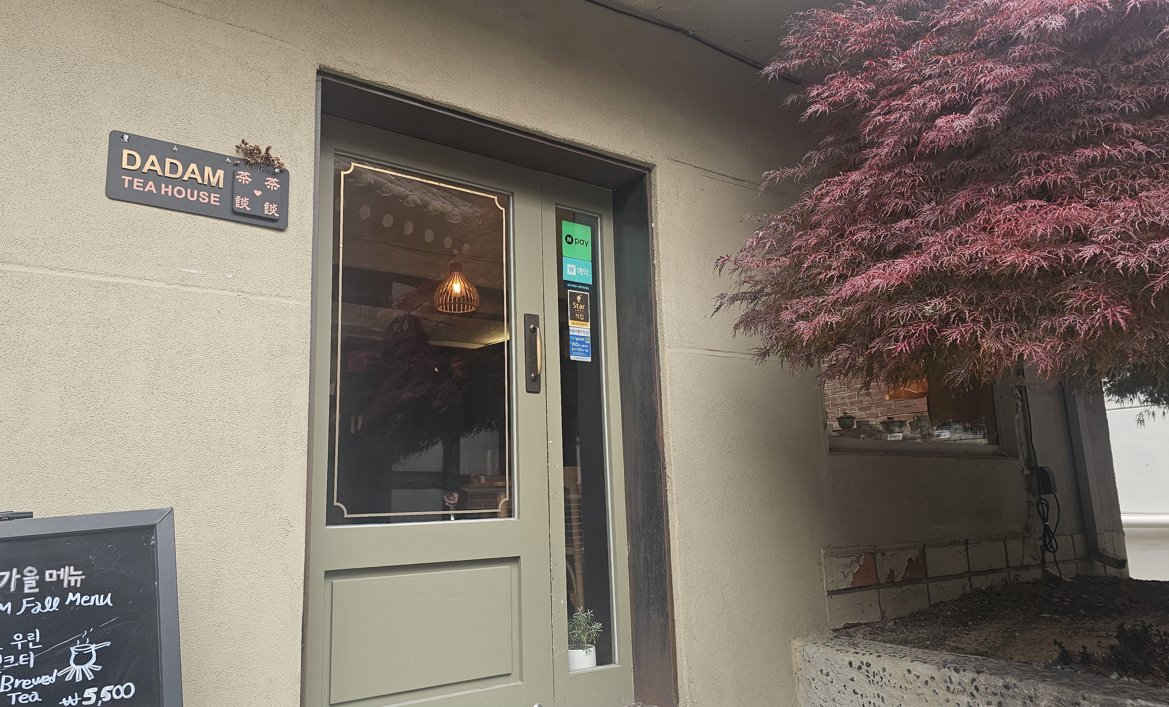 삼청동으로 향하던 길, 계단 앞에 선 단풍나무 한 그루가 눈길을 사로잡았어요. 붉게 물든 잎들이 햇살을 받아 반짝이는 모습이 너무 예뻐서, 그 풍경에 이끌려 계단을 올랐고 조용하고 단정한 외관의 찻집을 발견했어요. ‘다담 티하우스’라는 이름의 이곳은 계단식 좌석 구조와 따뜻한 조명, 벽면을 채운 찻잔과 티 패키지들로 아늑한 분위기를 자아냈어요. 차를 마시는 공간을 넘어, 시간을 머물게 하는 장소였어요.