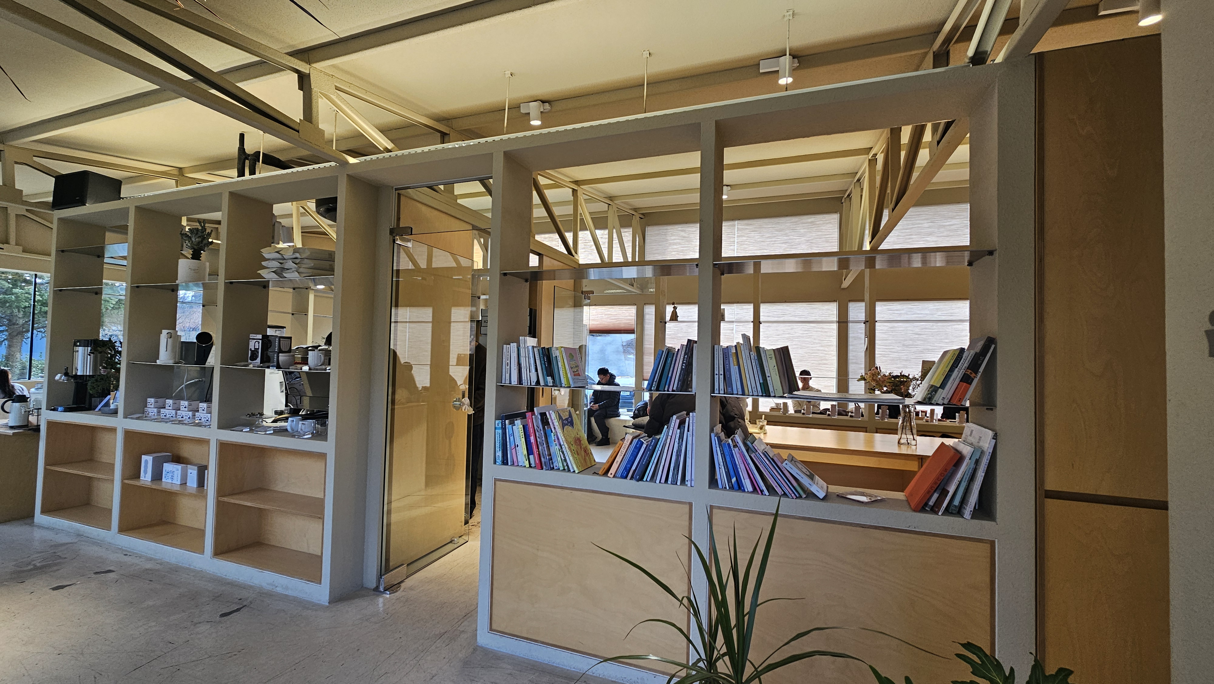 외관은 낮고 아담하지만, 내부는 큰 창을 통해 햇살이 가득 들어오고