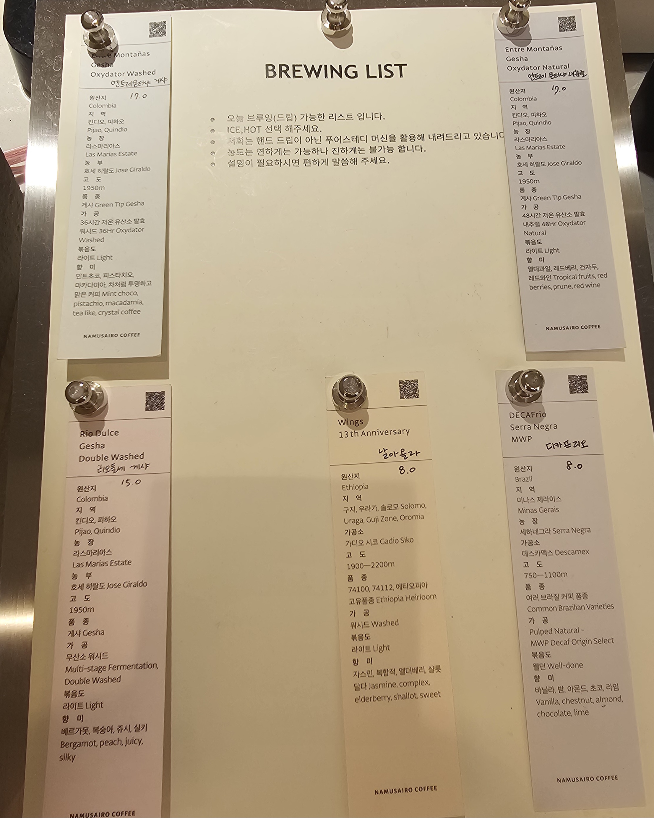 각 원두의 가공방식 특징등이 하나하나 설명되어 있어 인상적이었어요.