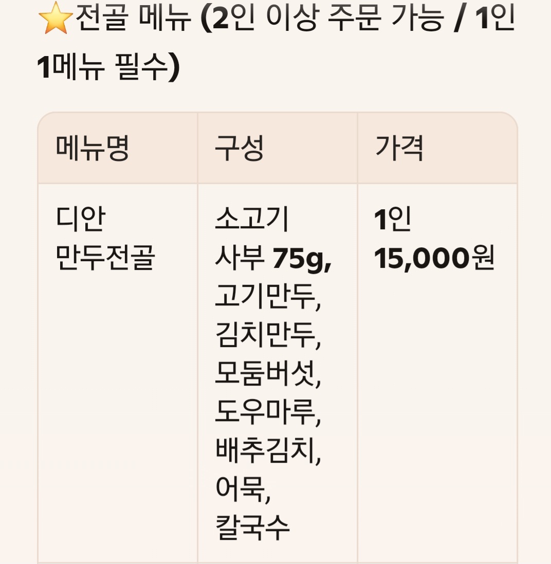 ‘디안 만두전골’의 메뉴는 전골 중심으로 구성되어 있었어요.