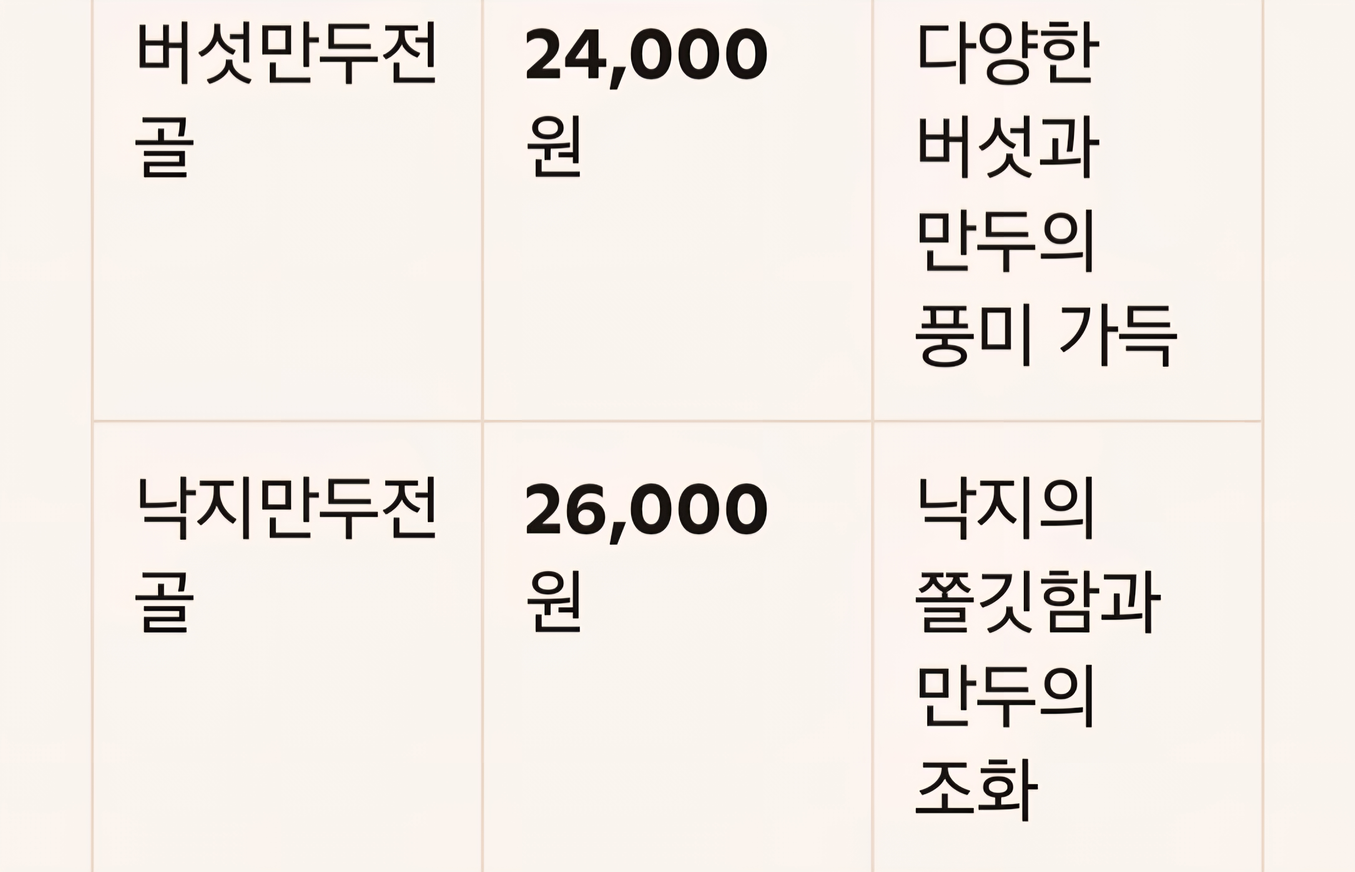 - 만두는 직접 빚은 수제 만두였고, 만두피가 없는 굴림 만두 스타일이에요.