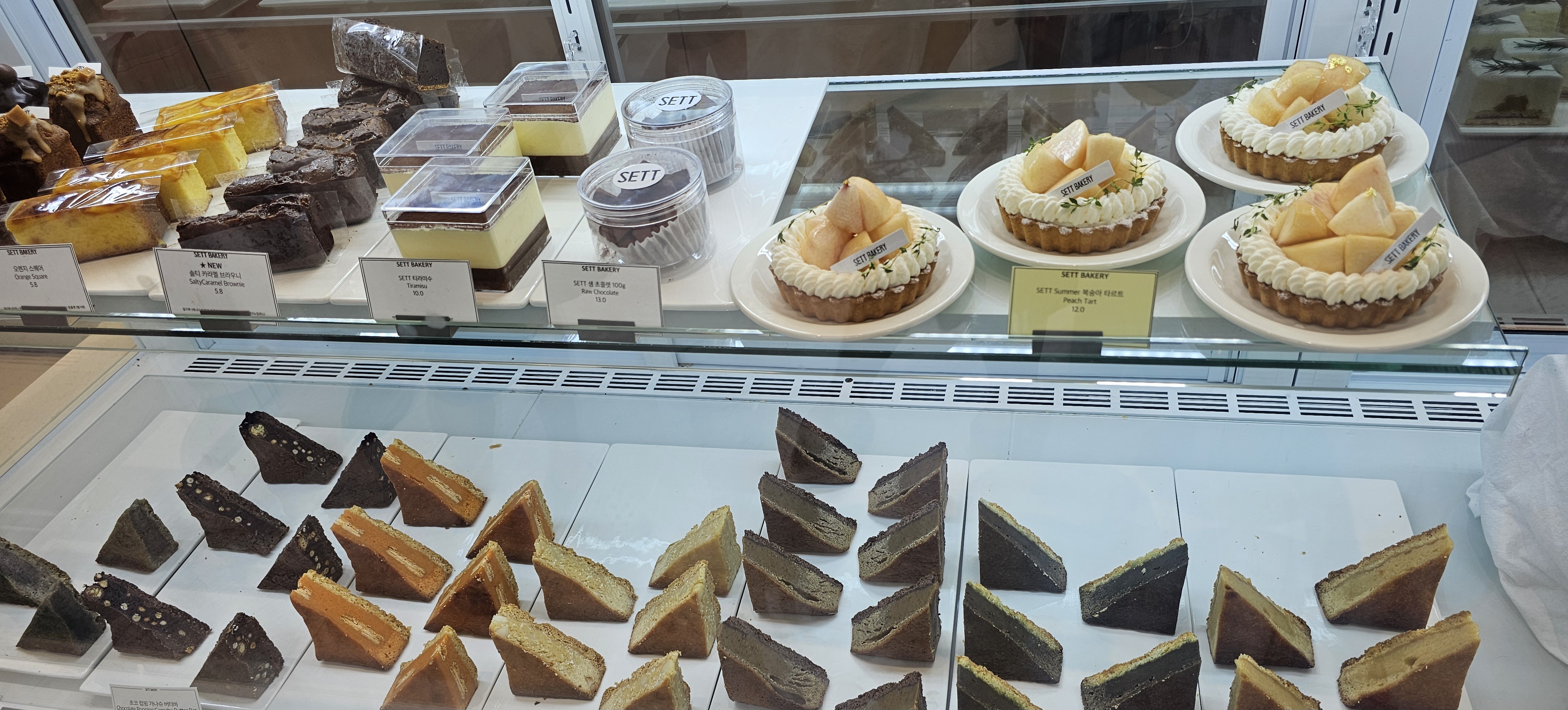 - 복숭아 생크림 타르트: 부드러운 생크림 위에 얹힌 달콤한 복숭아 슬라이스가 입안에서 사르르 녹아요. 타르트의 바삭한 식감과 함께 완벽한 조화를 이루는 디저트였어요. ‘SETT BAKERY’ 라벨이 붙어 있어 정성스러운 디저트라는 인상을 더해줍니다.