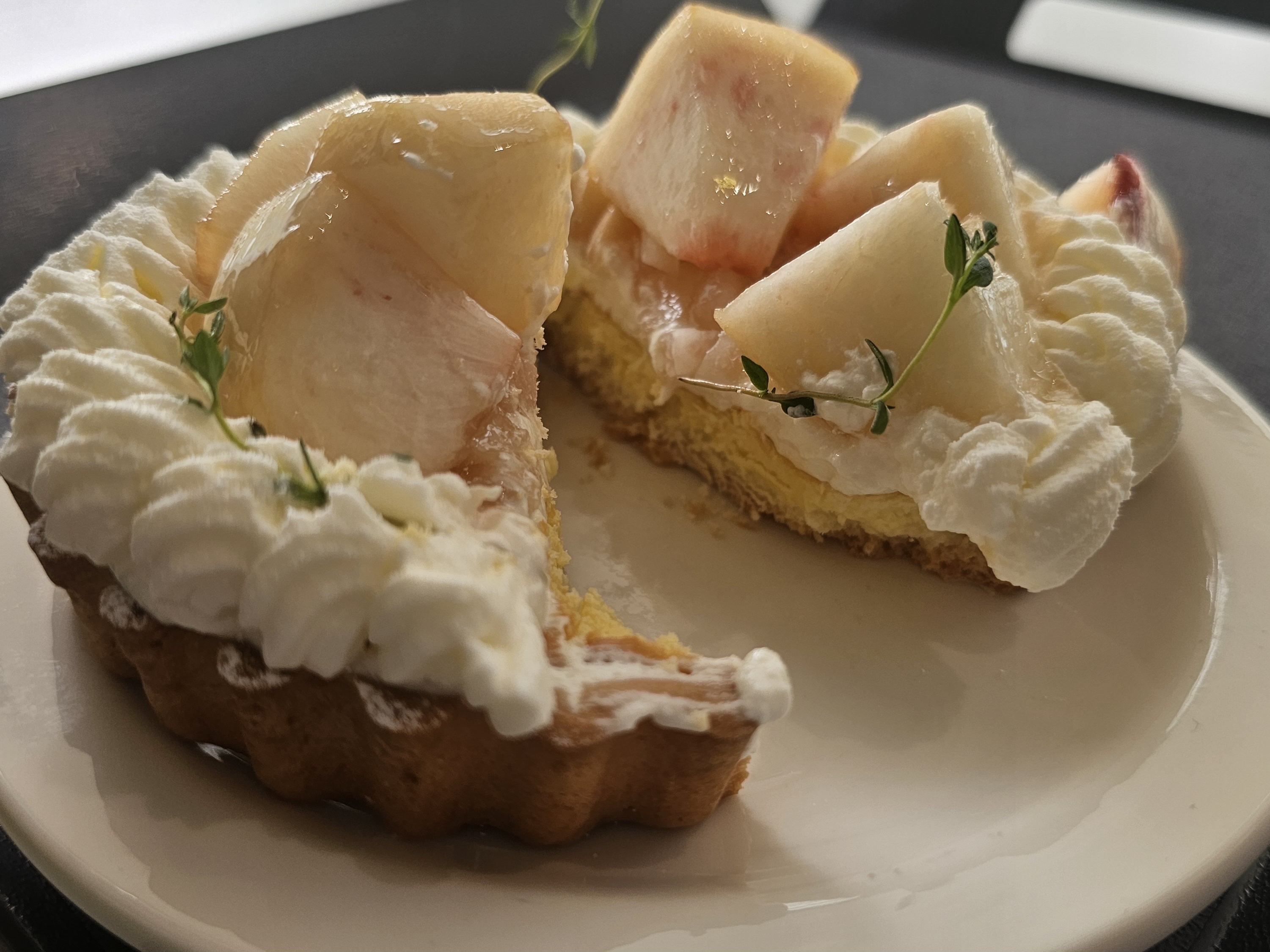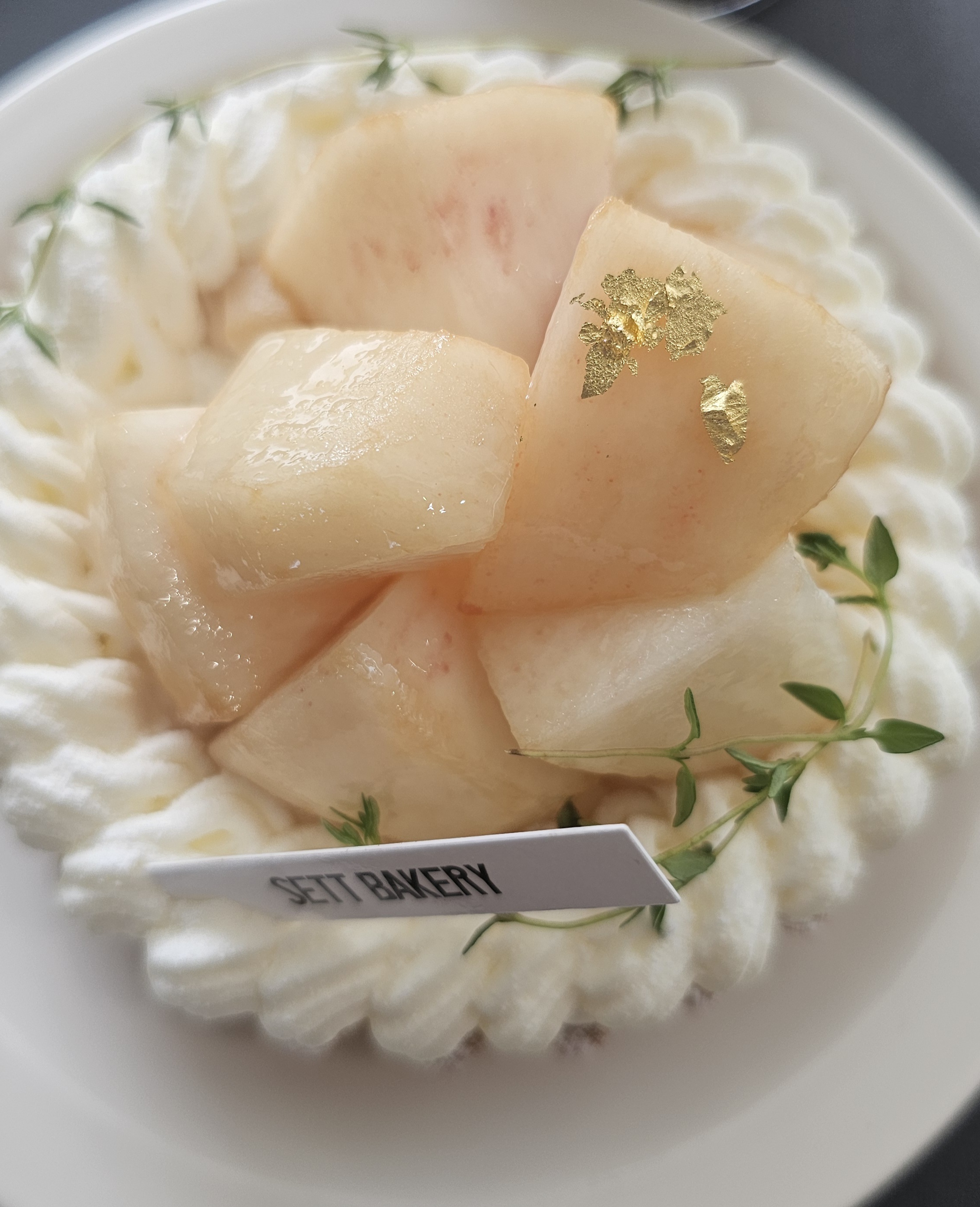 - 복숭아 생크림 타르트: 부드러운 생크림 위에 얹힌 달콤한 복숭아 슬라이스가 입안에서 사르르 녹아요. 타르트의 바삭한 식감과 함께 완벽한 조화를 이루는 디저트였어요. ‘SETT BAKERY’ 라벨이 붙어 있어 정성스러운 디저트라는 인상을 더해줍니다.