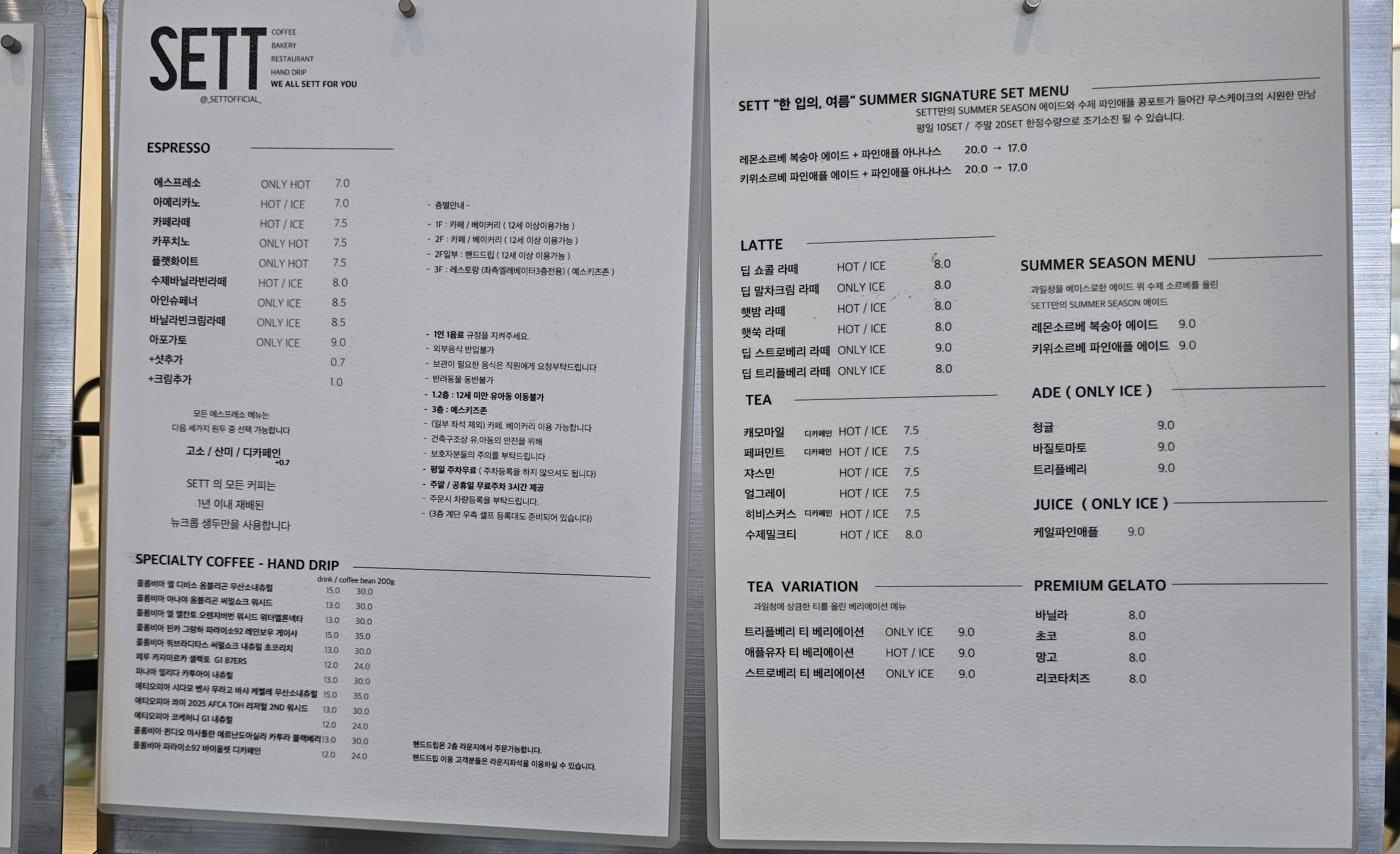 Sett는 커피와 논커피 음료, 그리고 디저트까지 메뉴 구성이 균형 잡혀 있어요. 커피는 기본적인 메뉴 외에도 원두 선택이 가능하고, 논커피 음료는 과일을 활용한 시즌 메뉴가 특히 인기예요.