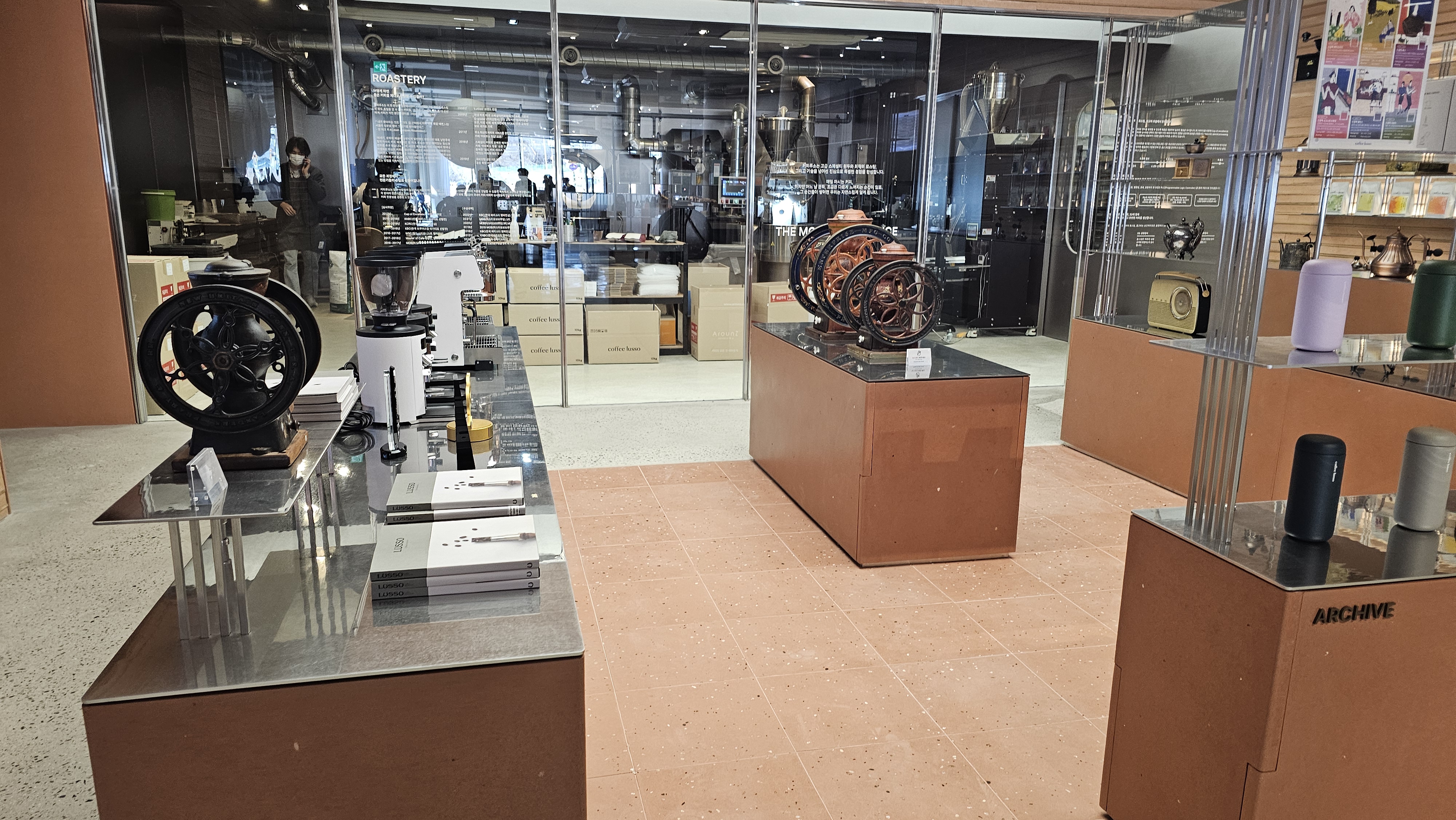 - 로스팅 장비와 다양한 커피 도구 전시, 원두 전문성 강조