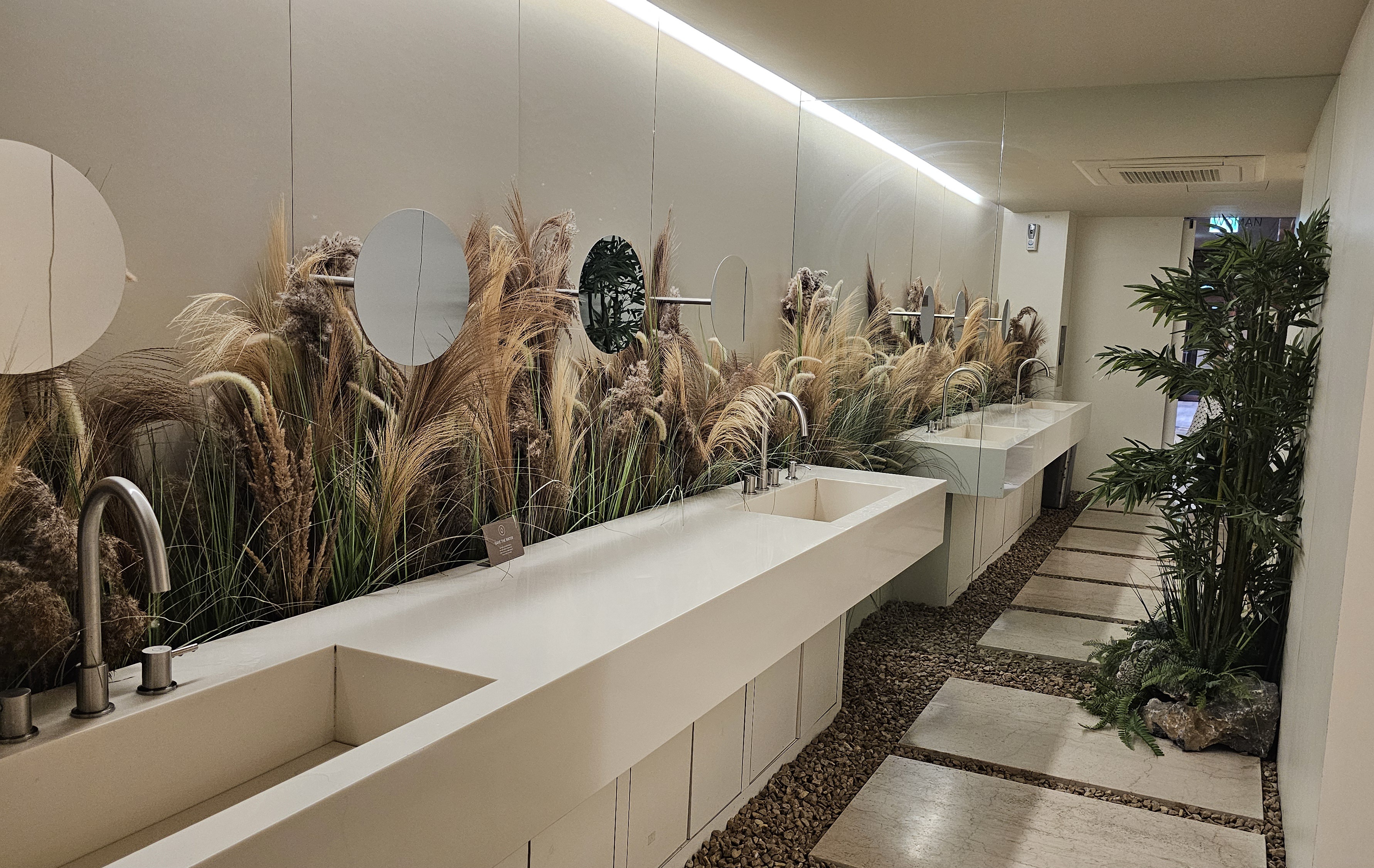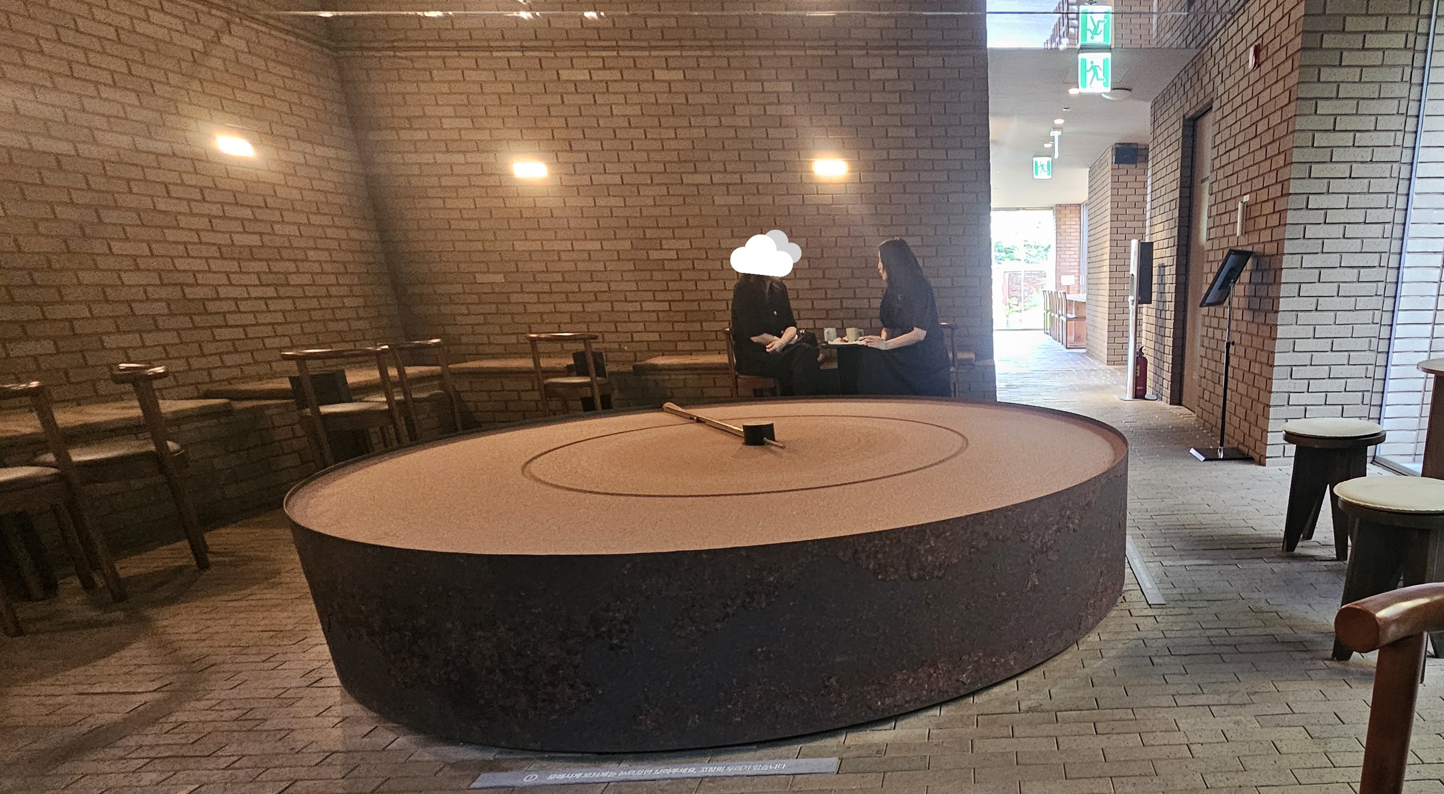 ‘세화: 흘러가는 시간’이라는 모래시계 아트 오브제가 설치되어 있어요. 천장은 거울로 되어 있어 공간이 더 넓어 보이고, 조형물과 조명이 어우러져 감성적인 분위기를 완성해줍니다.