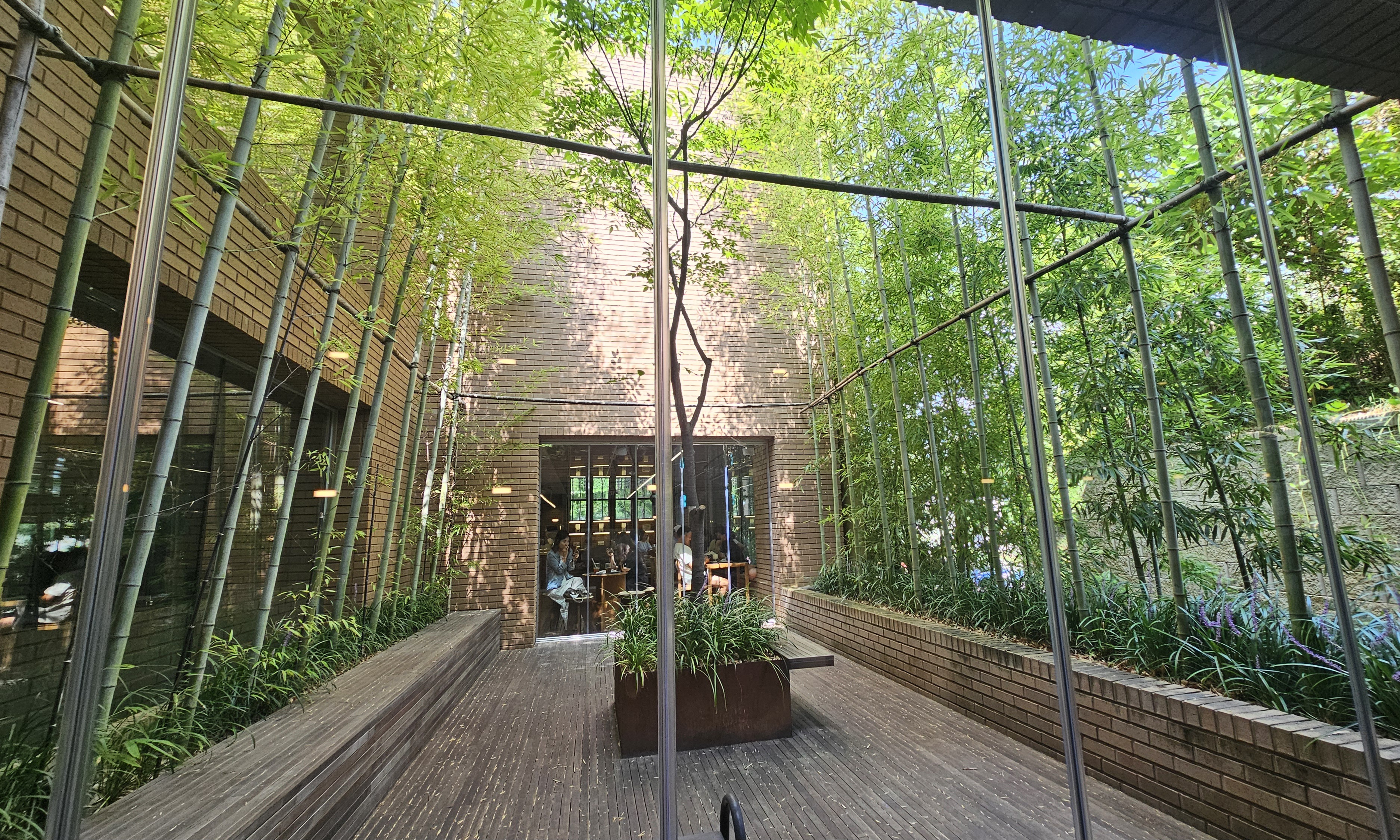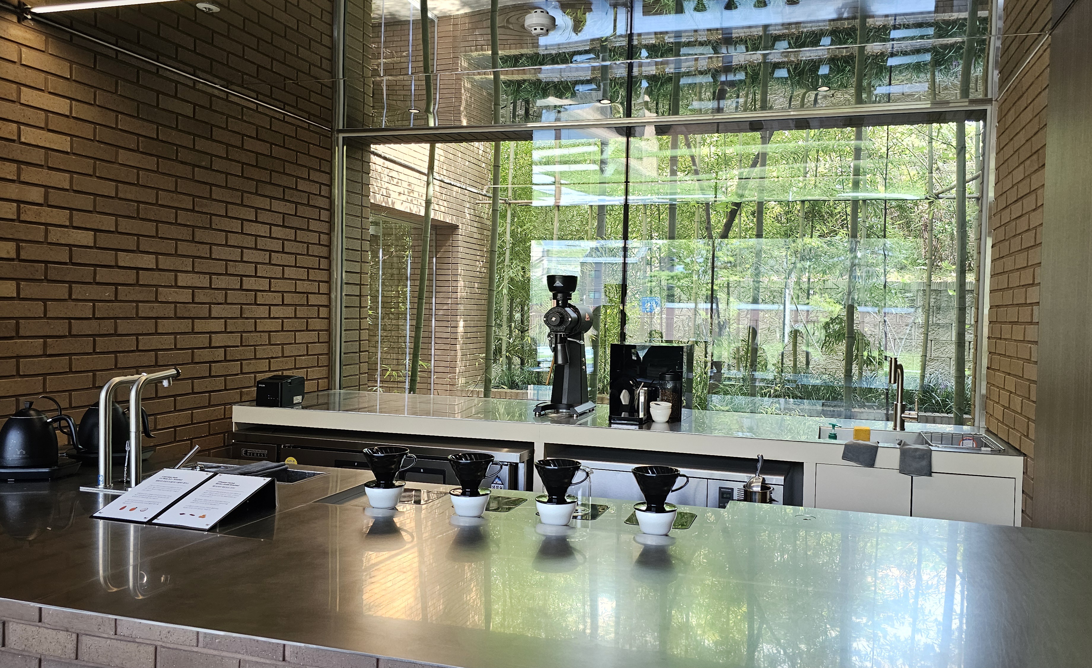경기도 용인시 수지구 성복1로 279-14에 위치해 있어요. 성복역과 가까워 대중교통도 괜찮지만, 전용 주차장과 주차요원이 상주해 있어 차량 방문이 훨씬 편리해요. 건물 외관은 브라운 톤의 벽돌과 시원한 유리창이 인상적이며, 입구 앞 수반에 비친 하늘과 대나무 풍경은 사진 찍기 딱 좋은 포토존이에요 📸