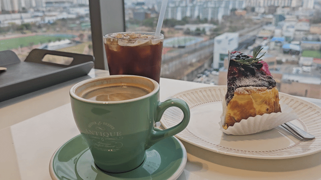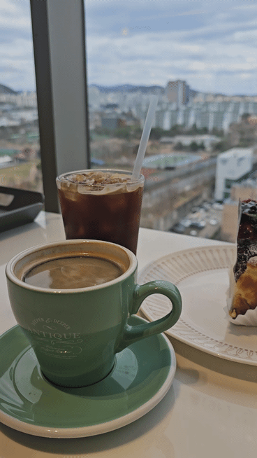 예쁜 인테리어와 화려한 디저트, 그리고 멋진 뷰까지! 앤티크커피는 단순히 커피만 마시는 공간이 아니라 눈과 입이 모두 즐거워지는 공간이었어요. 특히 시티뷰를 바라보며 즐기는 여유로운 오후는 이번 방문의 정점이었네요.