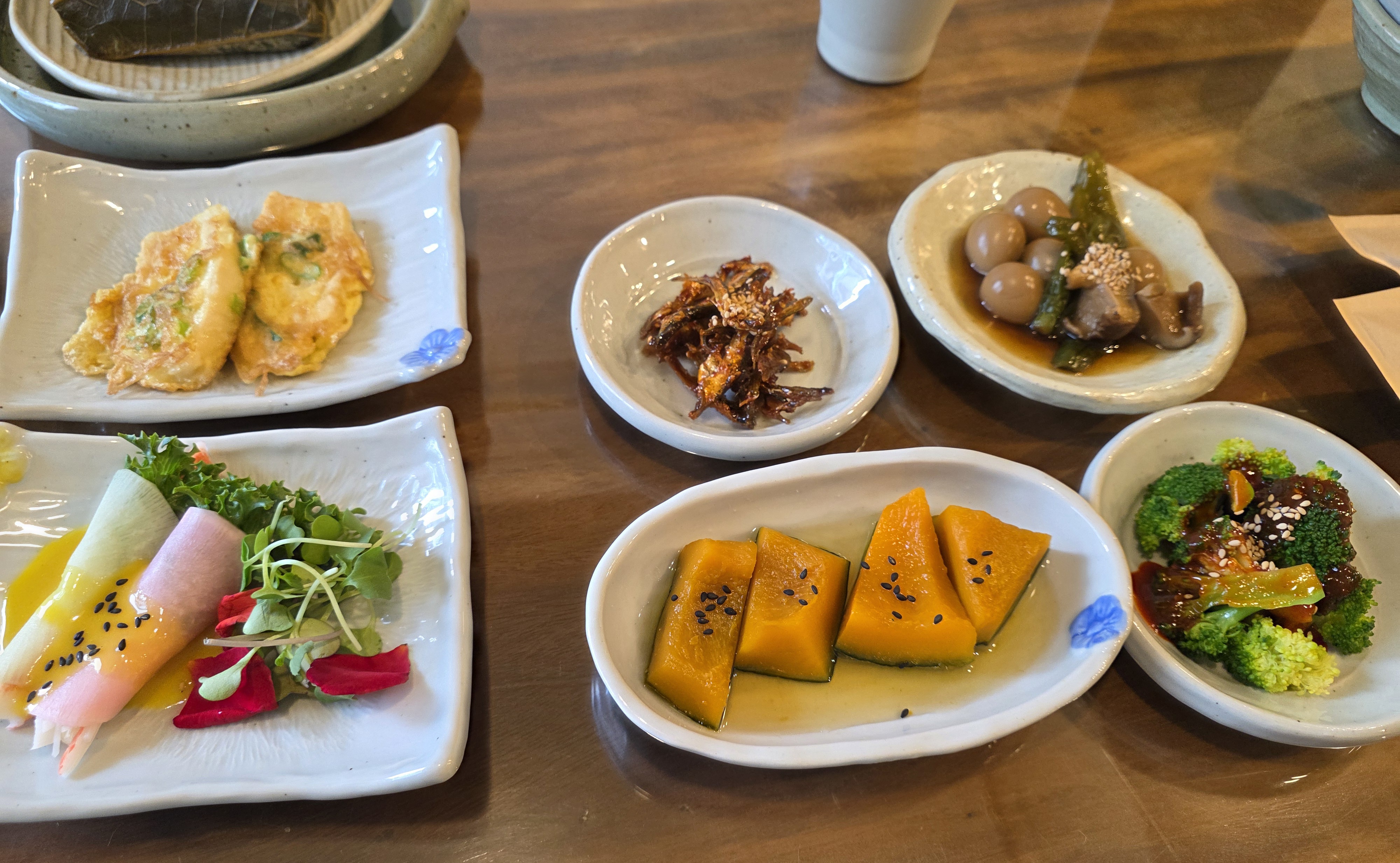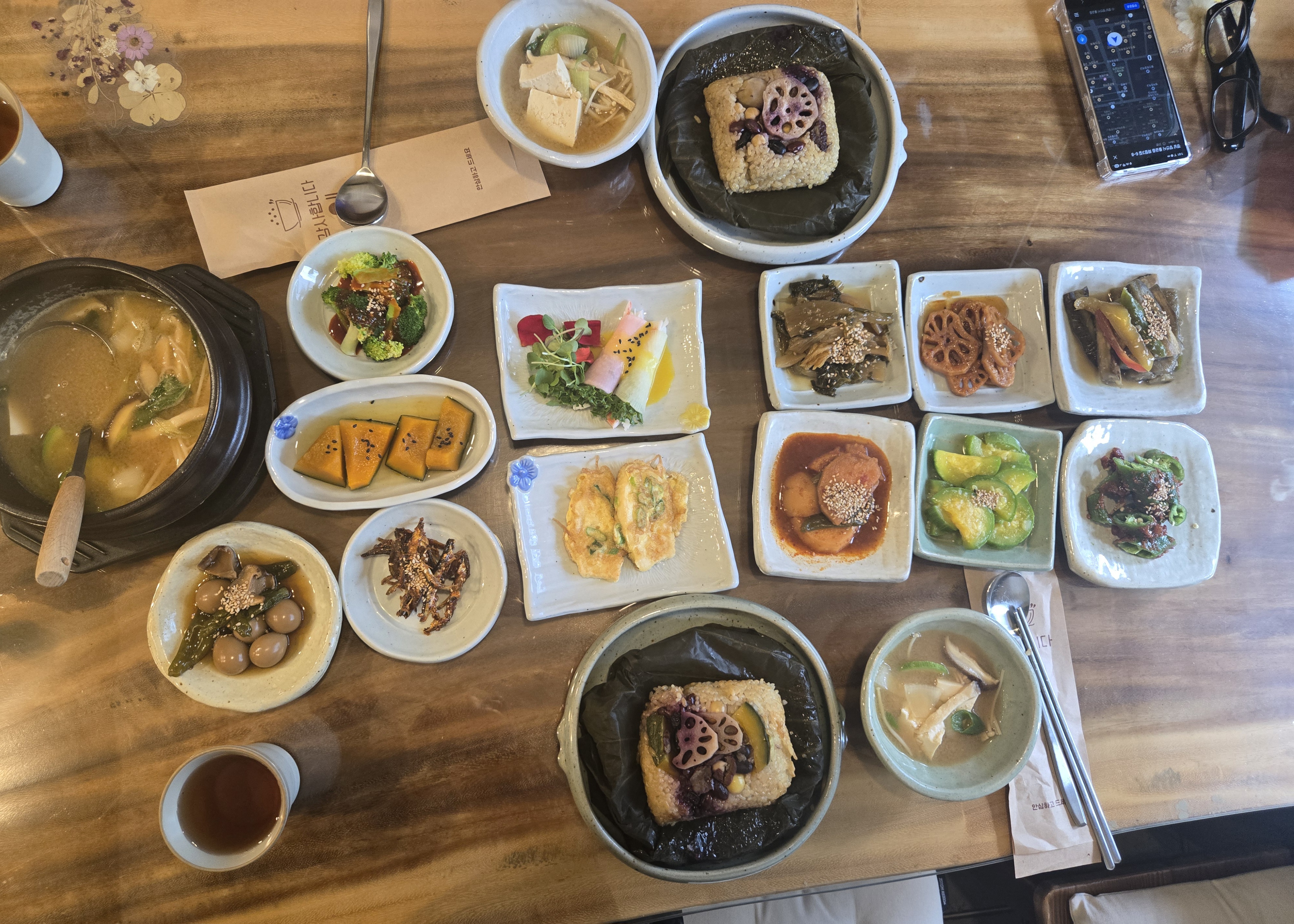 예약 시간에 맞춰 자리에 앉자 곧 정갈한 한 상이 차려졌습니다. 기본 반찬만 해도 13가지! 연근조림, 단호박조림,무쌈말이등 하나하나 손이 많이 간 반찬들이었고, 특히 간도 짜지 않고 슴슴하면서도 감칠맛이 돌아 계속 손이 가네요.