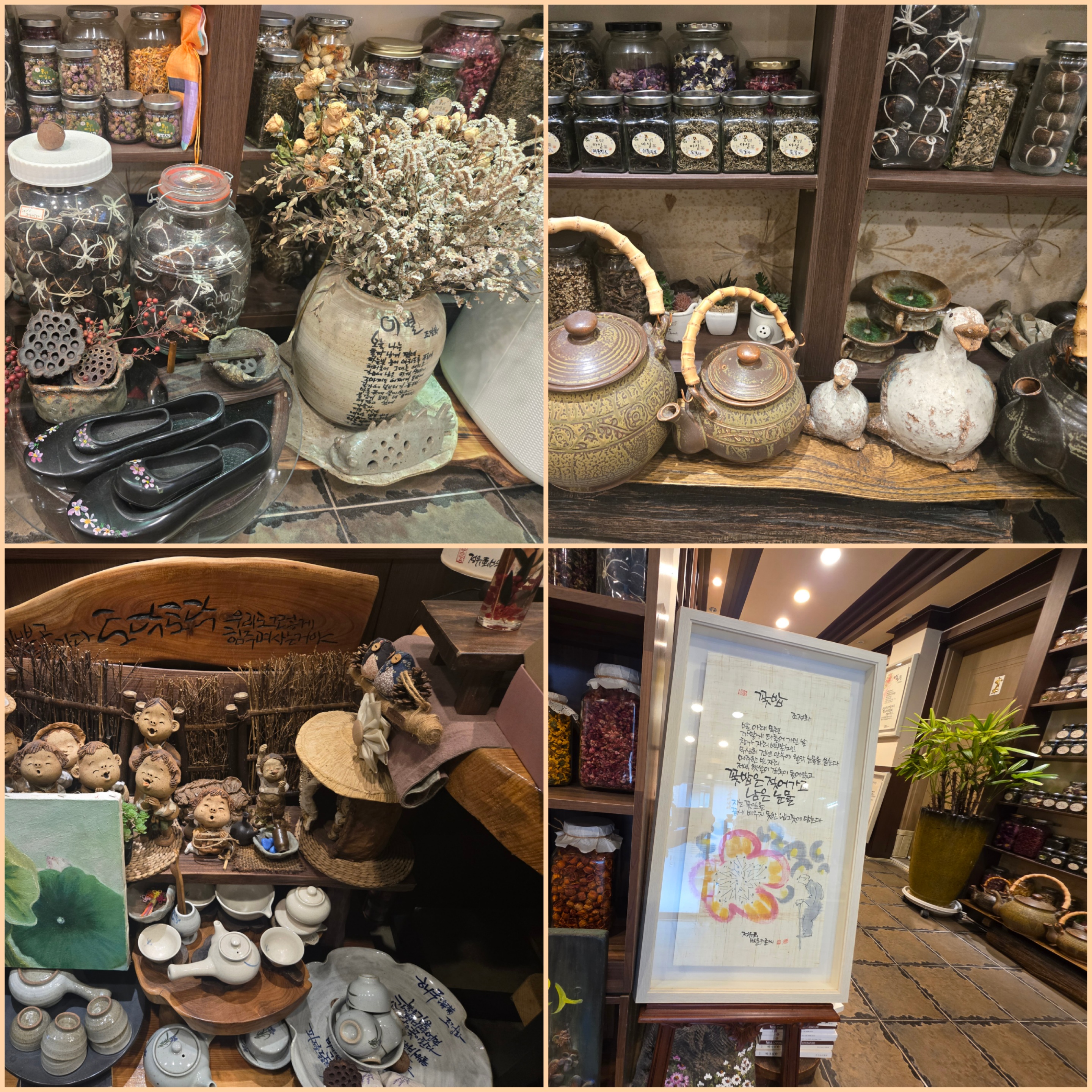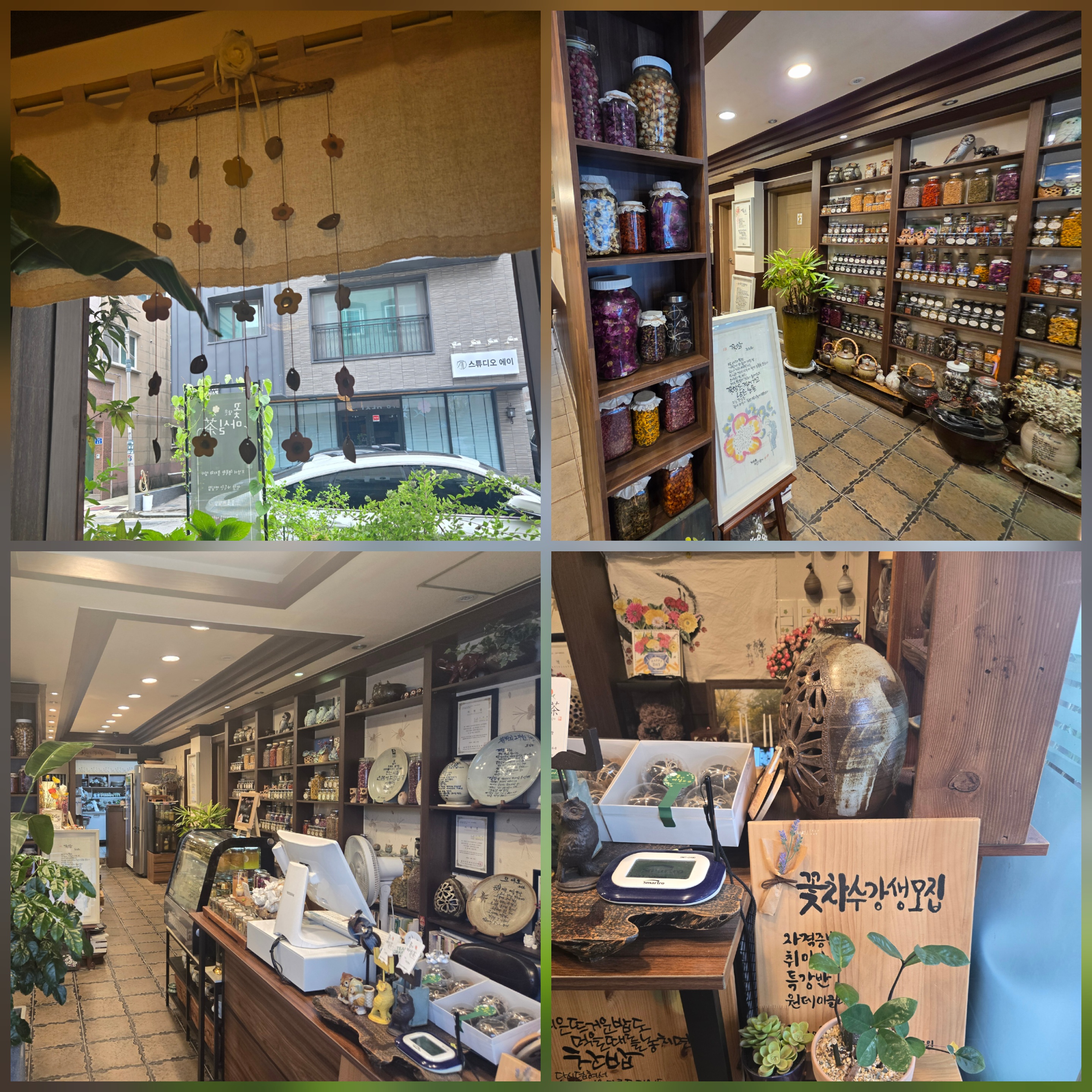 실내는 아늑하고 따뜻한 분위기로 꾸며져 있었고, 곳곳에 꽃차와 수제청이 진열되어 있어 보는 재미도 쏠쏠했답니다.