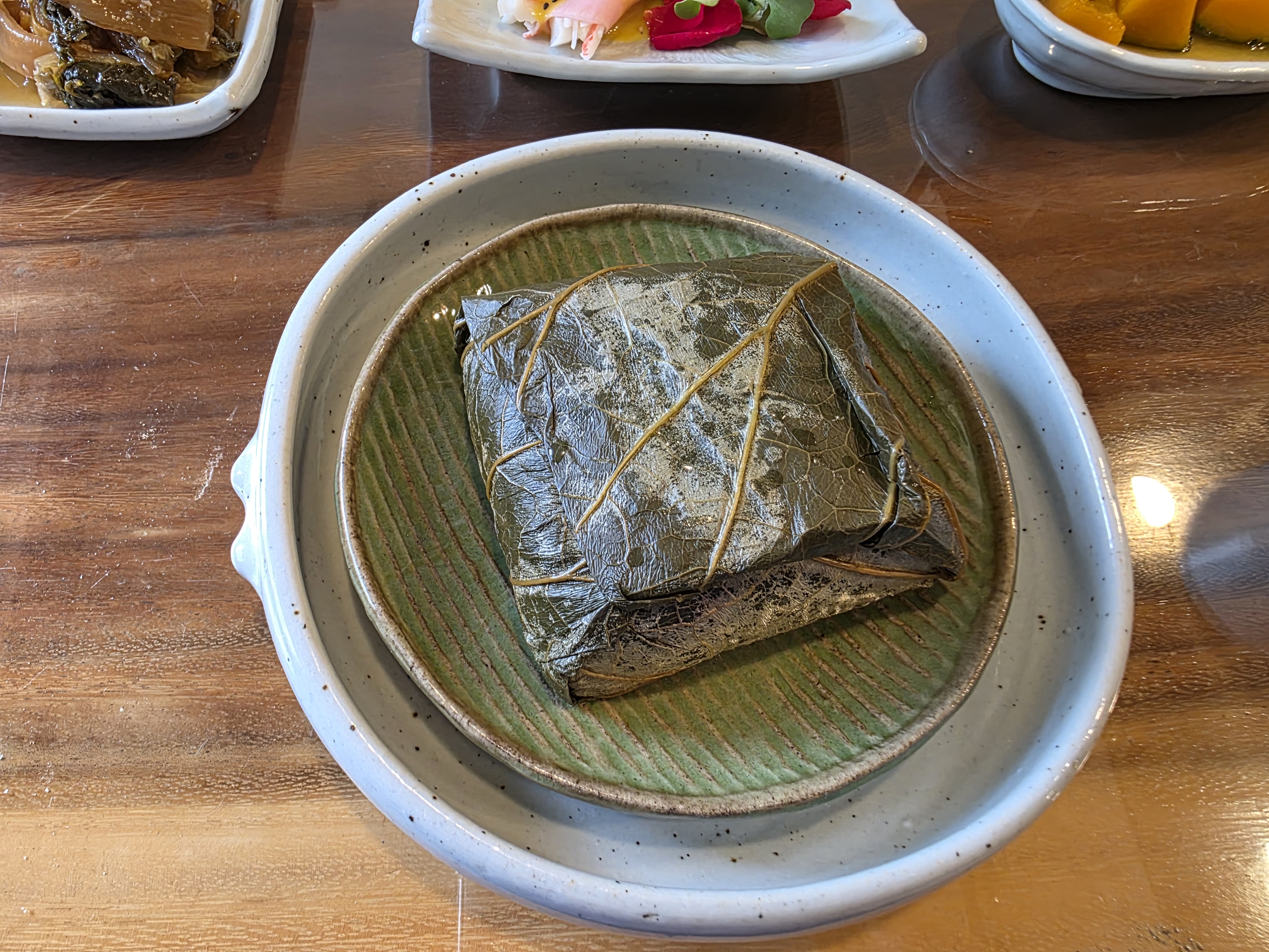 연잎을 하나하나 펼쳐내면 찰밥이 고이 싸여 있었고요. 그 안에는 대추, 밤, 콩, 호박, 연근까지 들어 있어 씹는 맛이 풍부했어요.