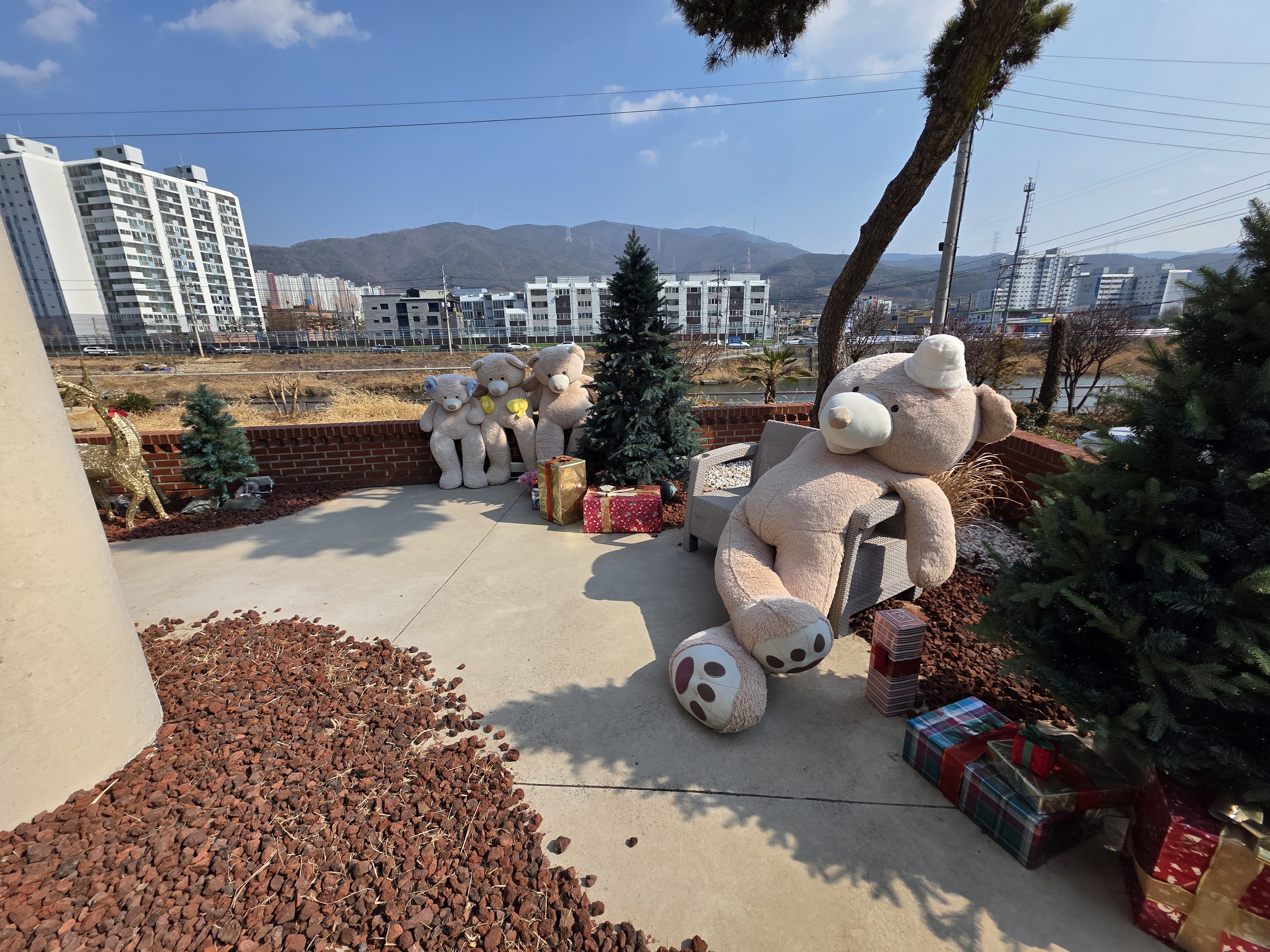 넓고 탁 트인 공간 카페에 들어서자마자 눈에 확 들어온 건 통창으로 보이는 풍경이었어요. 1층, 2층 모두 벽면이 유리창으로 되어 있어서 실내에 있어도 밖에 나온 것처럼 시원했어요. 햇살이 은은하게 들어오고, 창밖으로는 양산천이 흐르니까 마음까지 차분해지더라고요. 저녁에는 성탄 장식 불빛이 반짝여서 분위기가 더 좋았어요.
