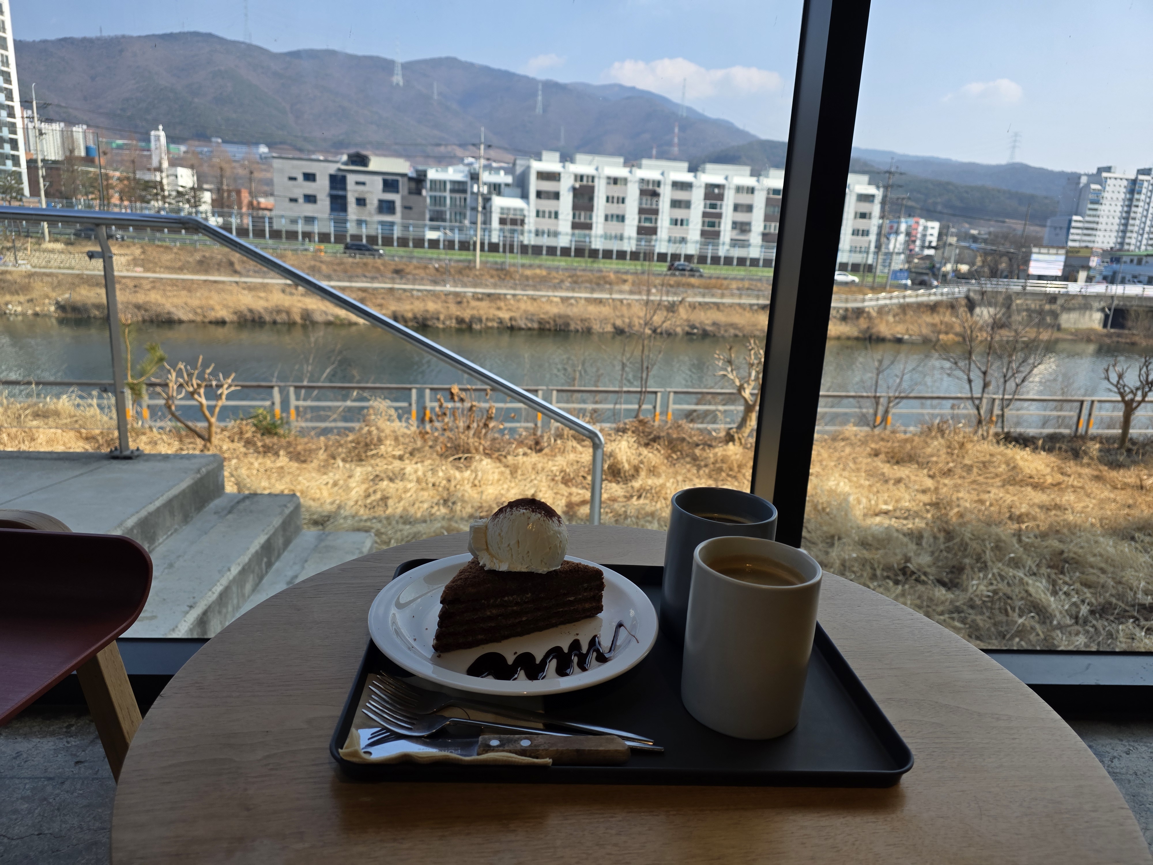 대니엘 더 카페는 좌석도 넓게 배치돼 있어서 편했어요. 특히 창가 자리는 인기 만점이라 저희도 운 좋게 앉아서 양산천을 바라보며 여유로운 시간을 보냈어요.