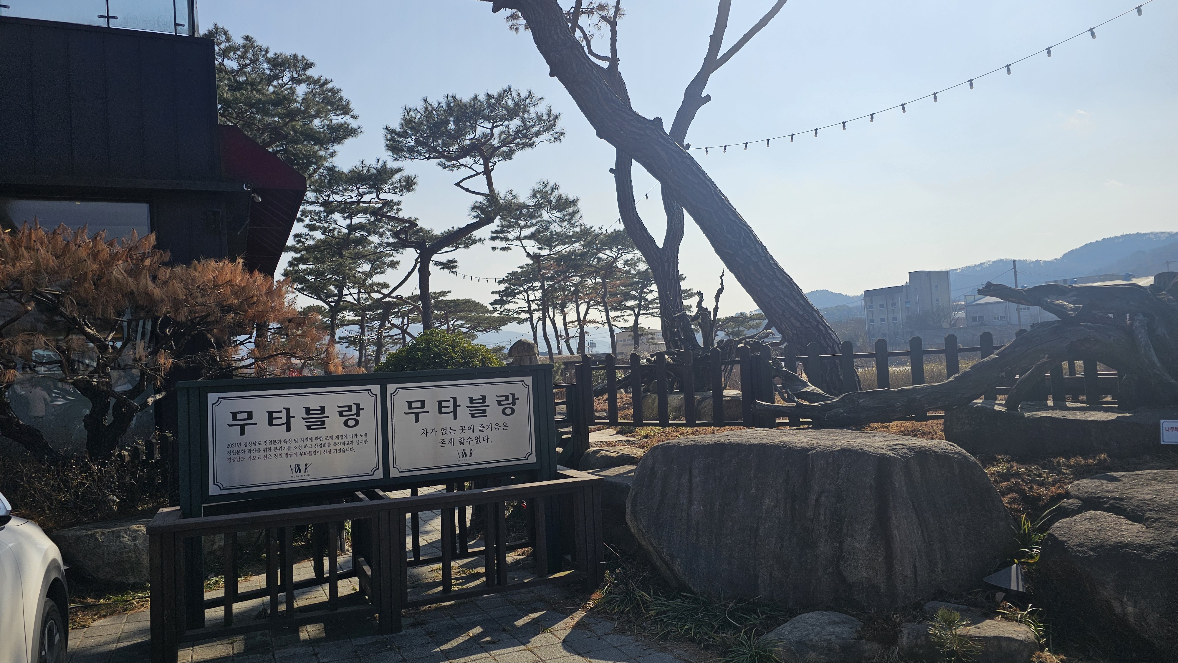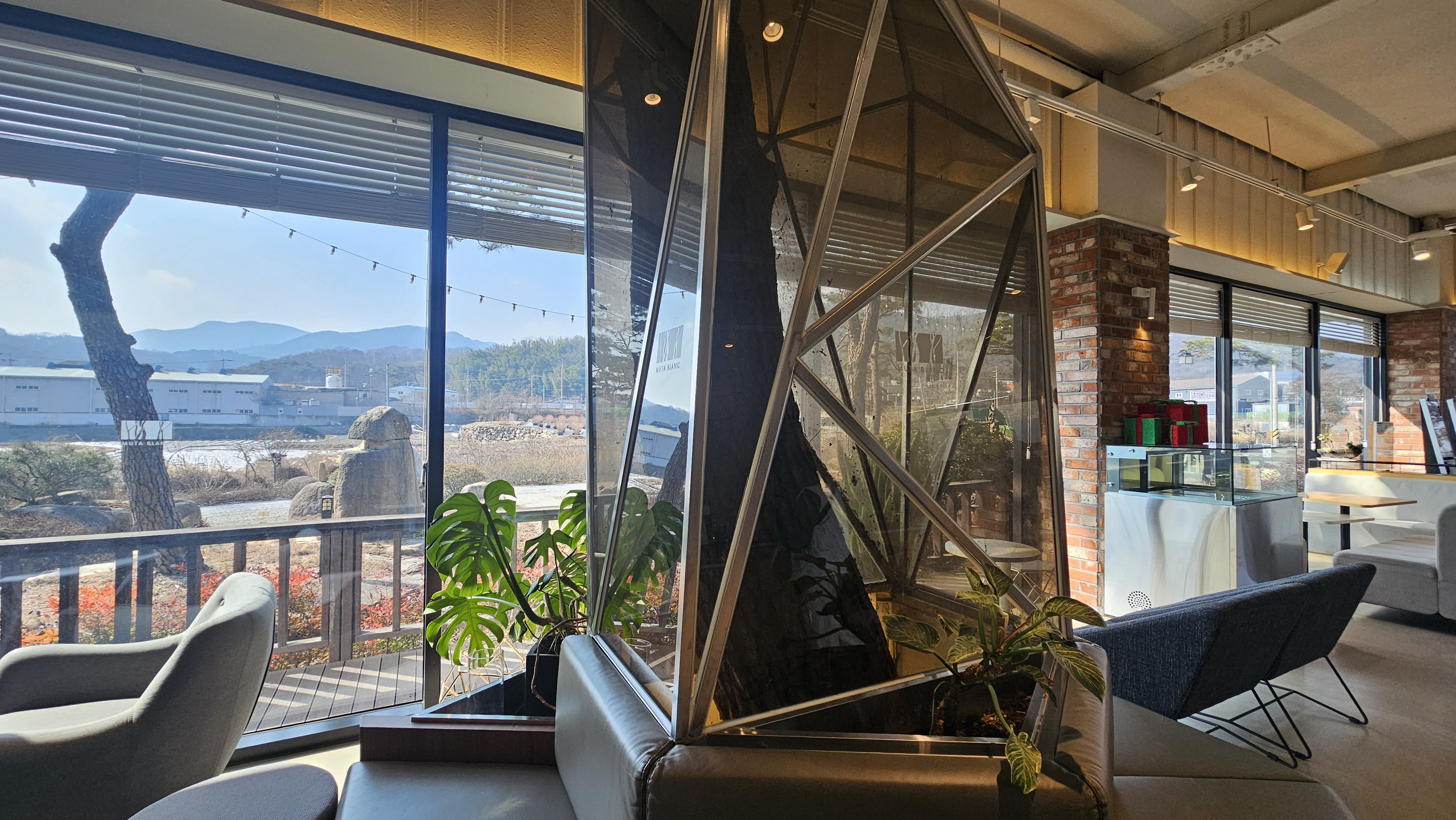 무타블랑은 자연과 건축, 맛과 감성이 어우러진 대형 힐링 공간이에요. 120년 된 소나무를 그대로 살려 건물을 설계해 자연 친화적인 분위기를 자랑하고, 실내는 통유리창으로 햇살과 정원이 한눈에 들어와요. 야외에는 4,200평 규모의 정원이 펼쳐져 있어 산책하기에도 좋구요.