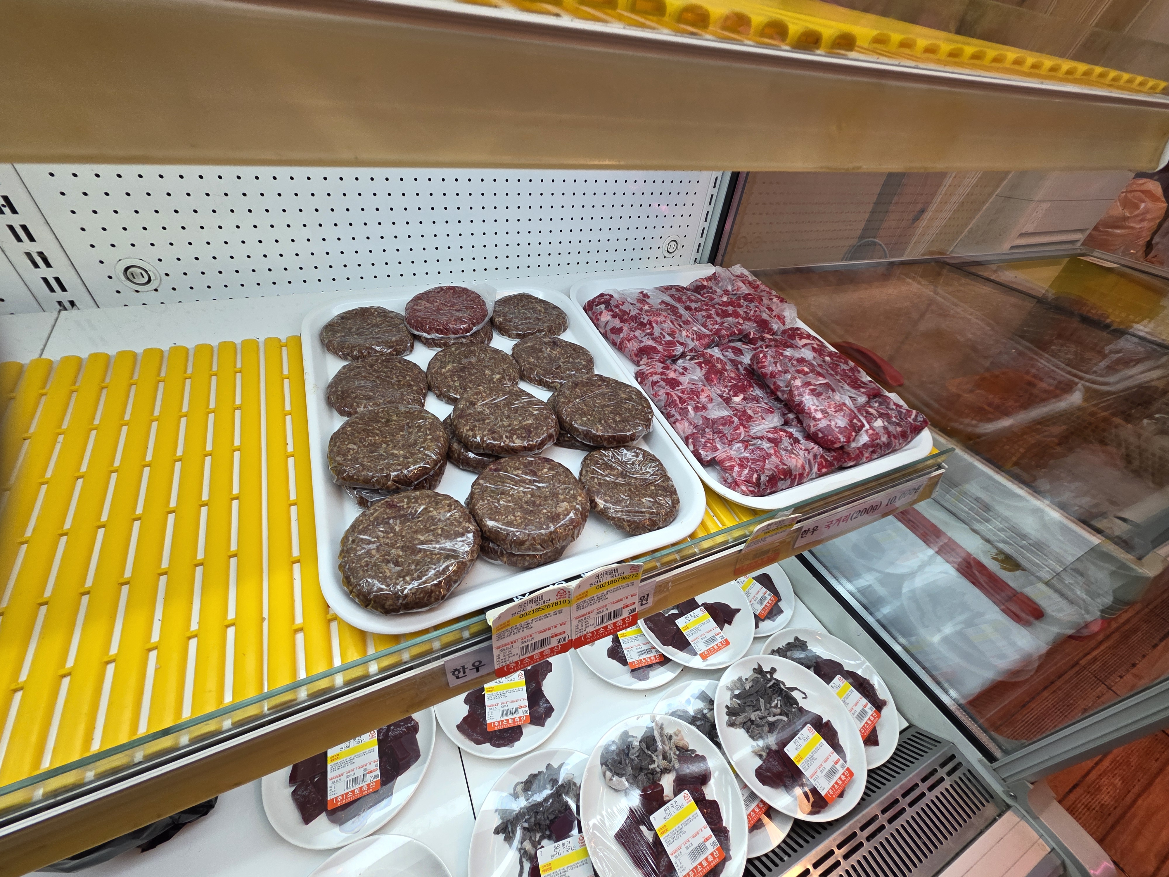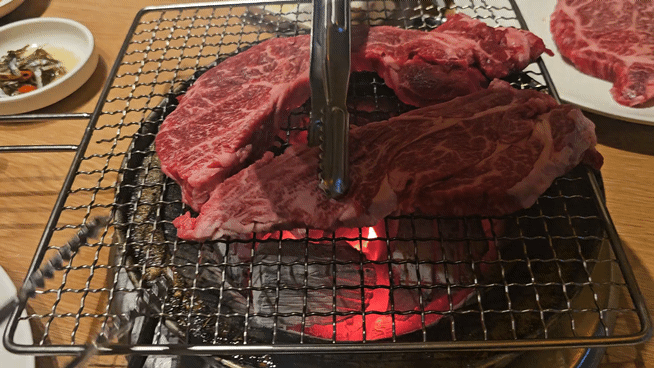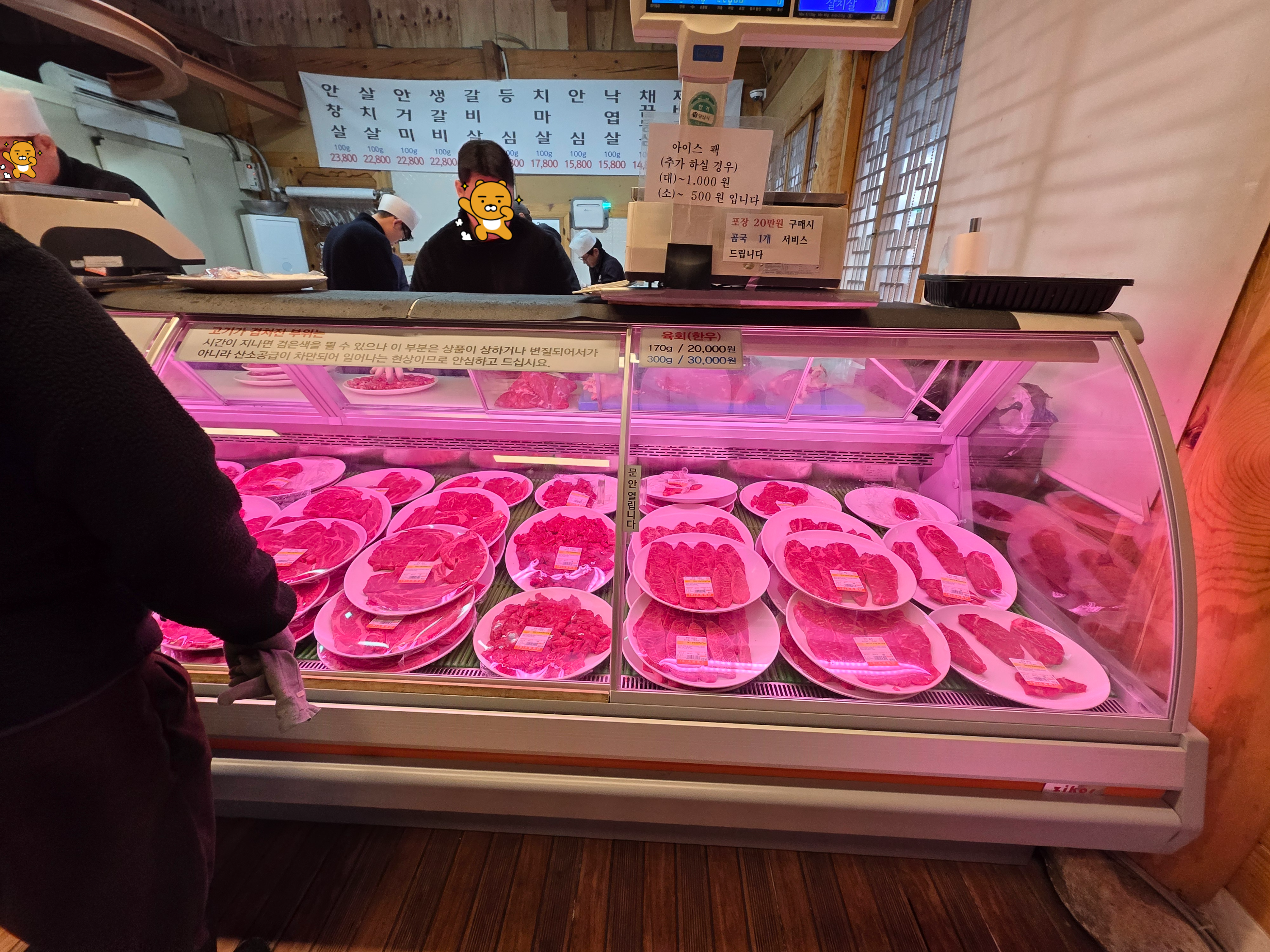먼저 정육 코너에서 원하는 부위를 직접 고른 뒤 계산을 하고 테이블로 가져와 구워 먹는 방식이었어요. 이렇게 바로 판매장에서 나온 신선한 고기를 맛볼 수 있다는 점이 큰 장점이었어요.